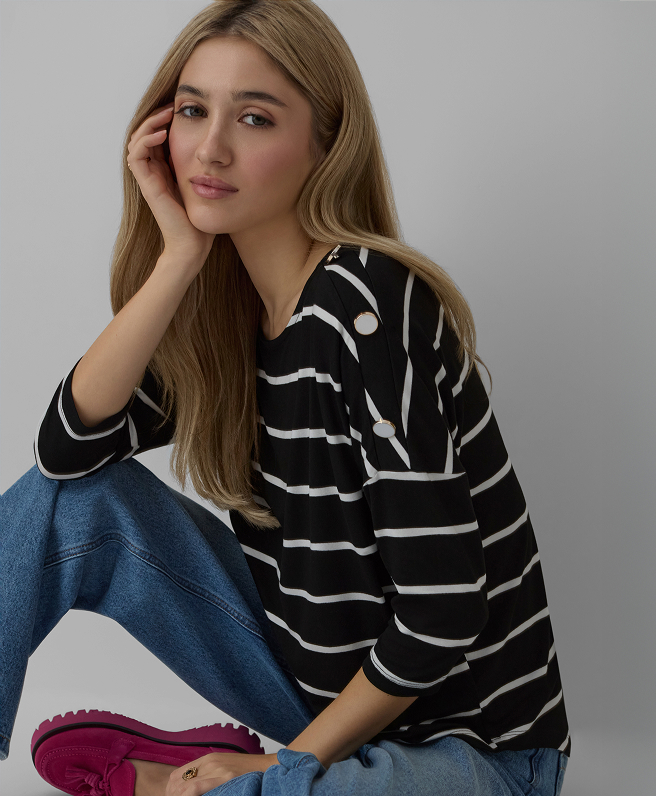 Naujoje kolekcijoje taip pat rasite elegantiškus marškinius ir megztinius su nesenstančiais dryžuotais raštais. Ar rinksitės megztinį, ar laisvesnio modelio kardiganą su dekoratyvinėmis sagomis? Renkatės jūs! Pasisemkite įkvėpimo ir susikurkite tobulą derinį, kuris geriausiai atskleis jūsų individualų stilių.