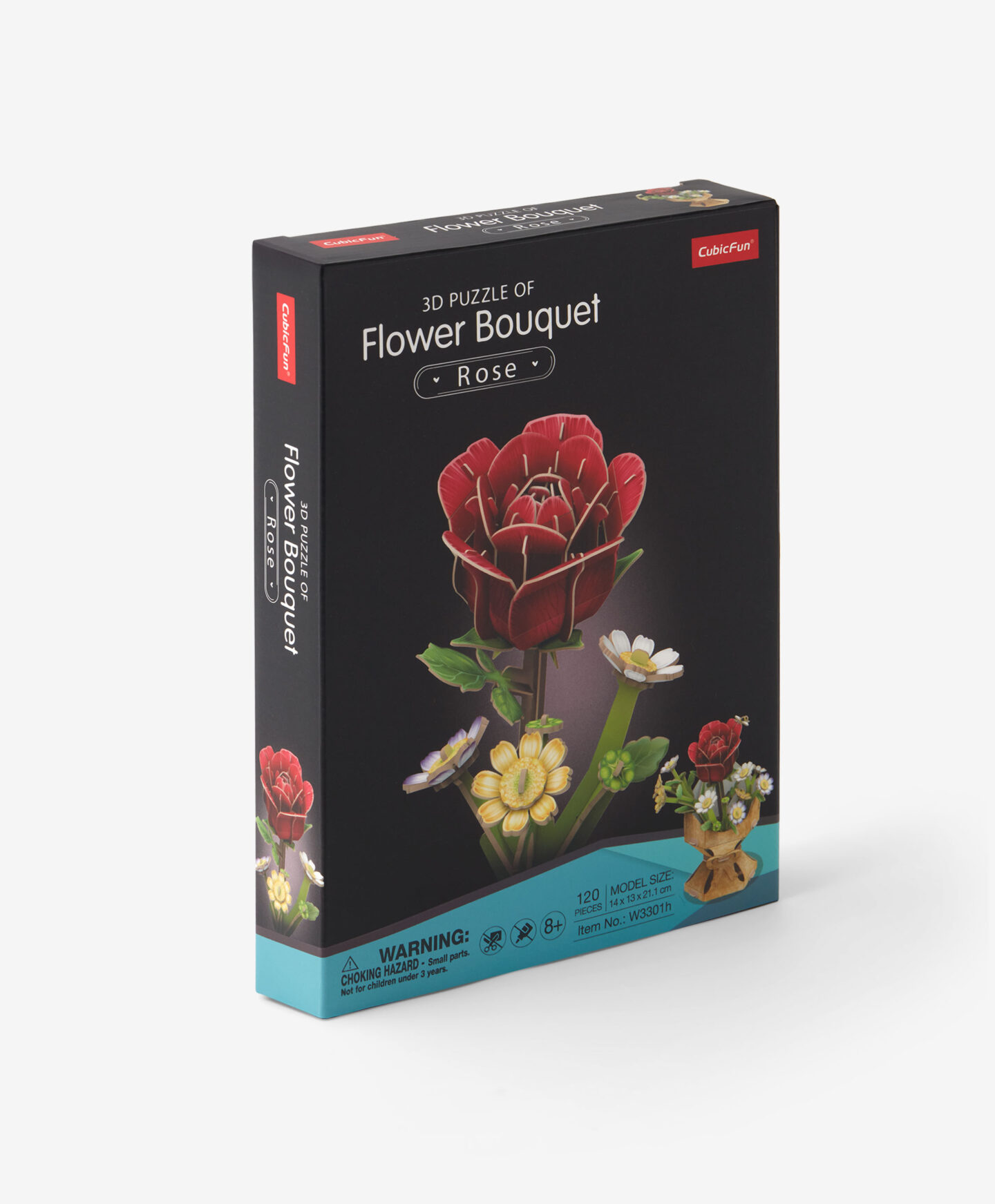 3D dėlionė puokštė su rože – tai kompozicija su tamsiai raudona rože, kurios spalvos gylis suteikia visumai elegancijos. Atskiri elementai dera tarpusavyje, kad būtų atkurtos tikroviškos žiedlapių ir žalių lapelių formos. Medinis elementas stabilizuoja konstrukciją ir suteikia galutinį efektą, kuris džiugina kaip puošmena.