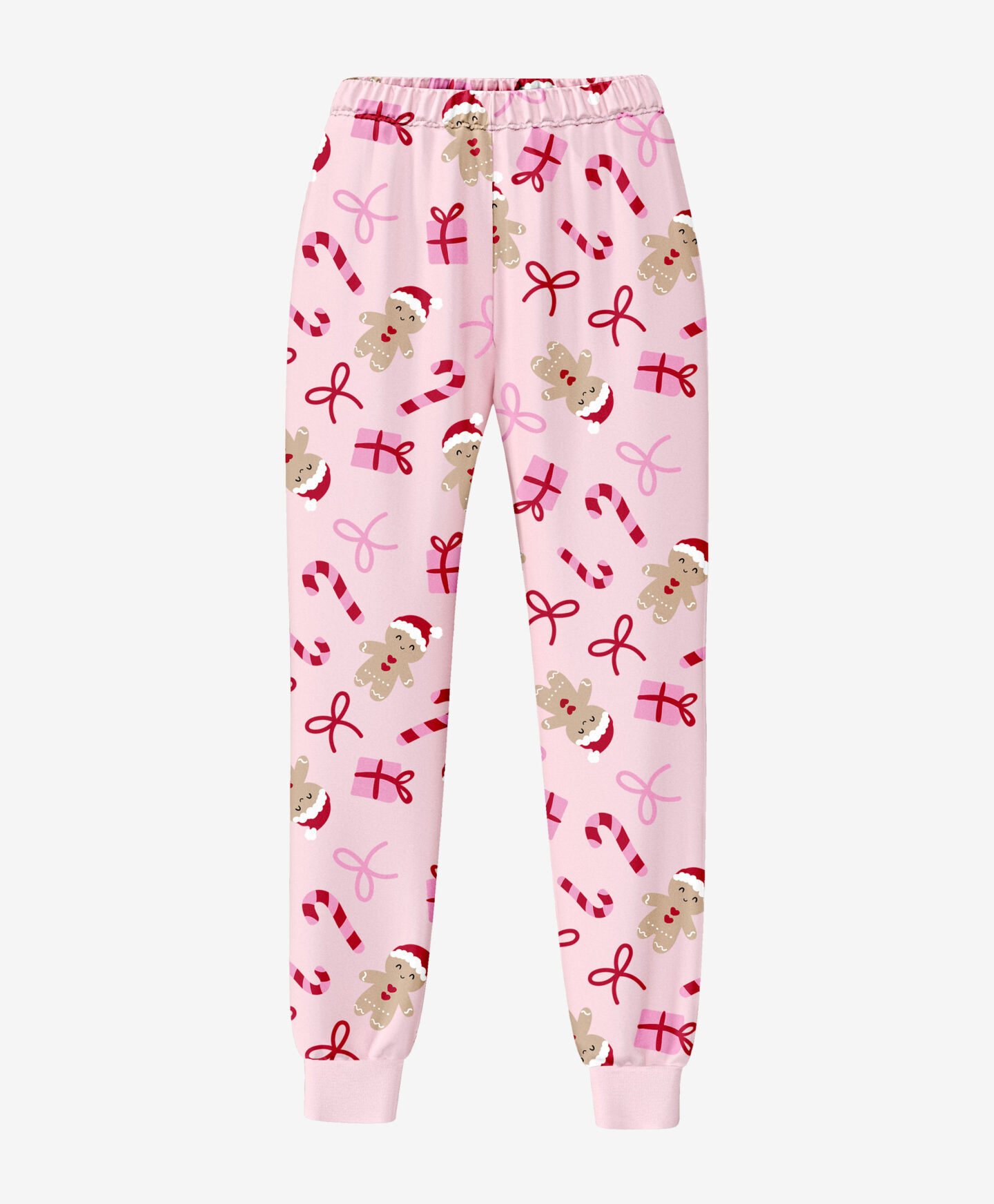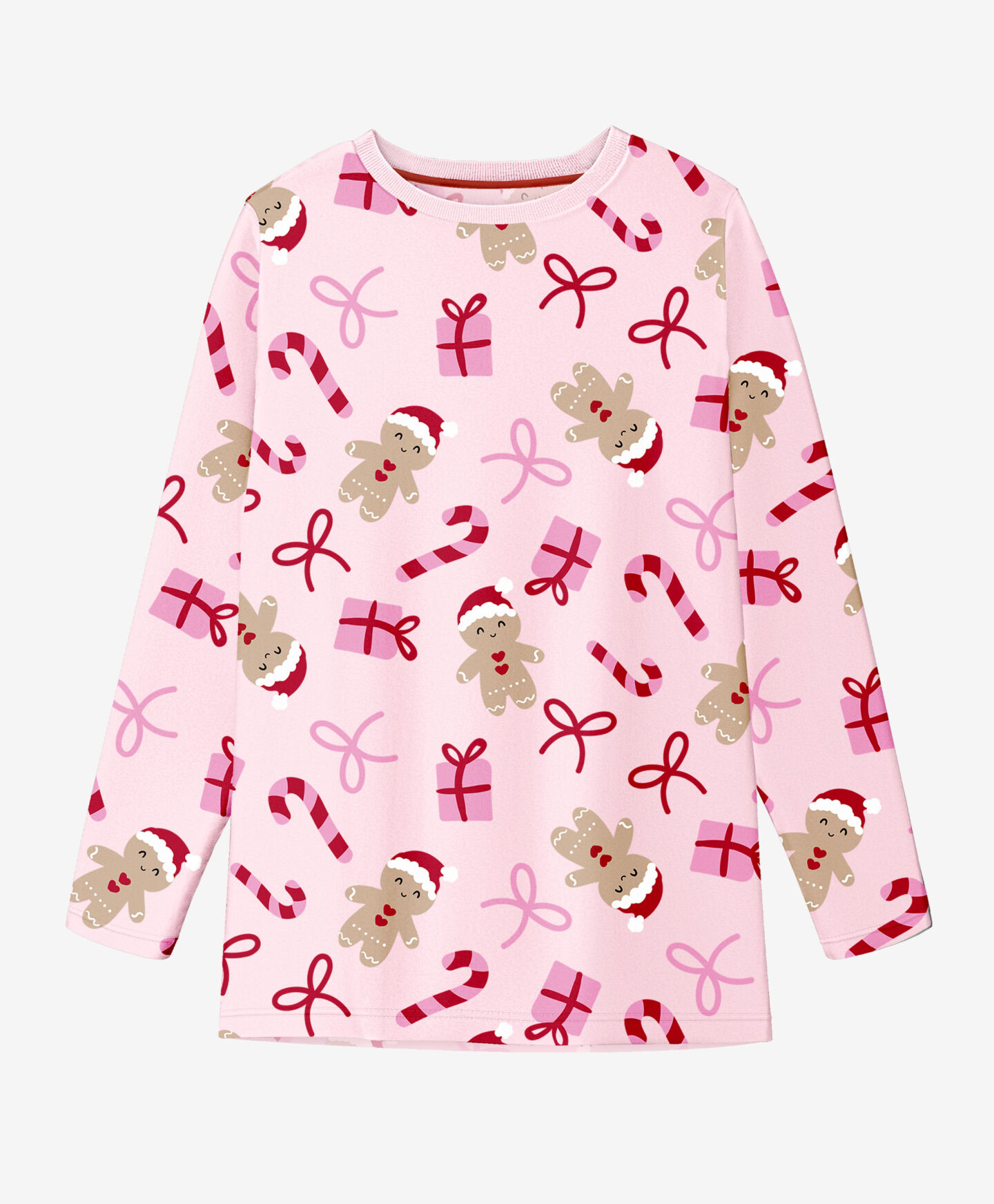 Aksominė pižama su šventišku meduolių, dovanų ir kaspinėlių raštu – tai puiki dovanos idėja. Komplektą sudaro marškinėliai ilgomis rankovėmis ir kelnės iš minkšto ir šilto aksomo, todėl jis puikiai tinka žiemos naktims.