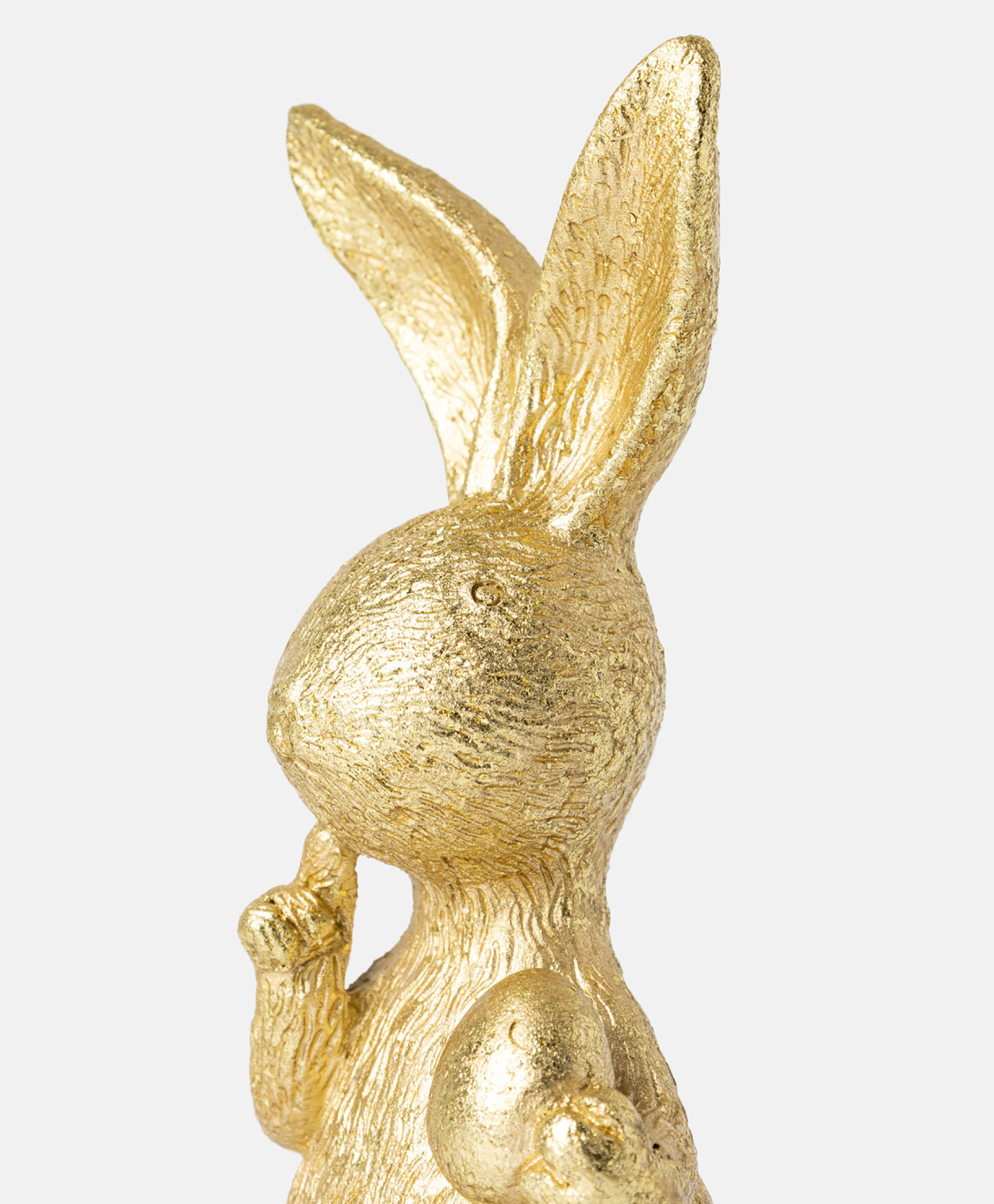 Aukso spalvos kiškutis su kiaušiniu, pagamintas iš poligumos, atkreipia dėmesį savo subtilia elegancija. Poliguma yra lengva ir patvari medžiaga, atspari laikui ir oro sąlygoms, todėl figūrėlė išlieka ilgaamžė. Šis kiškutis puikiai tinka ieškantiems subtilių, skoningų akcentų. Galimi įvairūs dizainai.