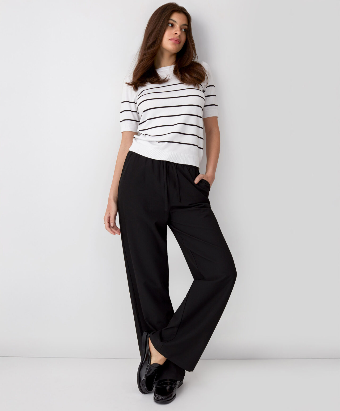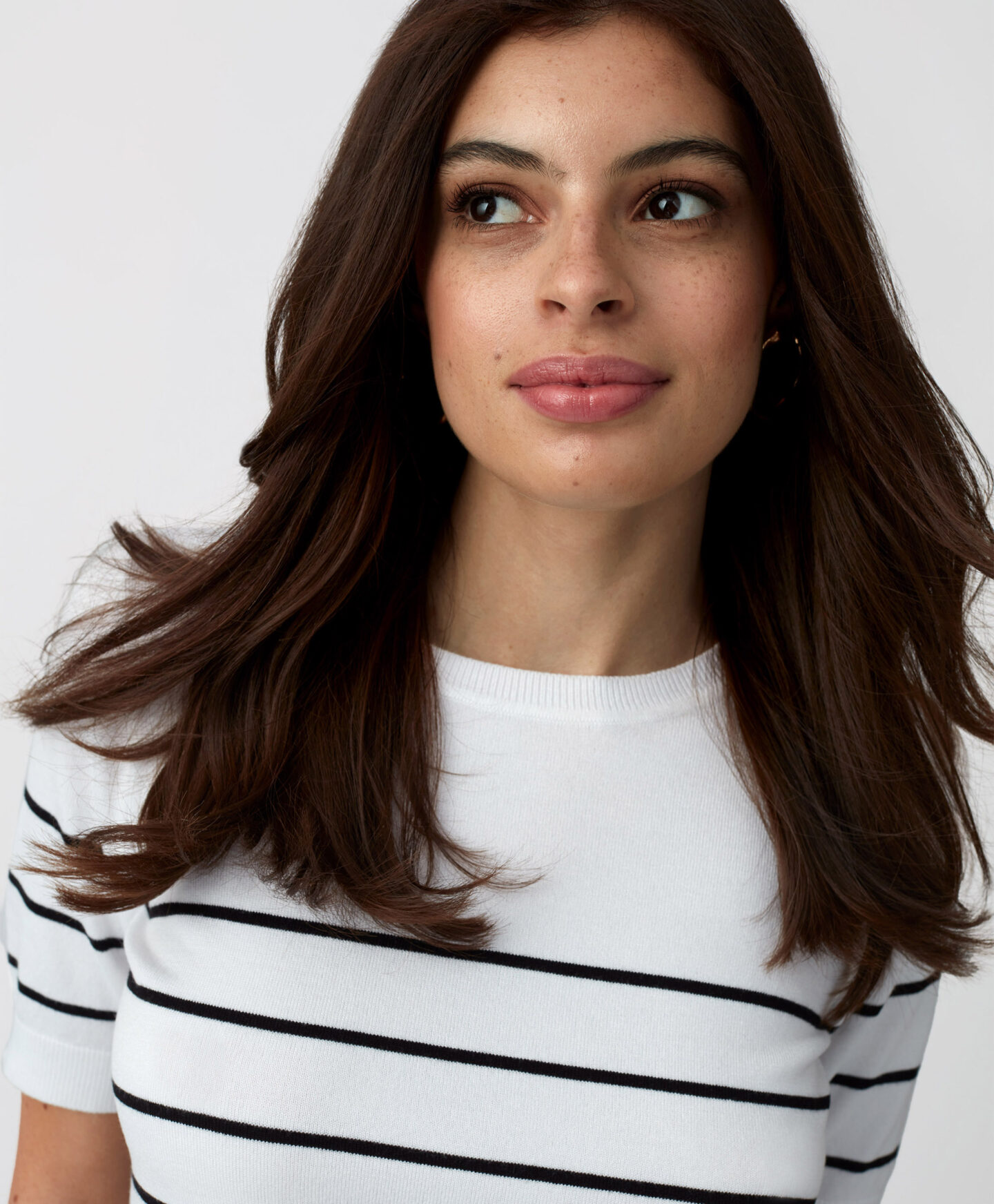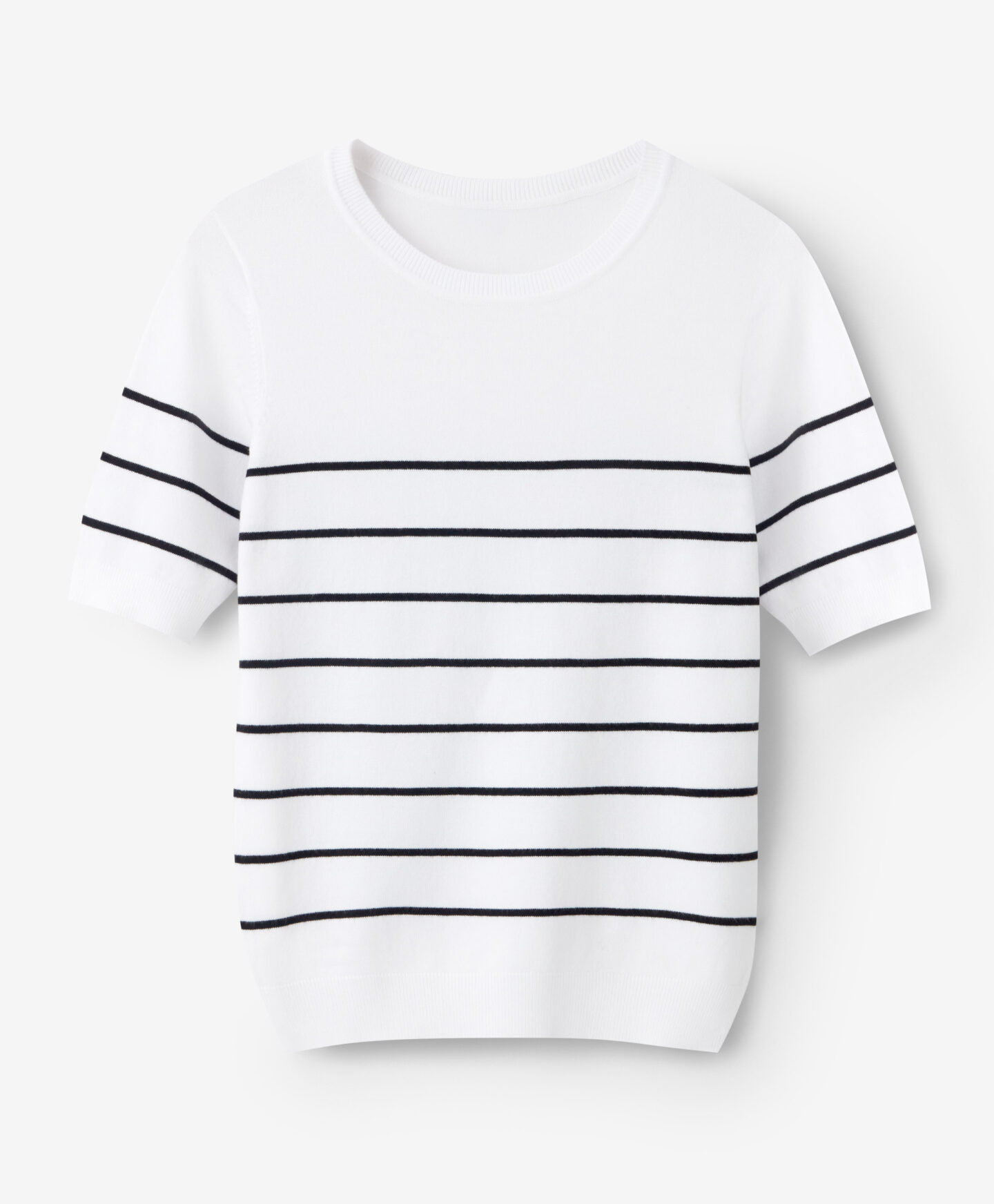 Baltas dryžuotas megztinis su viskoze – puikus pasirinkimas vertinantiems eleganciją ir patogumą. Pasiūtas iš aukštos kokybės medžiagų, jis yra minkštas liesti ir patogus dėvėti. Dėl klasikinio dryžuoto rašto ir šviesių spalvų megztinis puikiai tinka tiek kasdieniam, tiek elegantiškesniam stiliui.
