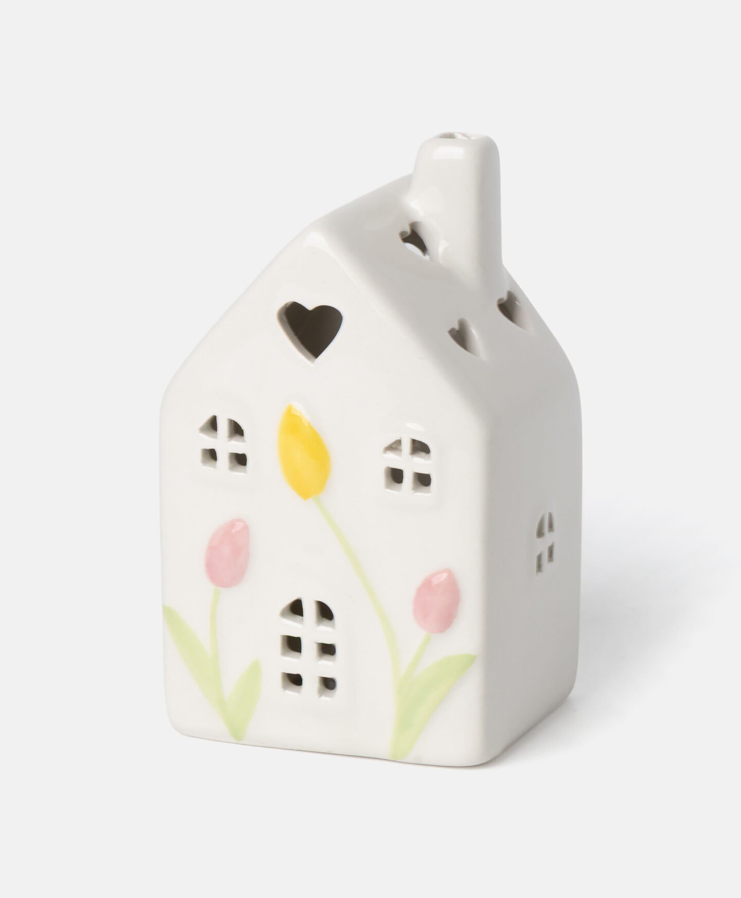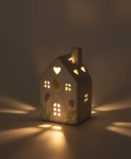 Baltas namelis su LED lemputėmis ir su gėlių raštais – tai nuotaikinga dekoracija, skleidžianti švelnią, subtilią šviesą. Jo pastelinės spalvos ir pavasario motyvai suteikia gaivos ir lengvumo bet kokiam interjerui. Namelis puikiai atrodo ant virtuvės stalviršio, svetainės lentynoje ar šalia vaiko lovos. Galimi įvairūs dizainai.