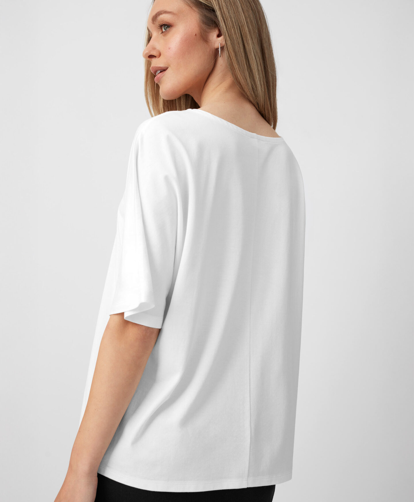 Balti marškinėliai su raukinukais yra klasikinis ir stilingas pasirinkimas. Dėl elegantiško modelio ir raukinukų vienoje pusėje jie puikiai išryškina siluetą. Puikiai tinka įvairioms progoms – nuo kasdienių išvykų iki šventinių susitikimų. Galima rinktis iš dviejų spalvų.