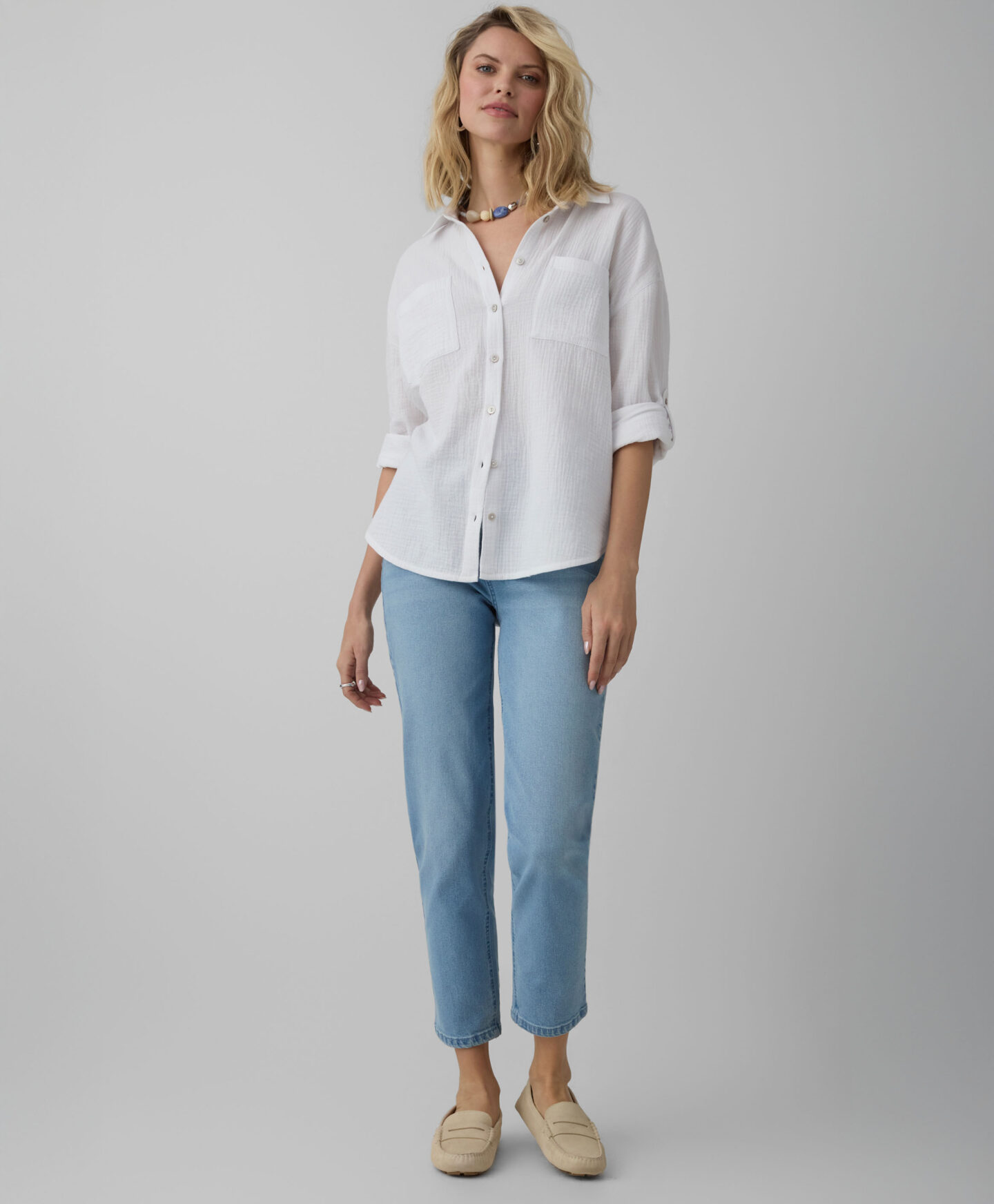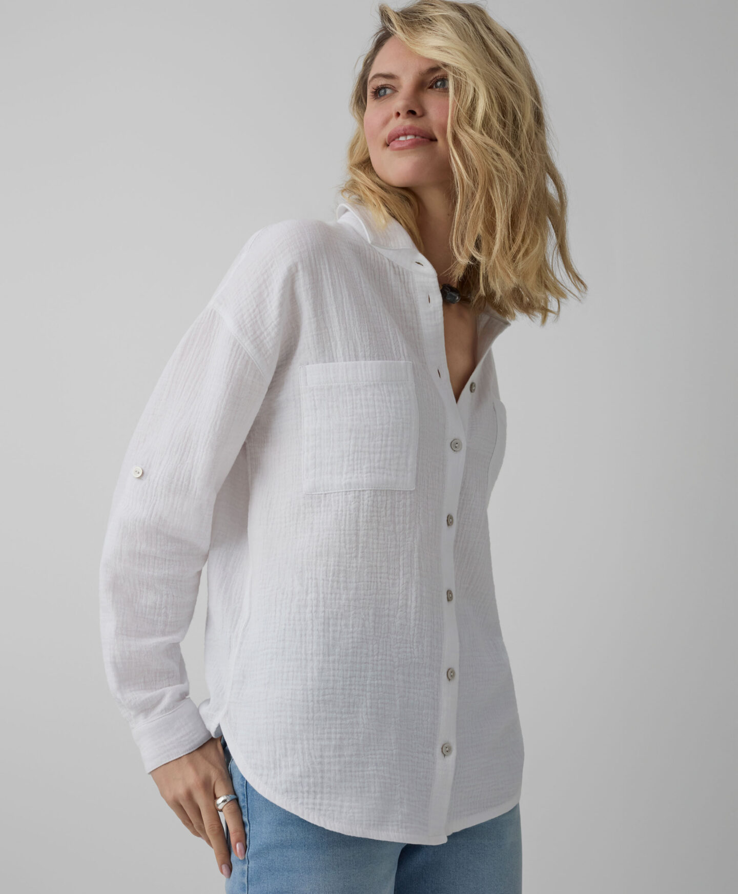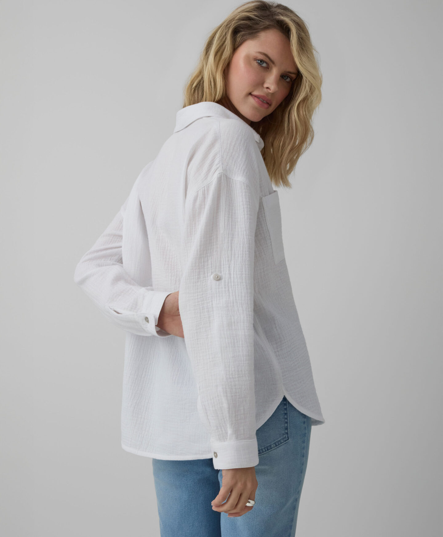 Balti marškiniai, 100 % medvilnės – tai pasiūlymas kiekvienam, ieškančiam natūralių medžiagų ir rafinuoto stiliaus. Muslinas pasižymi ypatingu švelnumu, lengvumu ir leidžia odai kvėpuoti. Universali balta spalva yra nesenstanti klasika, kuri puikiai dera su kiekvienu garderobo elementu – nuo kelnių iki sijonų.