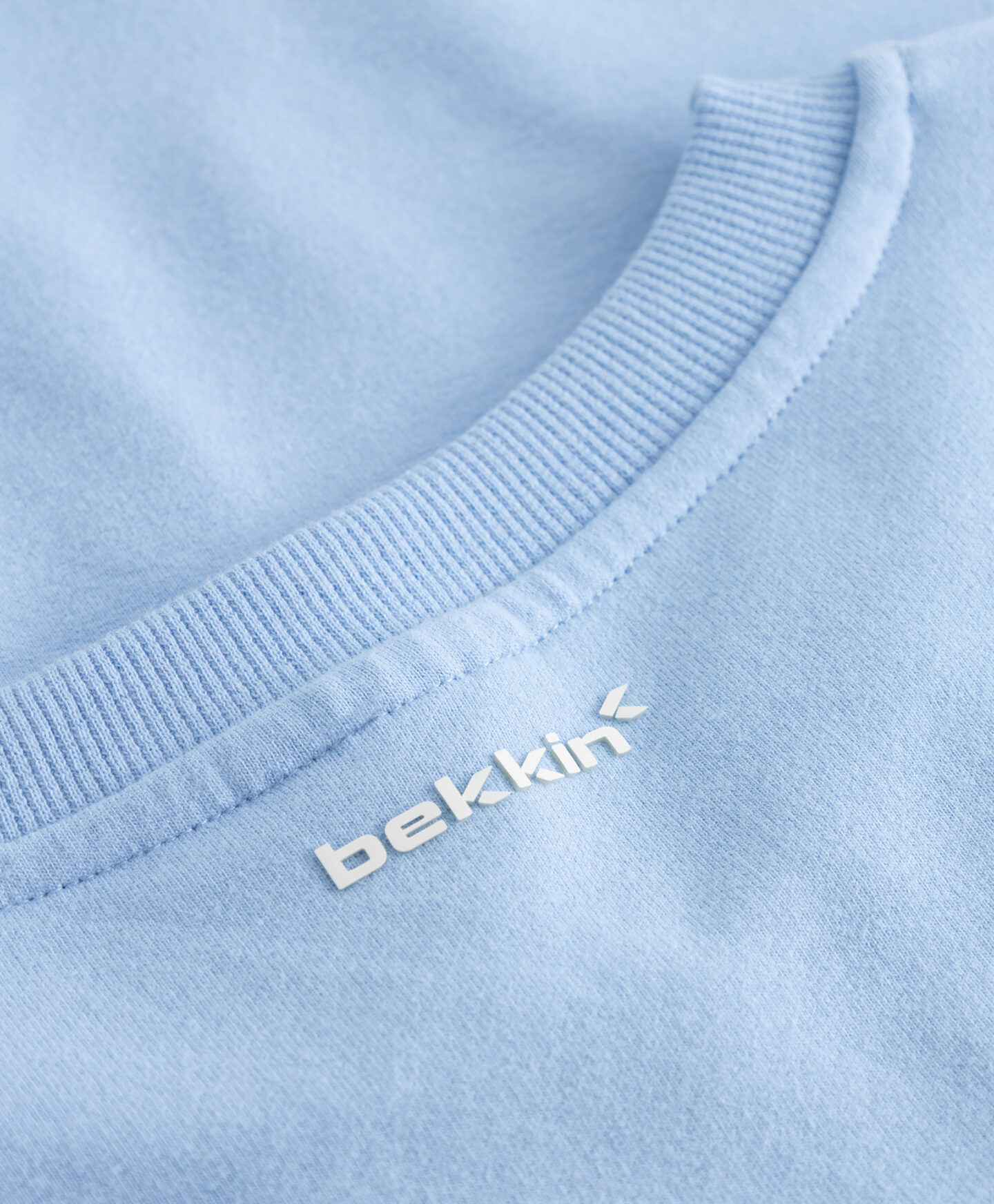 BEKKIN mėlyni vaikiški marškinėliai puikiai tinka laisvalaikio stiliui. Laisvas modelis leidžia nevaržomai judėti ir yra itin patogus. Plačios rankovės suteikia marškinėliams modernumo. Didelis medvilnės kiekis sudėtyje užtikrina pralaidumą orui. Šie marškinėliai puikiai tinka kasdieniam dėvėjimui ar veiklai lauke. Universali mėlyna spalva puikiai dera su įvairia apranga – nuo laisvalaikio iki elegantiškesnės. Taip pat galima įsigyti šortus.