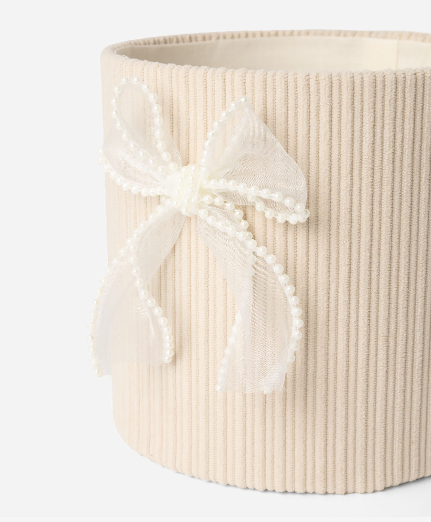 Didelis apvalus daiktų laikymo krepšys su kaspinėliu yra elegantiškas ir praktiškas elementas, tinkantis bet kokiam interjerui. Puikiai tinka laikyti kosmetiką ar smulkius aksesuarus. Dekoratyvinis kaspinėlis suteikia žavesio, todėl jis stilingai papuoš lentyną, komodą ar rašomąjį stalą. Kadangi nėra dangtelio, krepšio turinį galima greitai pasiekti.
