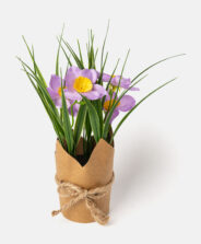 Dirbtinės violetinės gėlės popieriniame indelyje – puikus sprendimas ieškantiems patvarios, paruoštos naudoti dekoracijos. Sodrios spalvos ir tikslios detalės sukuria gaivų, gyvybingą vaizdą. Galima rinktis iš įvairių dizainų.