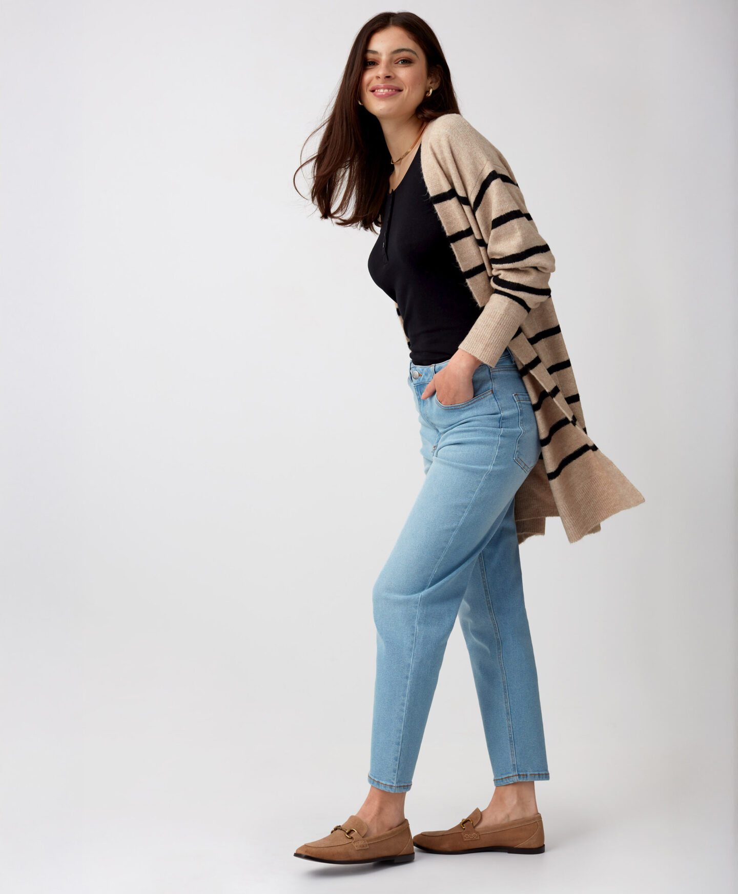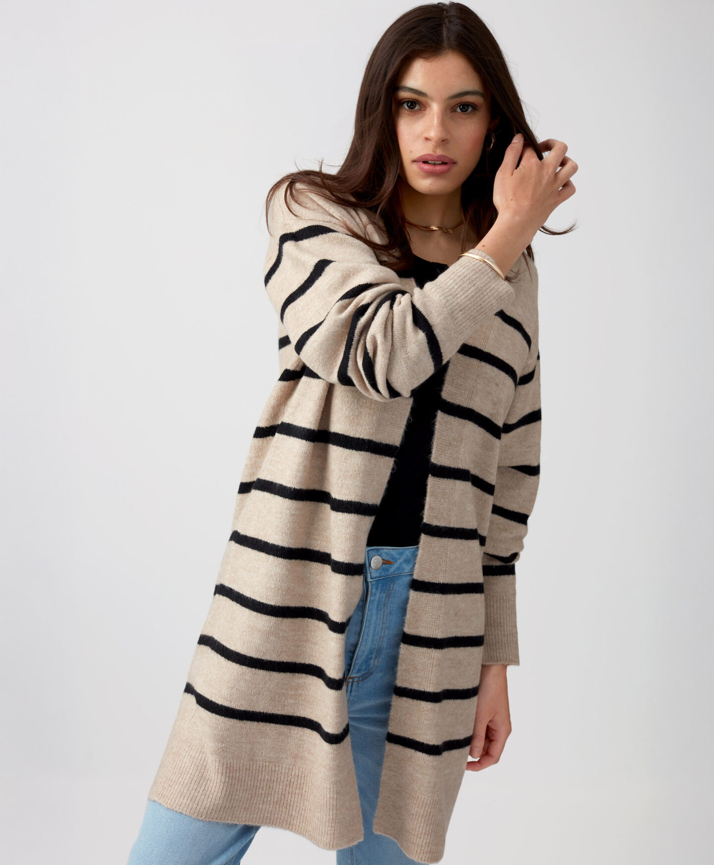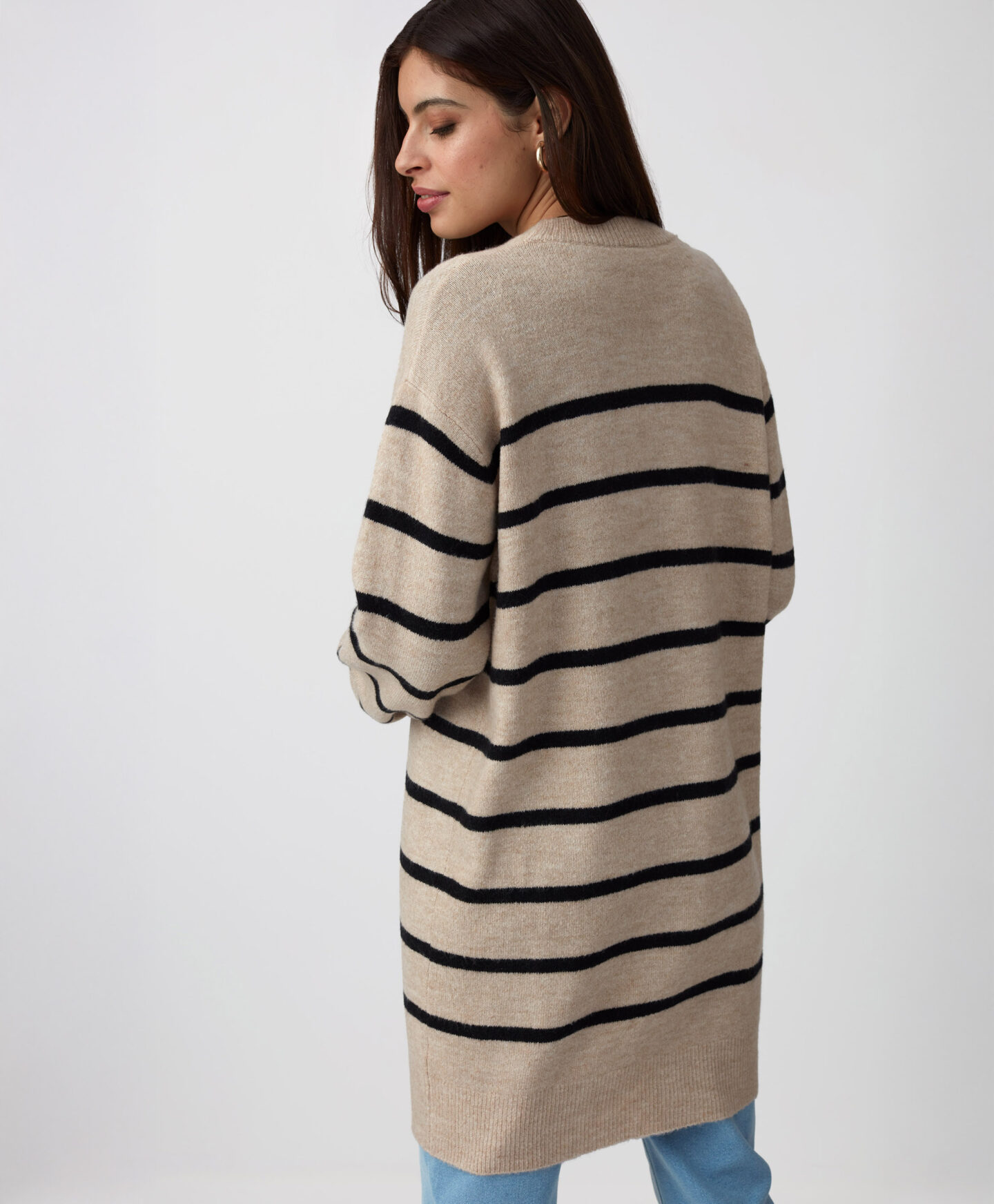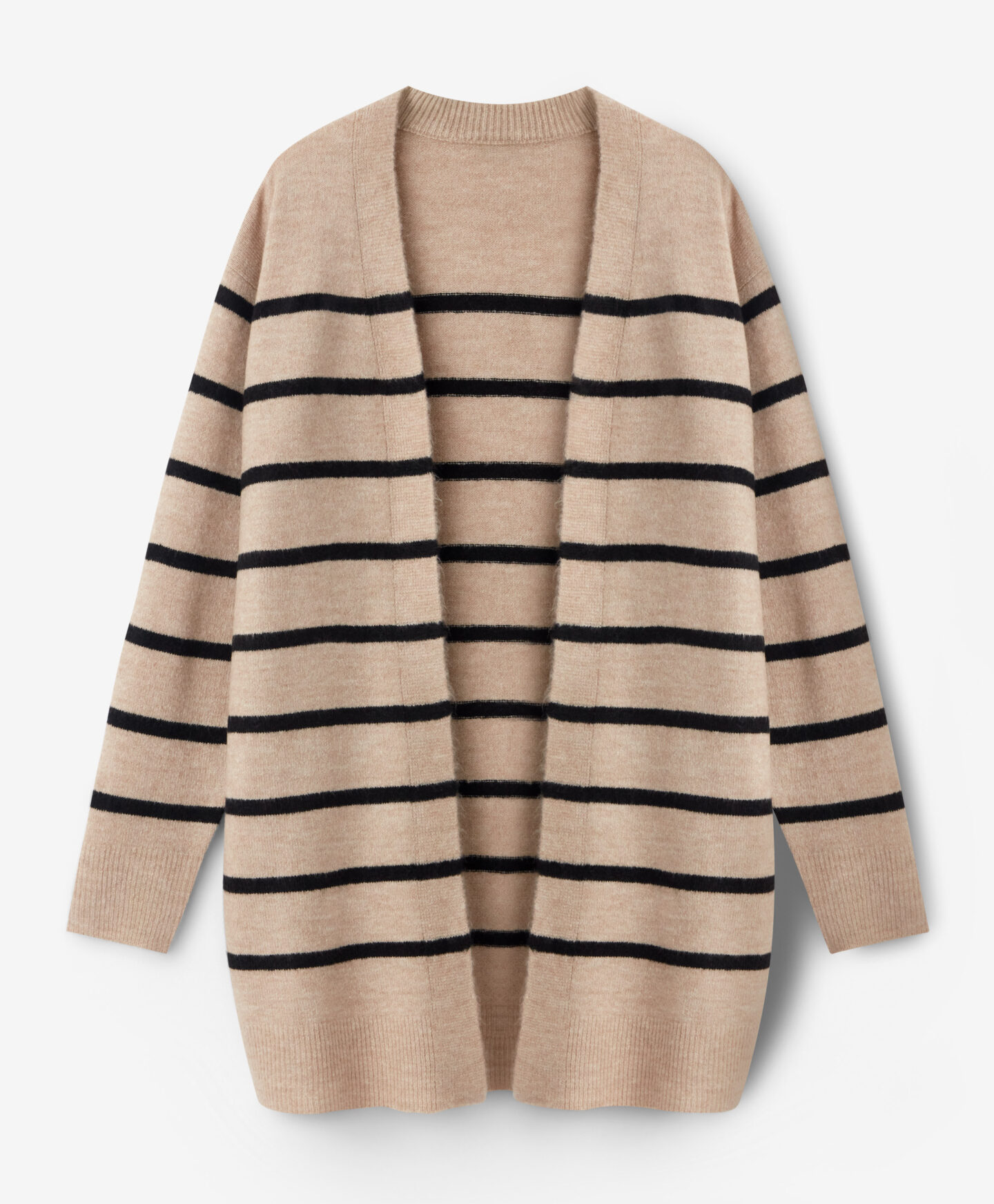Dryžuotas kardiganas – puikus pasirinkimas komforto mėgėjams. Laisvas modelis nevaržo judesių, kardiganą patogu dėvėti, o dryžiai – madingas bet kokios aprangos akcentas. Jis puikiai tinka ir kasdieniam, ir elegantiškesniam stiliui. Puikiai tinka vėsesnėmis dienomis, kai norisi šilumos.