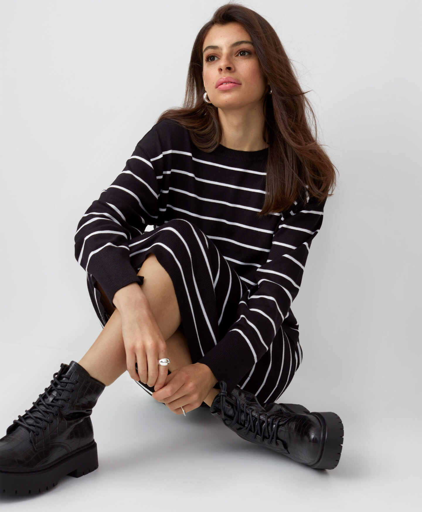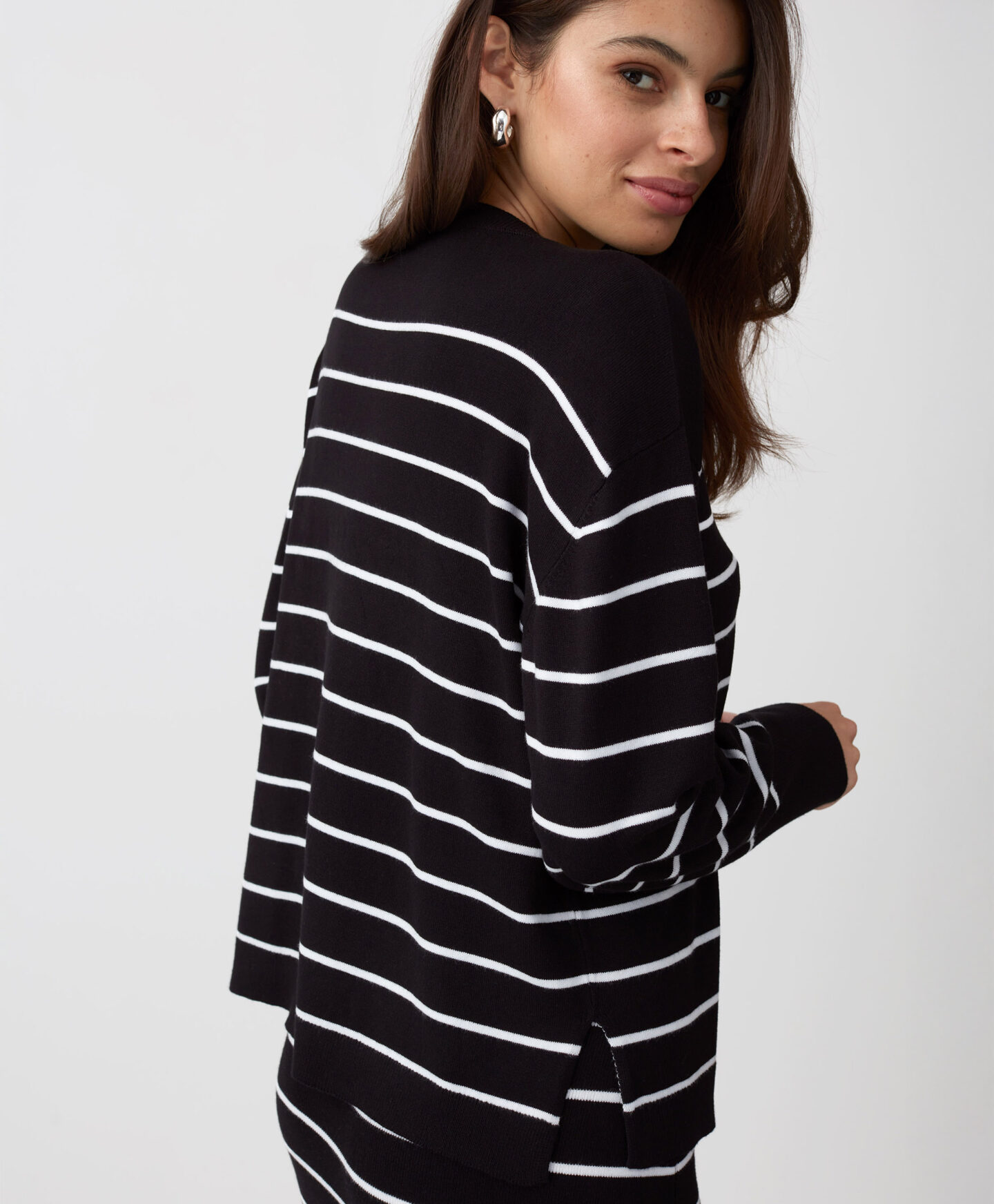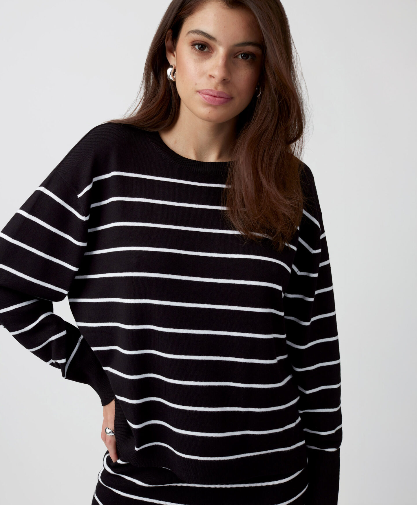 Dryžuotas megztinis puikiai dera su to paties modelio sijonu iš pasiūlymo. Jis lengvas, kvėpuojantis ir maloniai priglunda prie kūno. Jis gražiai aptempia siluetą, todėl puikiai tinka tiek laisvalaikiui, tiek biurui ar universitetui. Dryžuotas raštas yra nesenstantis ir niekada neišeina iš mados.