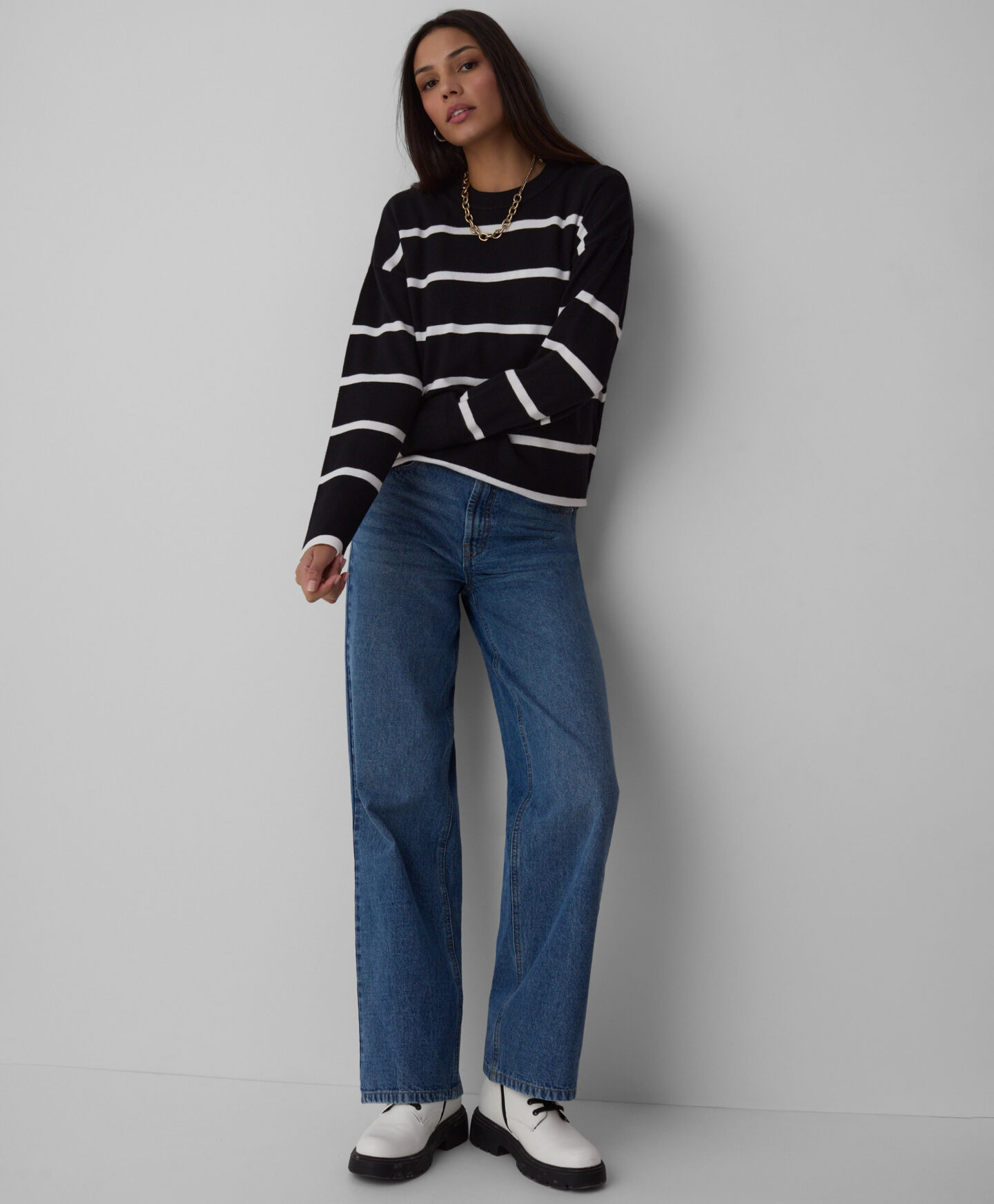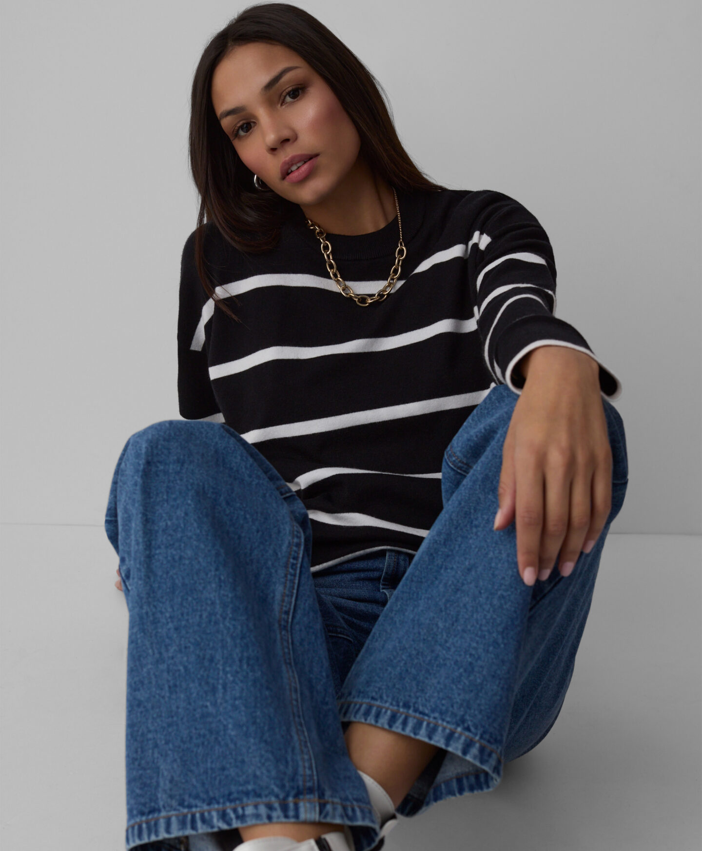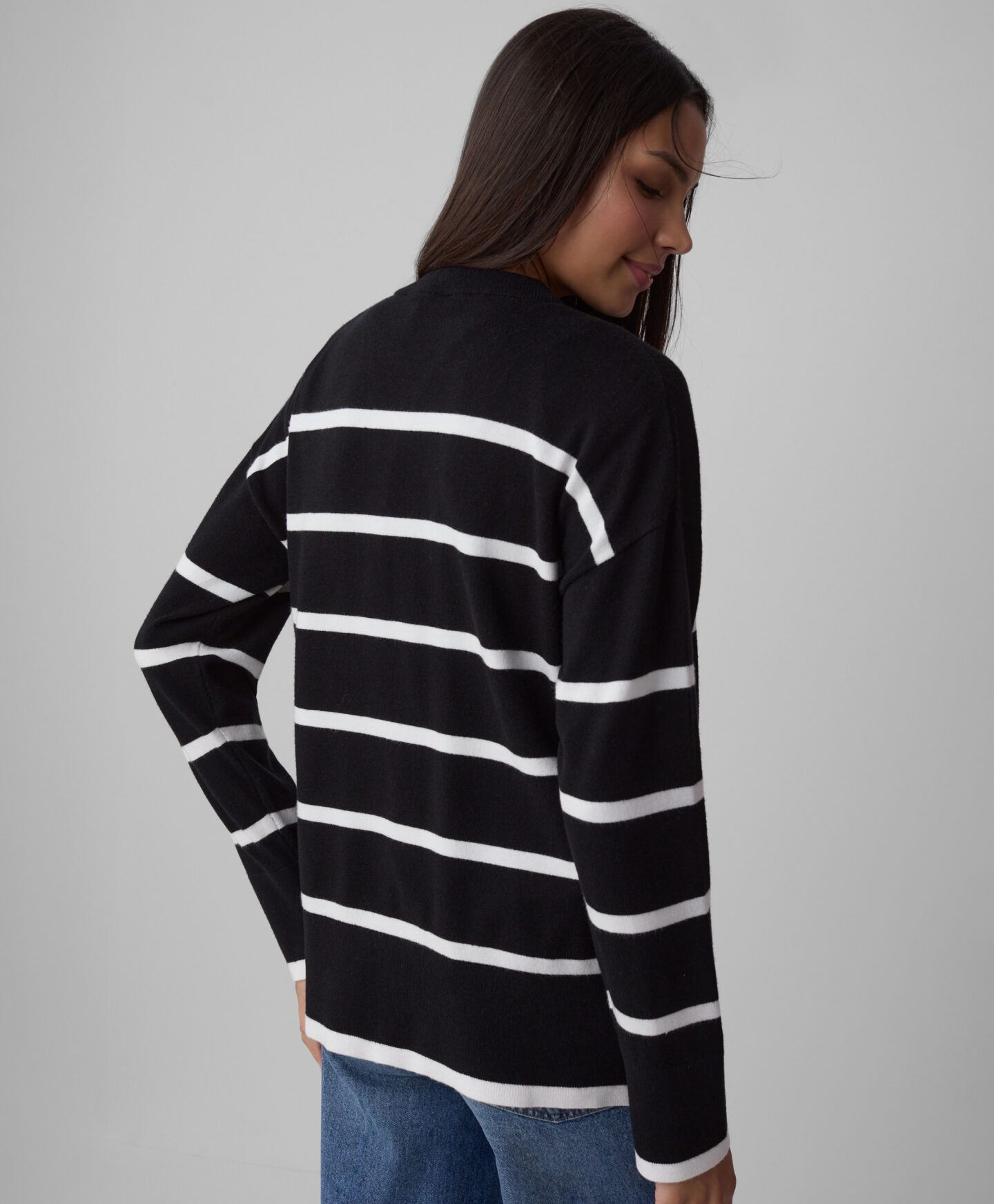 Dryžuotas megztinis su viskoze puikiai atrodo kartu su džinsais. Jis lengvas, malonus liesti ir puikiai tinka kasdienai. Su elegantiškais aksesuarais jis bus puikus pasirinkimas biurui, išvykoms su draugais ar iškilmingesnėms progoms. Klasikinis dryžuotas raštas puikiai papildys jūsų garderobą.