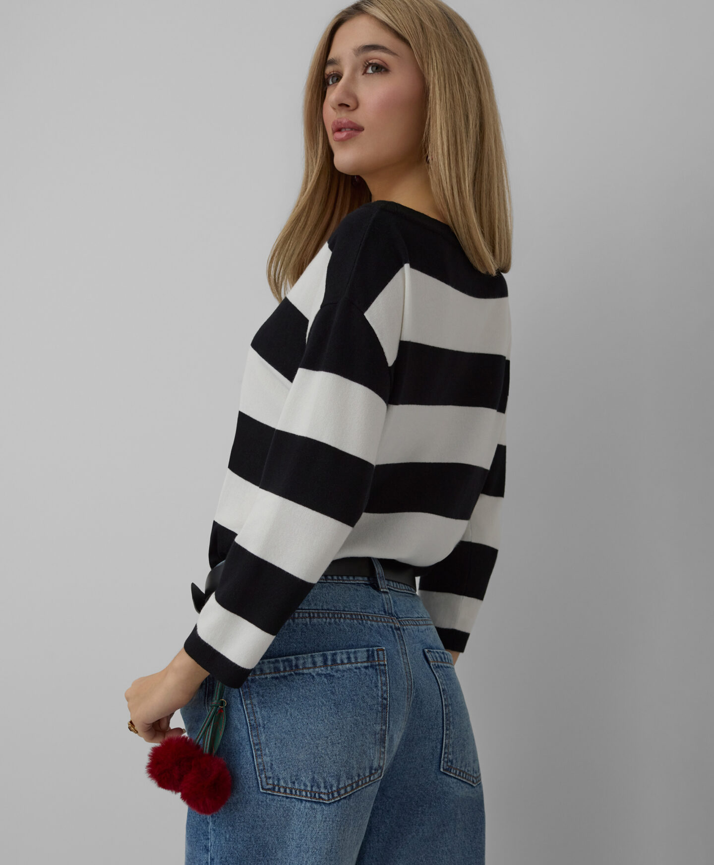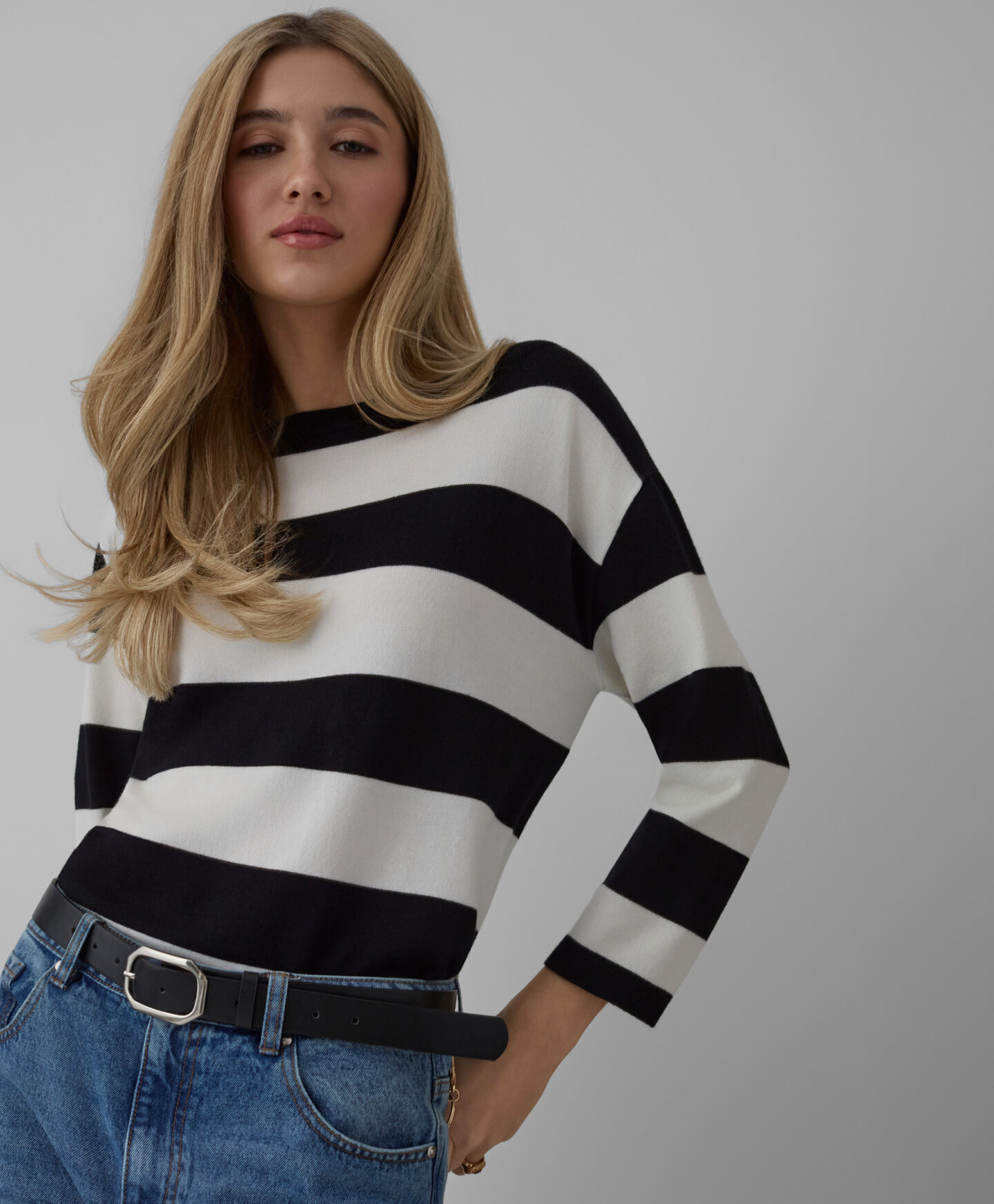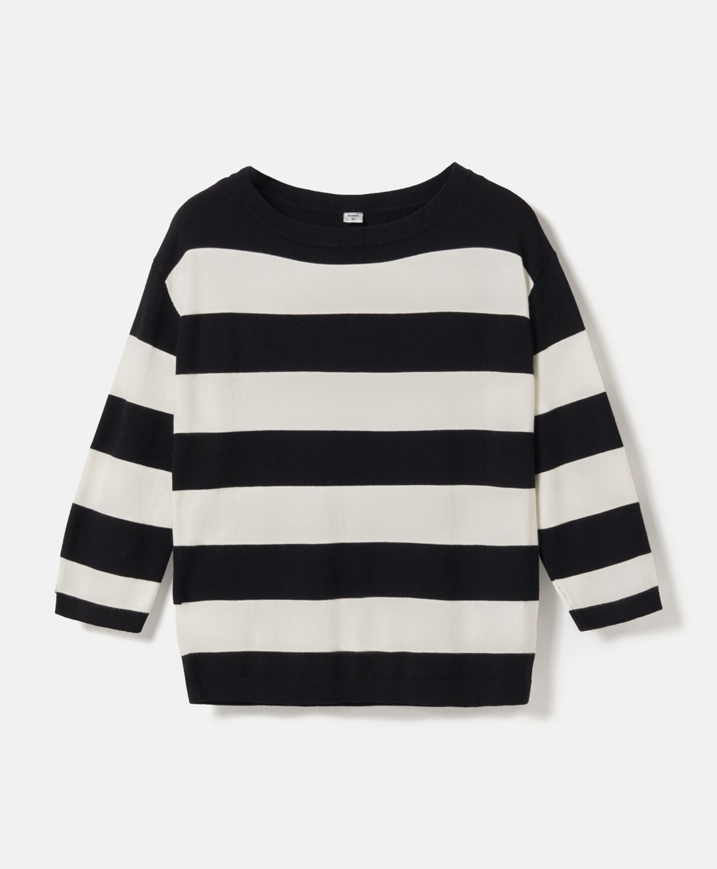 Dryžuotas megztinis išsiskiria unikaliu modeliu. Dėl sudėtyje esančios viskozės megztinis yra minkštas ir pralaidus orui, todėl su juo bus patogu visą dieną. Kimono stiliaus modelis suteikia jam unikalumo ir nevaržo judesių.