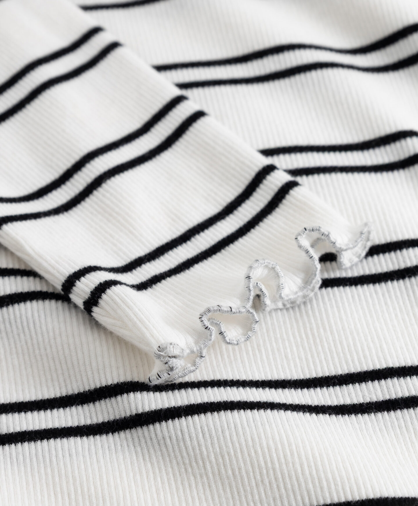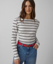 Dryžuoti balti marškinėliai, kurių sudėtyje yra daug medvilnės ir šiek tiek elastano, puikiai priglunda prie figūros. Dekoratyvinės detalės bus stilingas bet kokios aprangos akcentas. Marškinėliai tinka ir prie džinsų, ir prie elegantiškų kelnių. Galima rinktis iš dviejų spalvų.