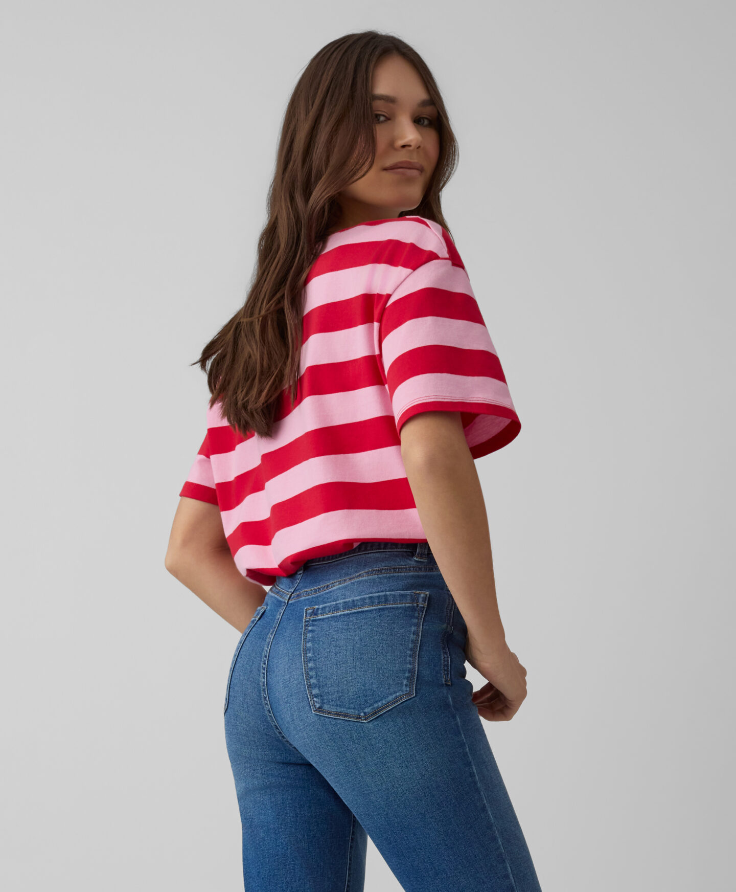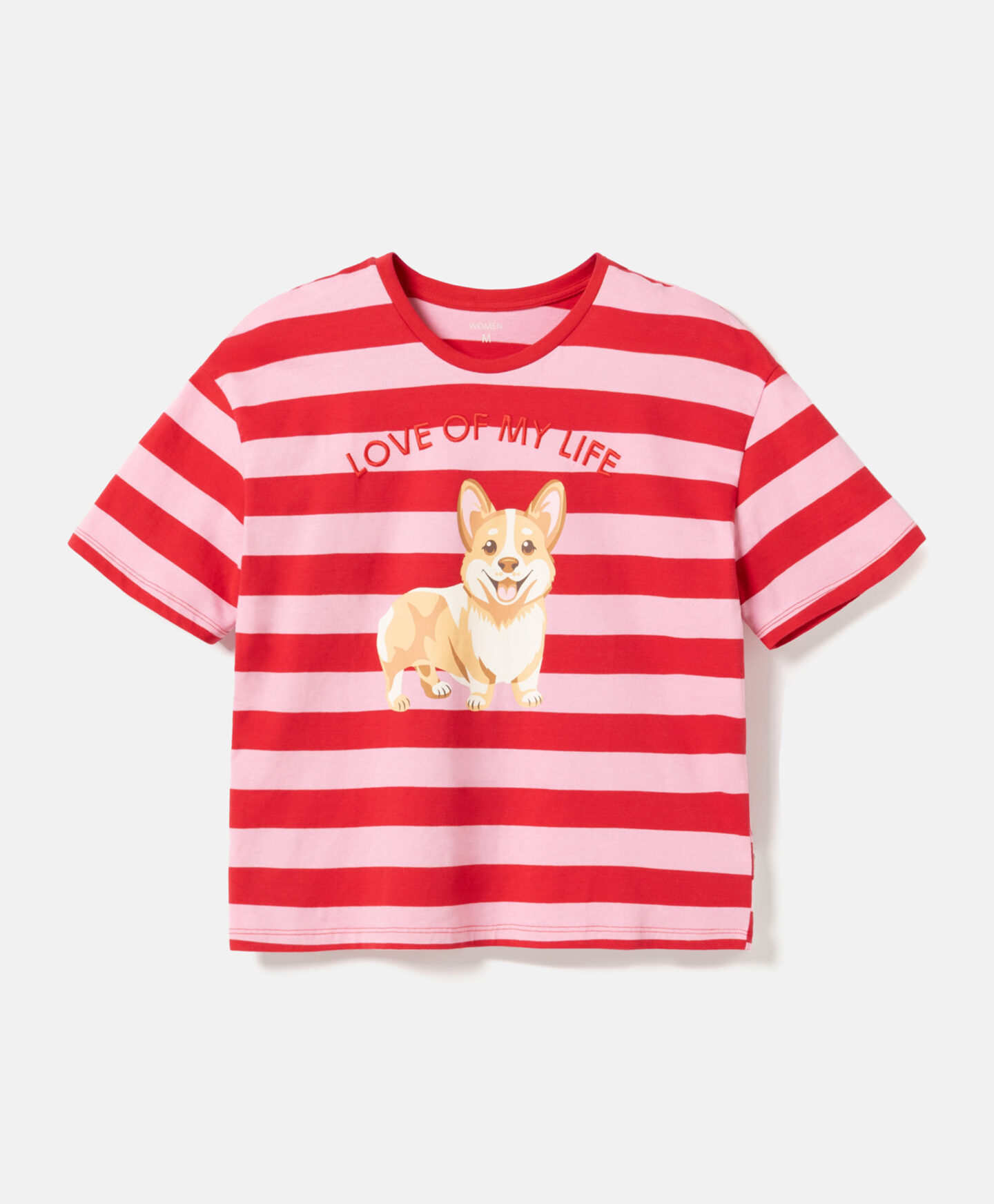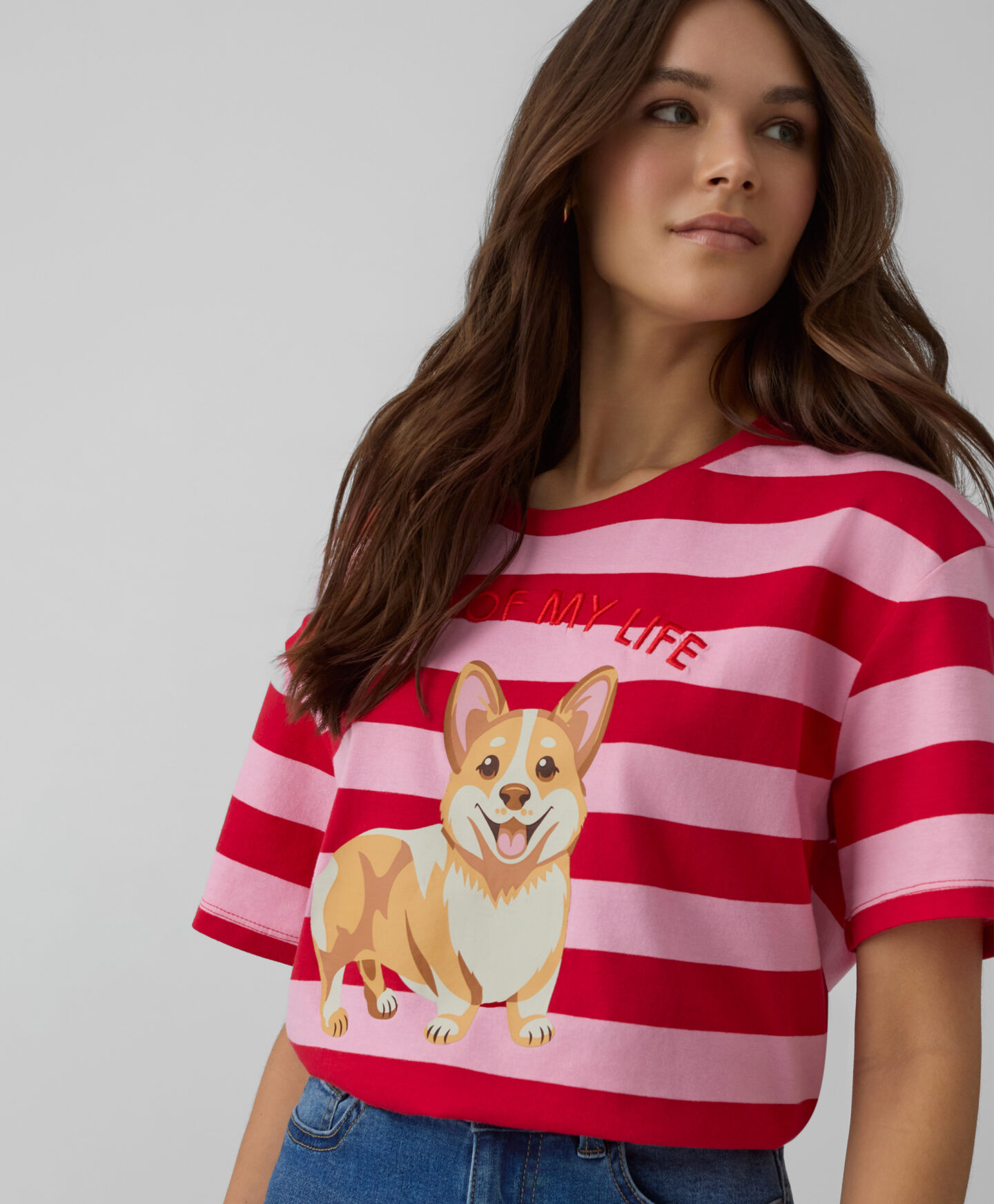 Dryžuoti marškinėliai iš 100 % medvilnės su šuniuko piešiniu ir juokingu šūkiu – puikus pasirinkimas kasdienai. Jie yra minkšti, pralaidūs orui ir maloniai priglunda prie odos. Marškinėliai puikiai dera ir prie džinsų, ir prie sportinių kelnių.