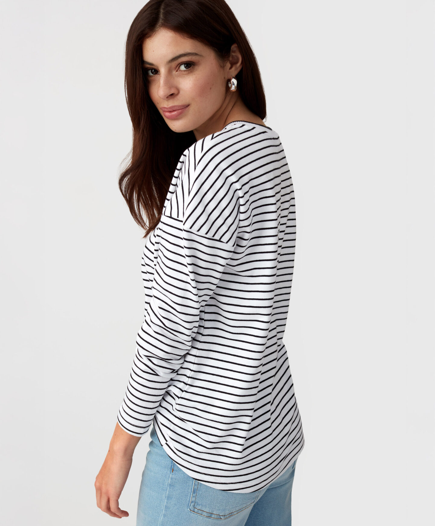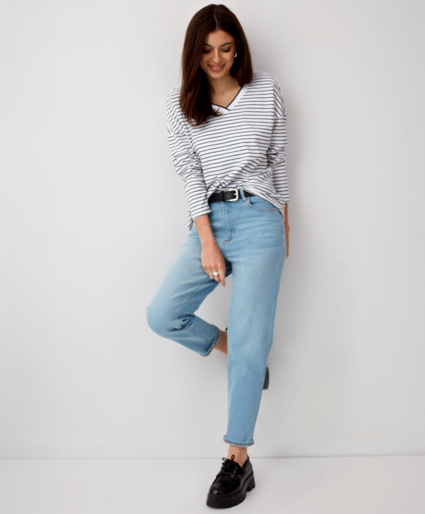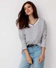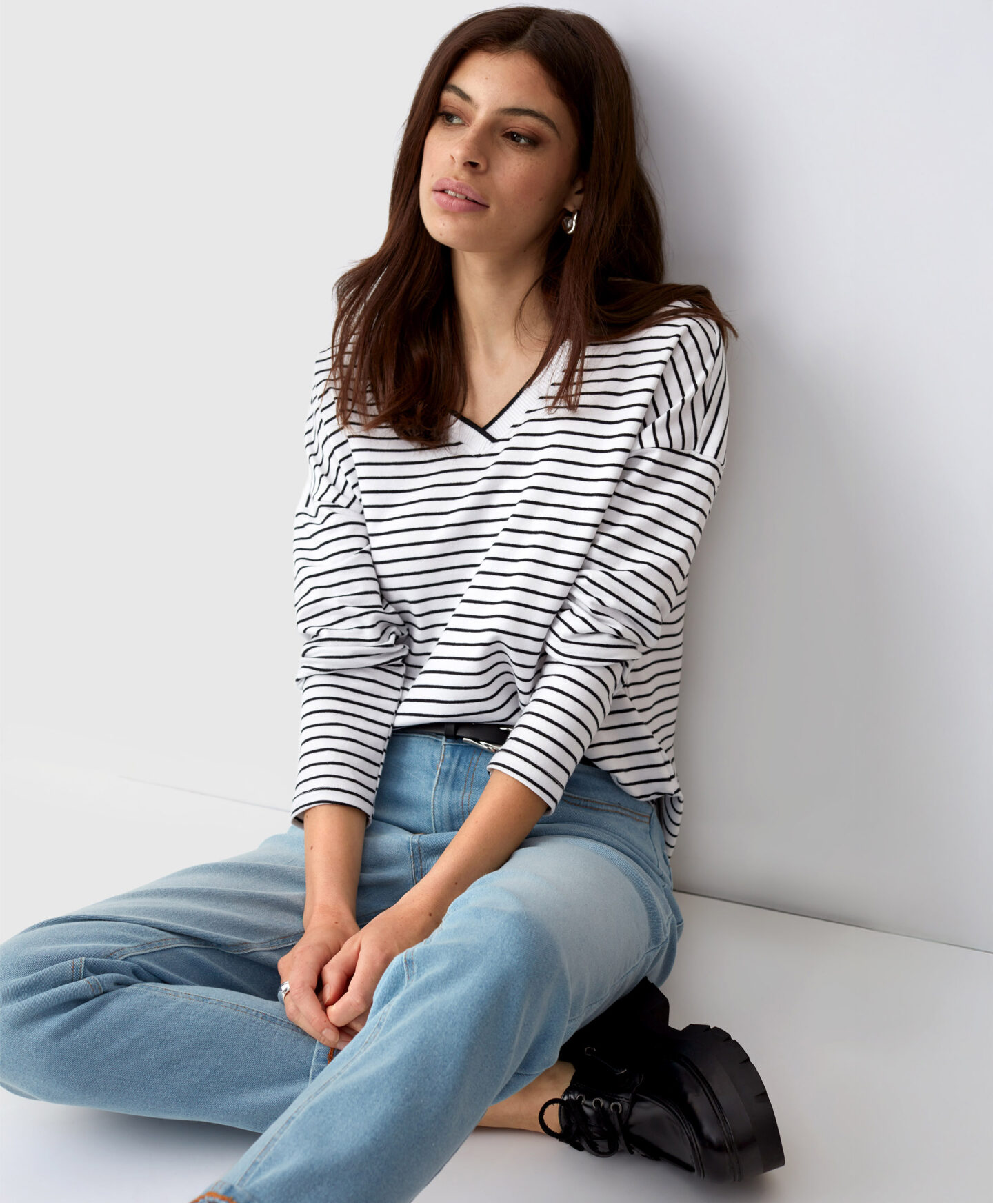 Dryžuoti marškinėliai, kurių sudėtyje yra daug medvilnės, – kokybės ir stiliaus sinonimas. Universalus modelis tinka ir prie elegantiškos, ir prie laisvalaikio aprangos.