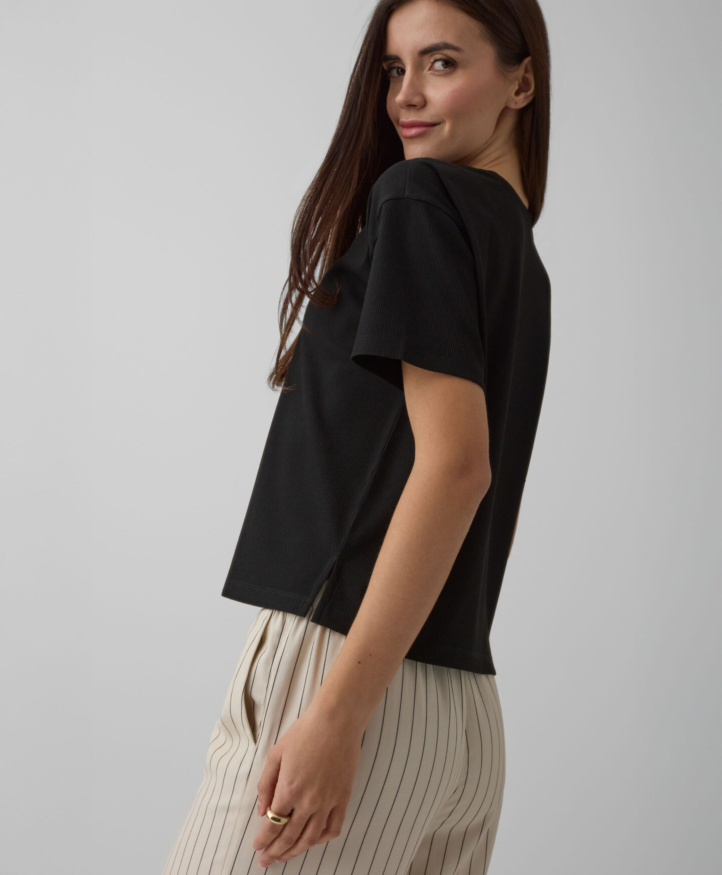 Dryžuoti marškinėliai su 3/4 ilgio rankovėmis turi briaunuotą struktūrą, kuri suteiks charakterio bet kokiai aprangai. Klasikinis dryžuotas raštas niekada neišeina iš mados, o dėl patogaus modelio šie marškinėliai taps jūsų mėgstamiausiais! Puikiai dera su džinsais, taip pat tinka su sportinėmis kelnėmis poilsiaujant namuose.