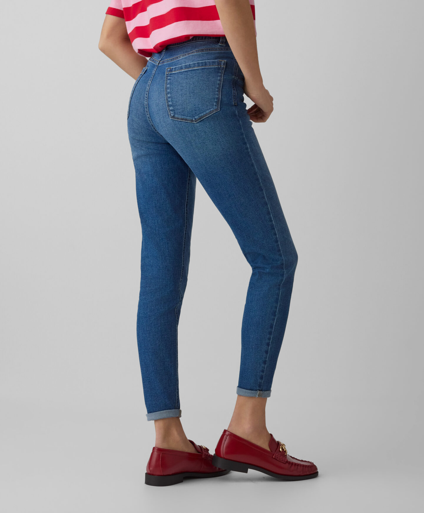 Siauresnio modelio džinsai išryškina figūrą ir puikiai tinka prie įvairios aprangos – nuo kasdienės iki oficialios. Juos galite derinti su marškiniais, laisvu megztiniu ar sportiniu džemperiu. Elastinga medžiaga nevaržo judesių ir yra patogi odai.