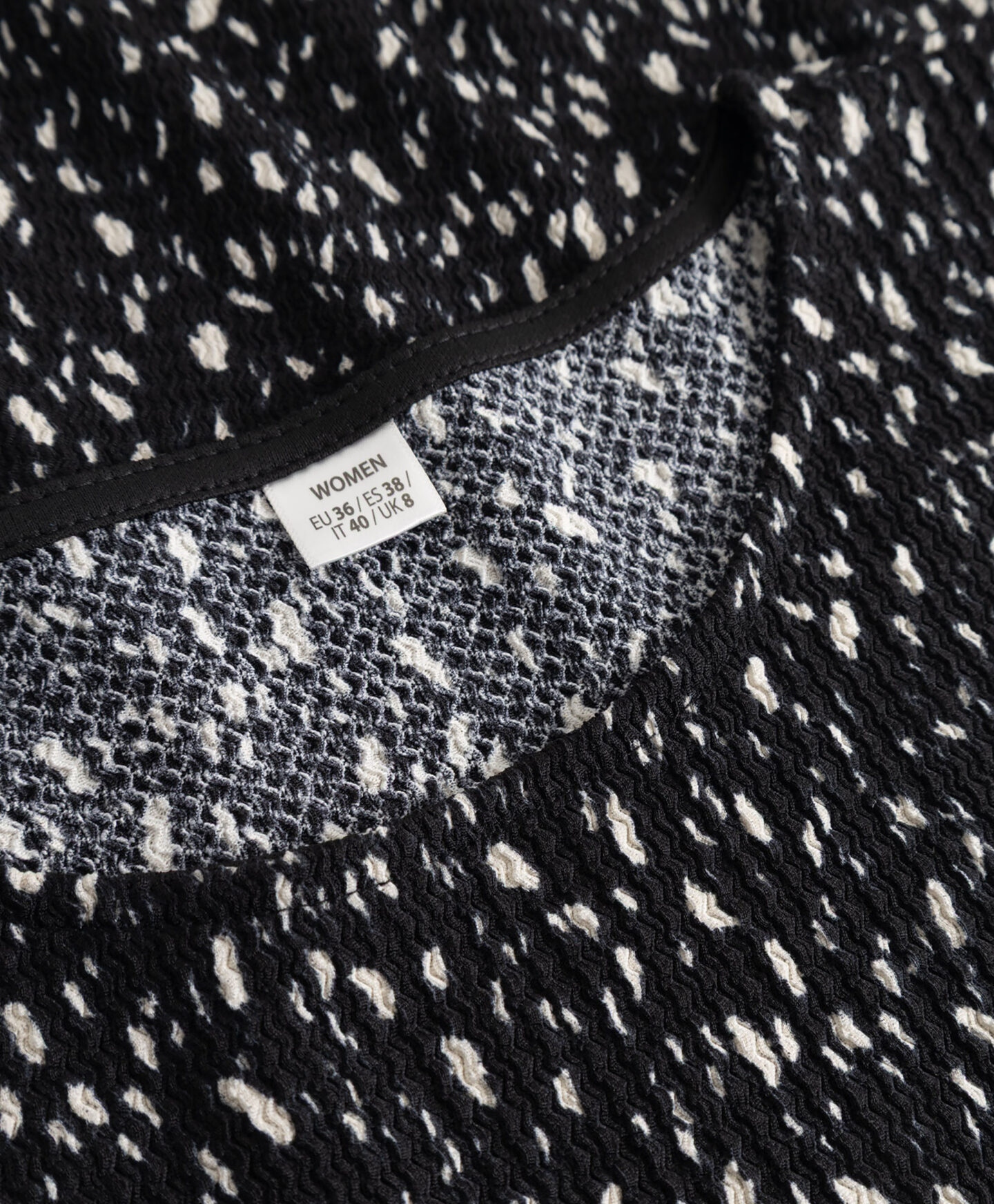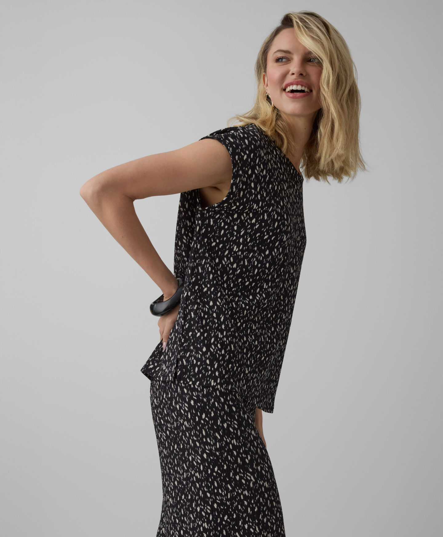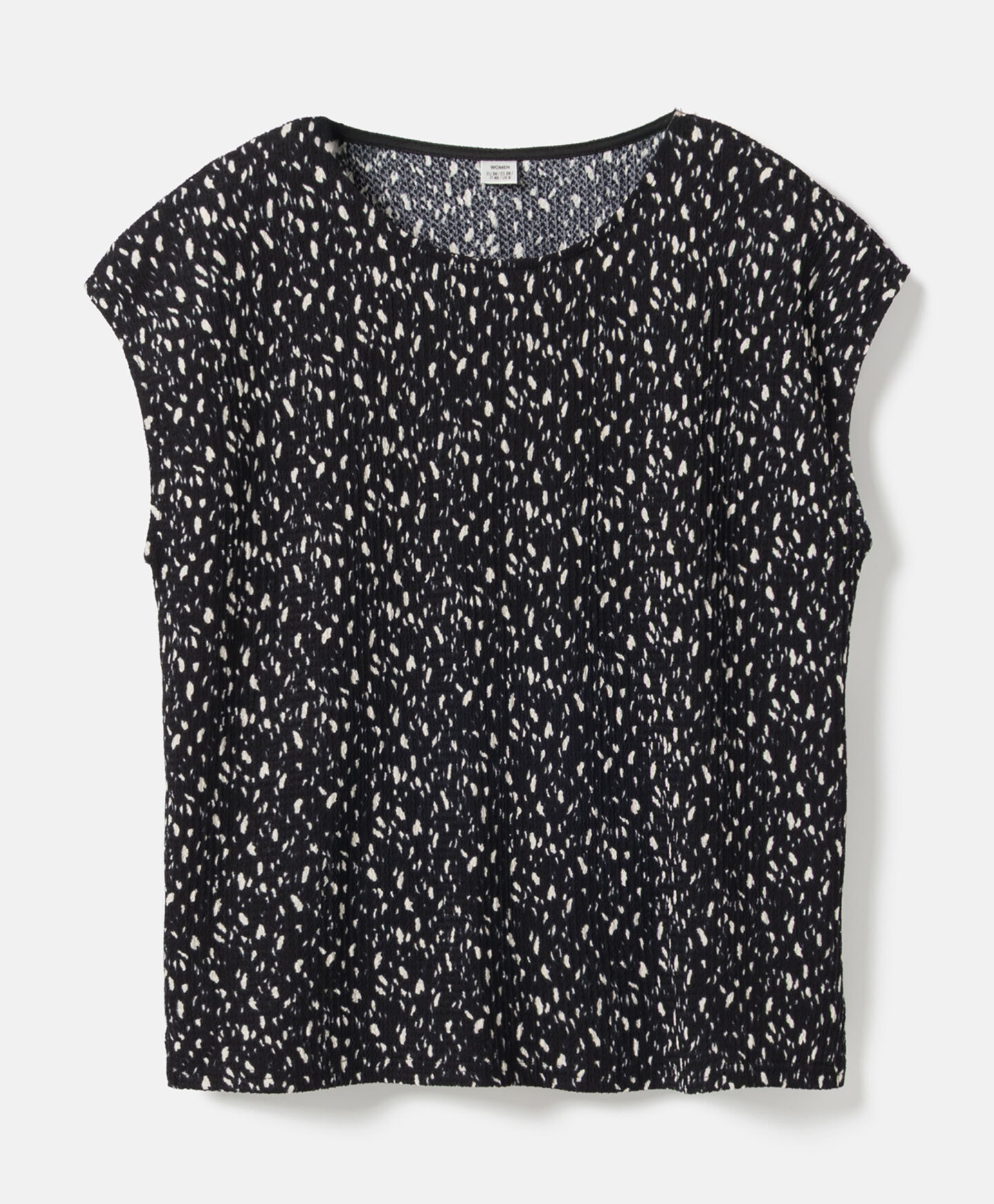 Juoda palaidinė su raštu sudaro komplektą su sijonu iš kolekcijos. Tačiau ją galite derinti ir prie mėgstamų džinsų ar elegantiškesnių kelnių. Dėl trumpų rankovių ši palaidinė puikiai tinka pereinamuoju metų laiku. Ji dera ir su klasikiniu švarkeliu, ir su kardiganu.
