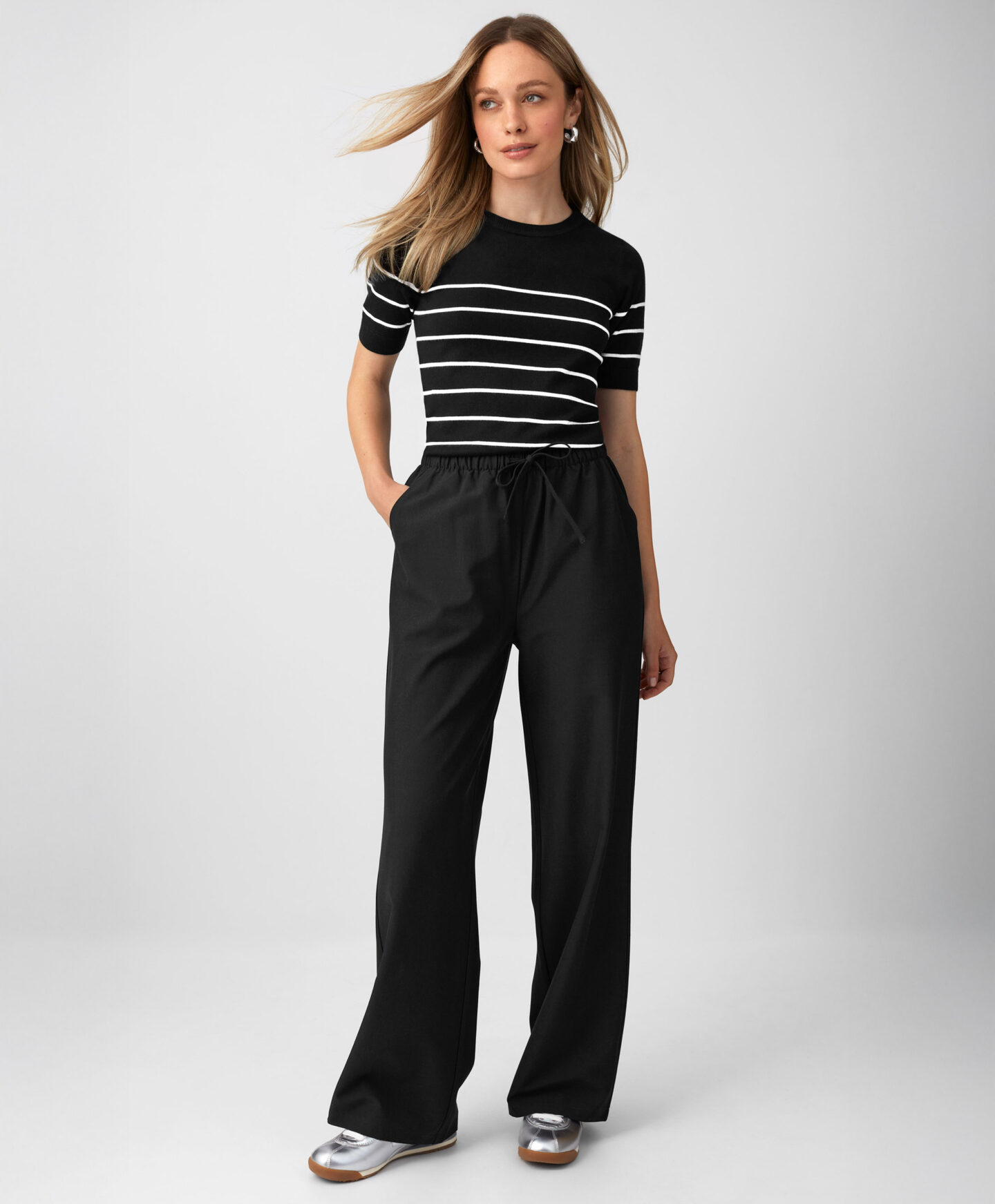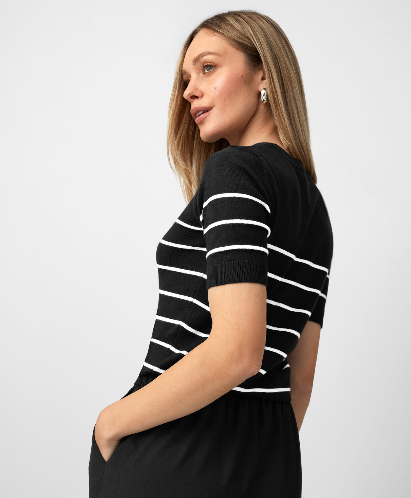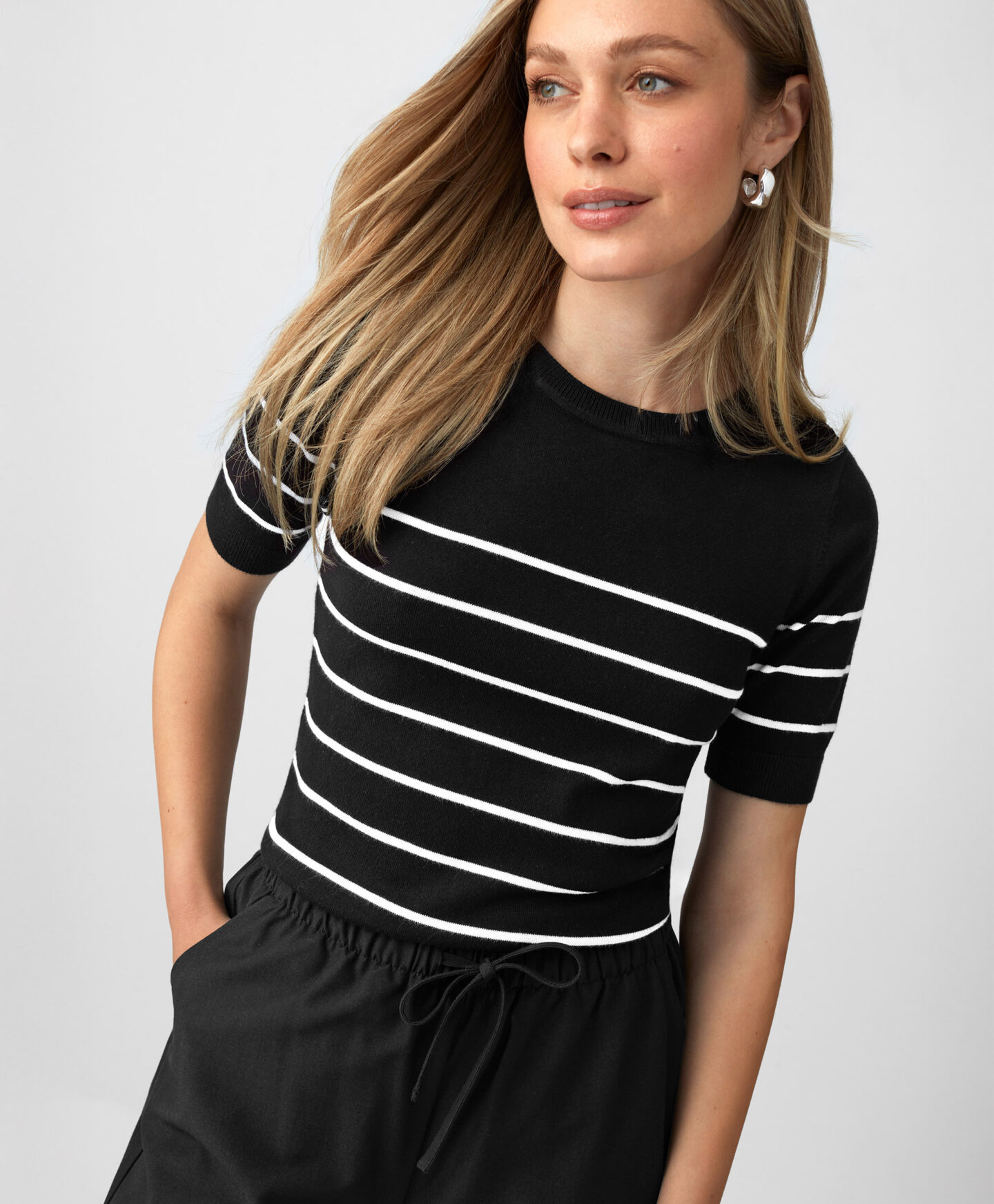 Juodas dryžuotas megztinis su viskoze – puikus pasirinkimas vertinantiems eleganciją ir patogumą. Pasiūtas iš aukštos kokybės medžiagų, jis yra minkštas liesti ir patogus dėvėti. Dėl klasikinio dryžuoto rašto ir šviesių spalvų megztinis puikiai tinka tiek kasdieniam, tiek elegantiškesniam stiliui.