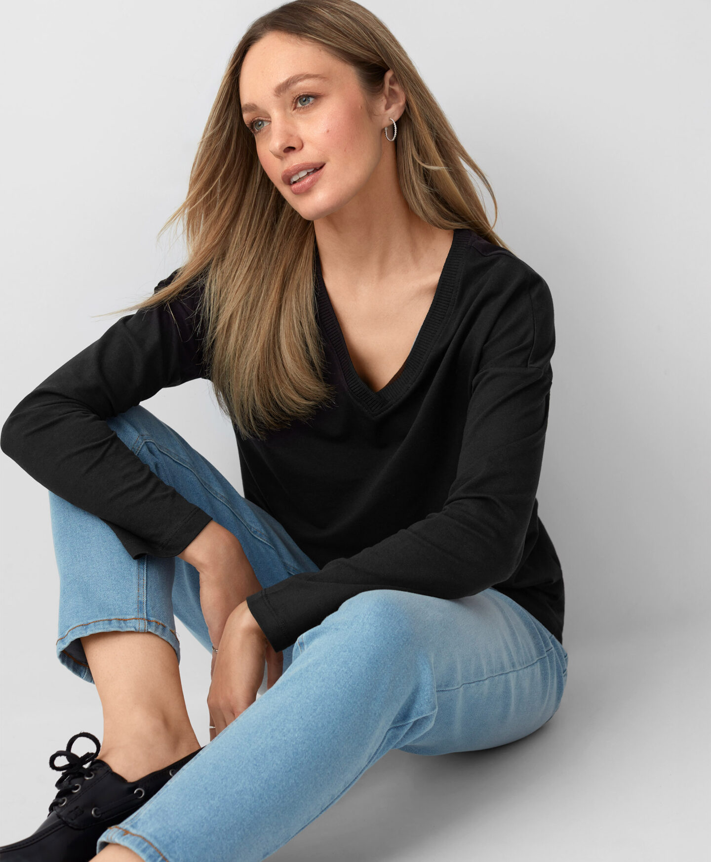 Juodi marškinėliai, kurių sudėtyje yra daug medvilnės, – kokybės ir stiliaus sinonimas. Universalus modelis tinka ir prie elegantiškos, ir prie laisvalaikio aprangos.