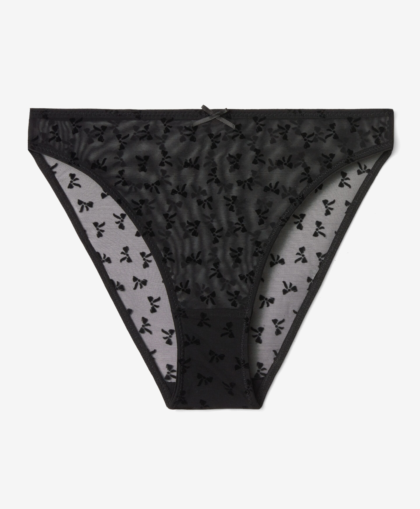Elegantiškos juodos kelnaitės su tinkleliu – tai puikus pasirinkimas mėgstantiems klasikinį stilių su moderniais akcentais. Priekyje esantis žavus kaspinėlis suteikia lengvumo ir nerūpestingumo. Dėl sudėtyje esančio elastano, kelnaitės puikiai priglunda prie kūno ir pabrėžia kūno formas. Idealiai tinka dėvėti kasdien ir romantiškomis progomis. Kolekcijoje taip pat rasite ir puikiai derančią prancūziškąją liemenėlę.
