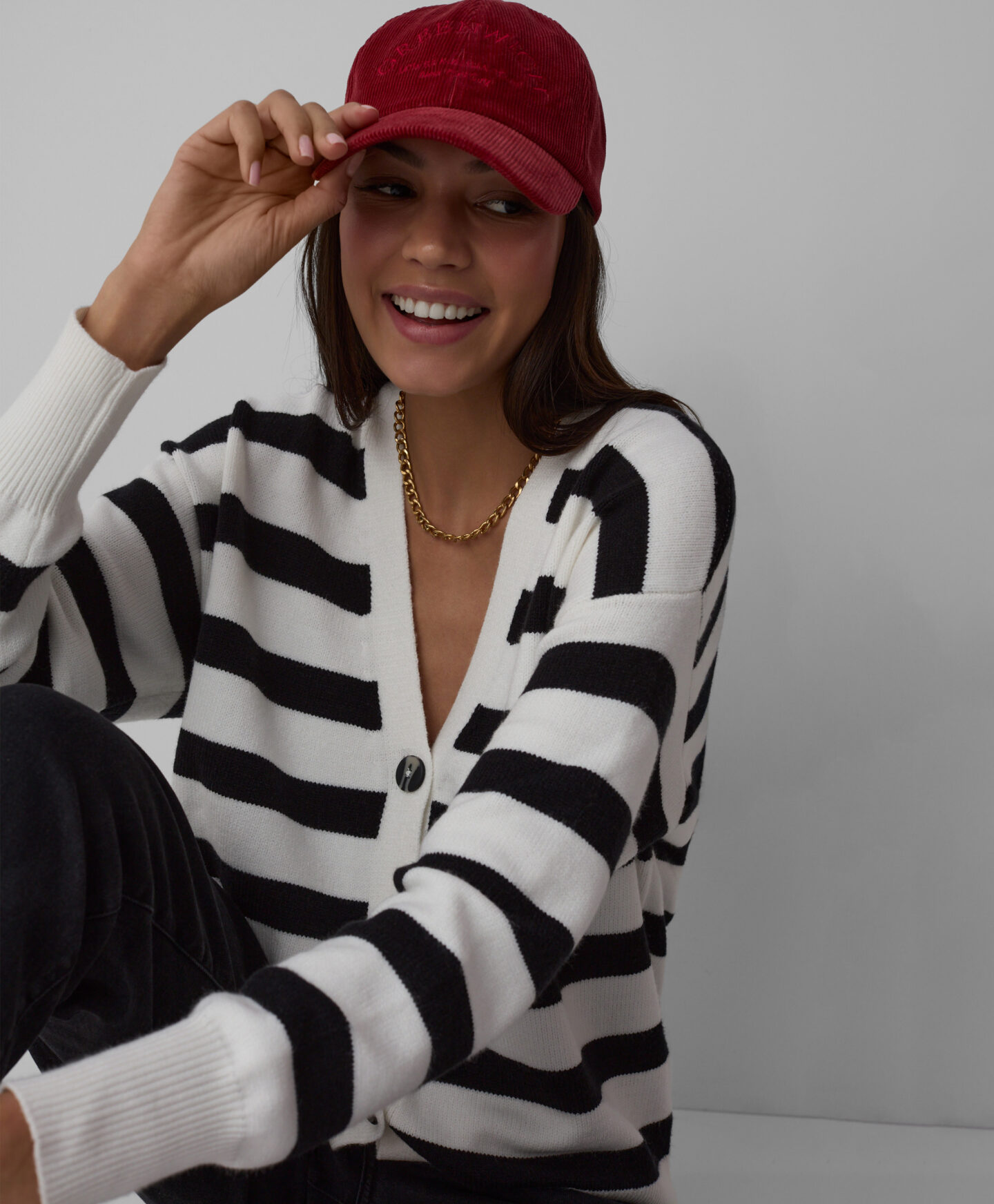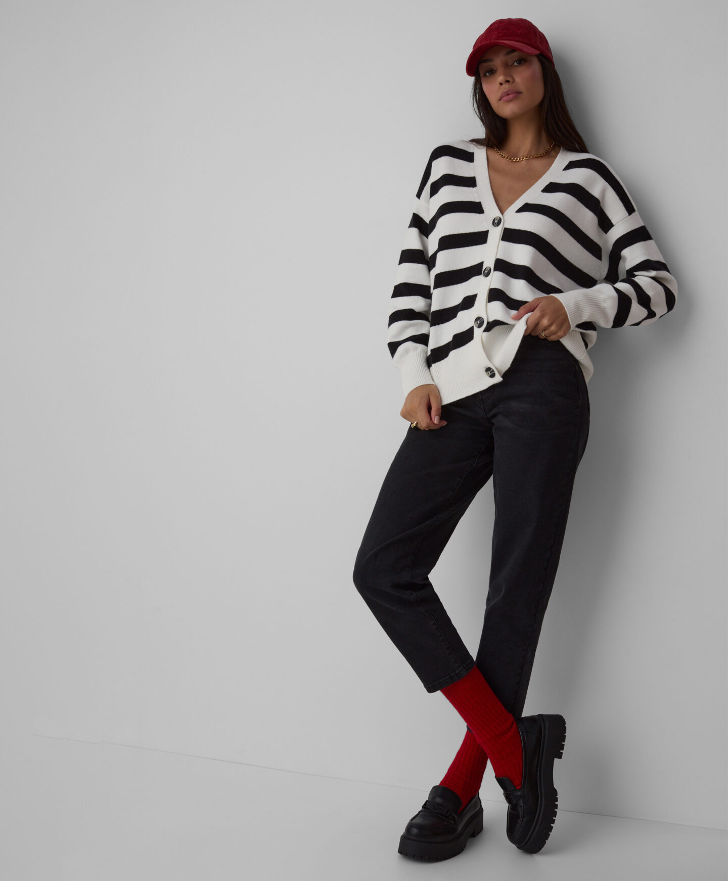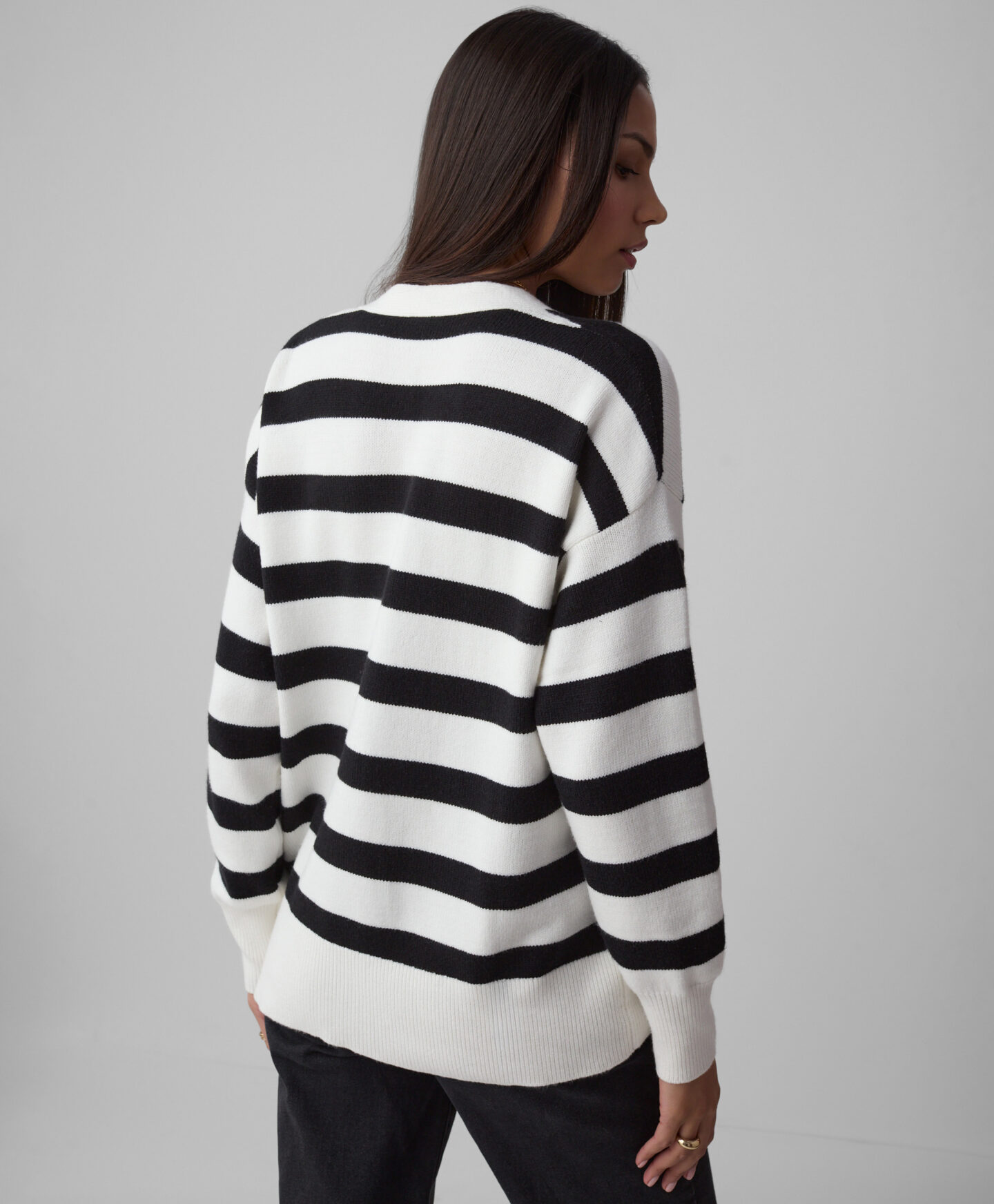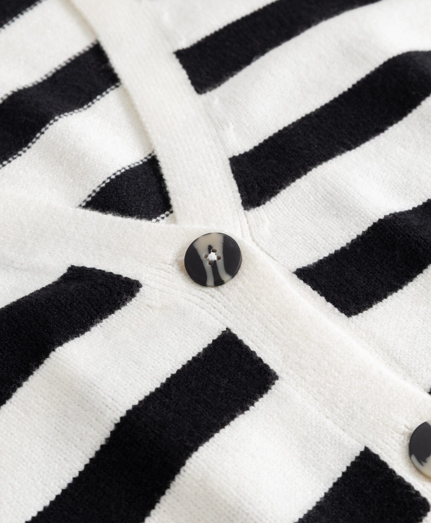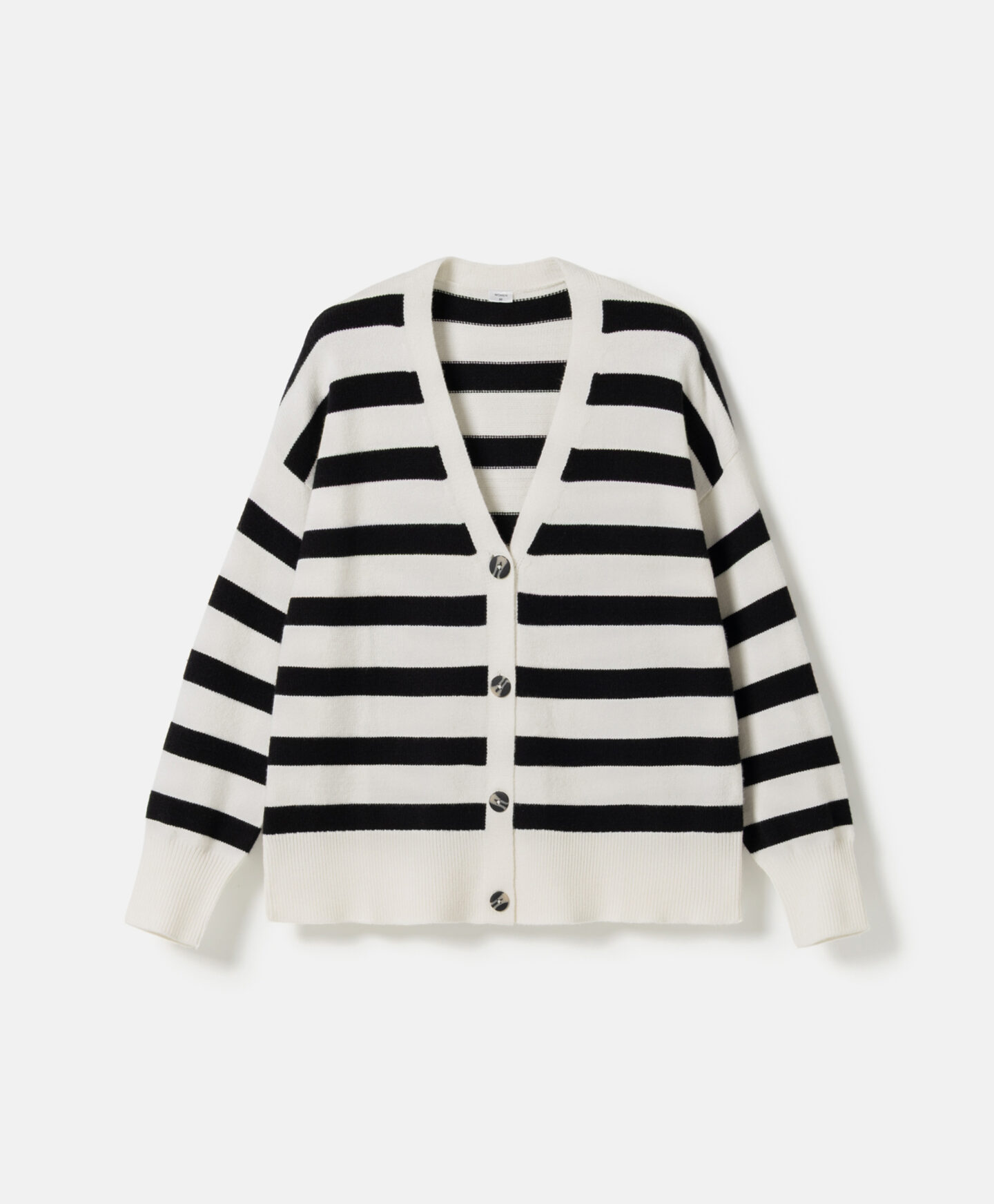 Laisvo modelio kardiganas su juodais ir baltais dryžiais puikiai tiks klasikinio stiliaus mėgėjams. Dryžuotas raštas niekada neišeina iš mados ir puikiai atrodo tiek su elegantiškomis kelnėmis, tiek su klasikiniais džinsais. Švelni medžiaga su viskoze maloniai odą ir suteikia šilumos vėsiomis žiemos dienomis. Galima rinktis iš dviejų spalvų.