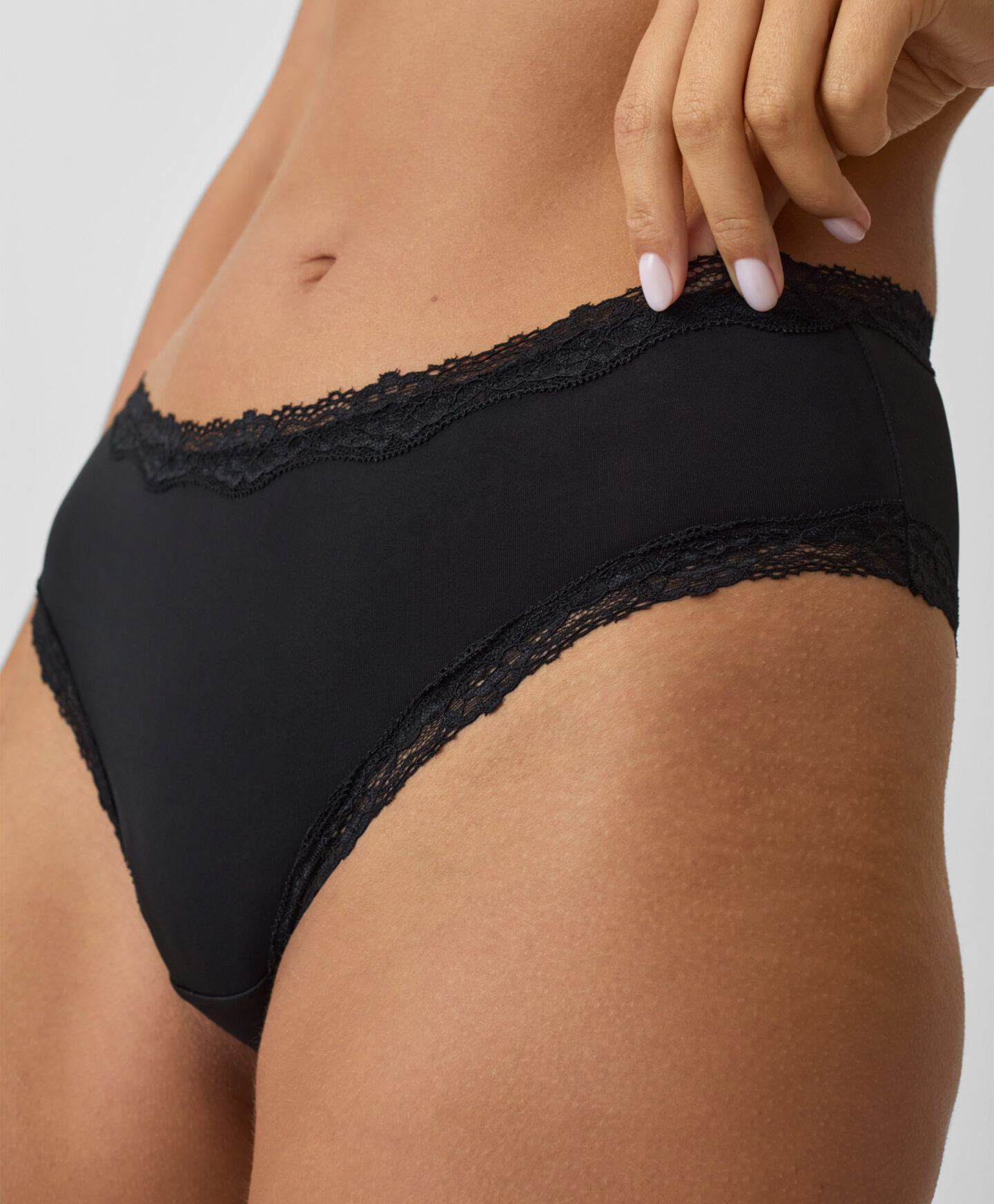 Kelnaitės su medvilniniu įsiuvu yra patogus kasdienis pasirinkimas. Elegantiška juoda spalva ir nėriniai suteikia jausmingumo. Kelnaitės puikiai priglunda prie kūno ir pabrėžia figūros privalumus. Jų nesimato po drabužiais, todėl jos suteikia pasitikėjimo savimi ir užtikrina diskretiškumą.