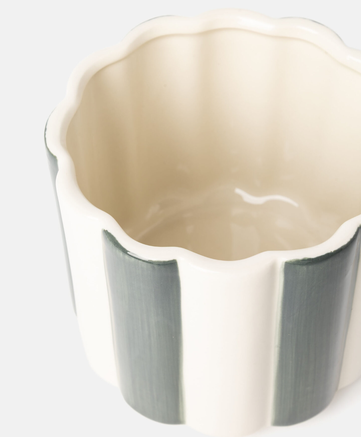 Dryžuotas keraminis gėlių vazonas sudaro rinkinį su tokio pat rašto vaza. Jis ne tik išryškins jūsų augalų grožį, bet ir taps unikalia interjero puošmena. Klasikinis raštas tiks ir prie modernių, ir prie klasikinių interjero detalių. Pagamintas iš patvarios akmens masės, todėl jį lengva valyti.