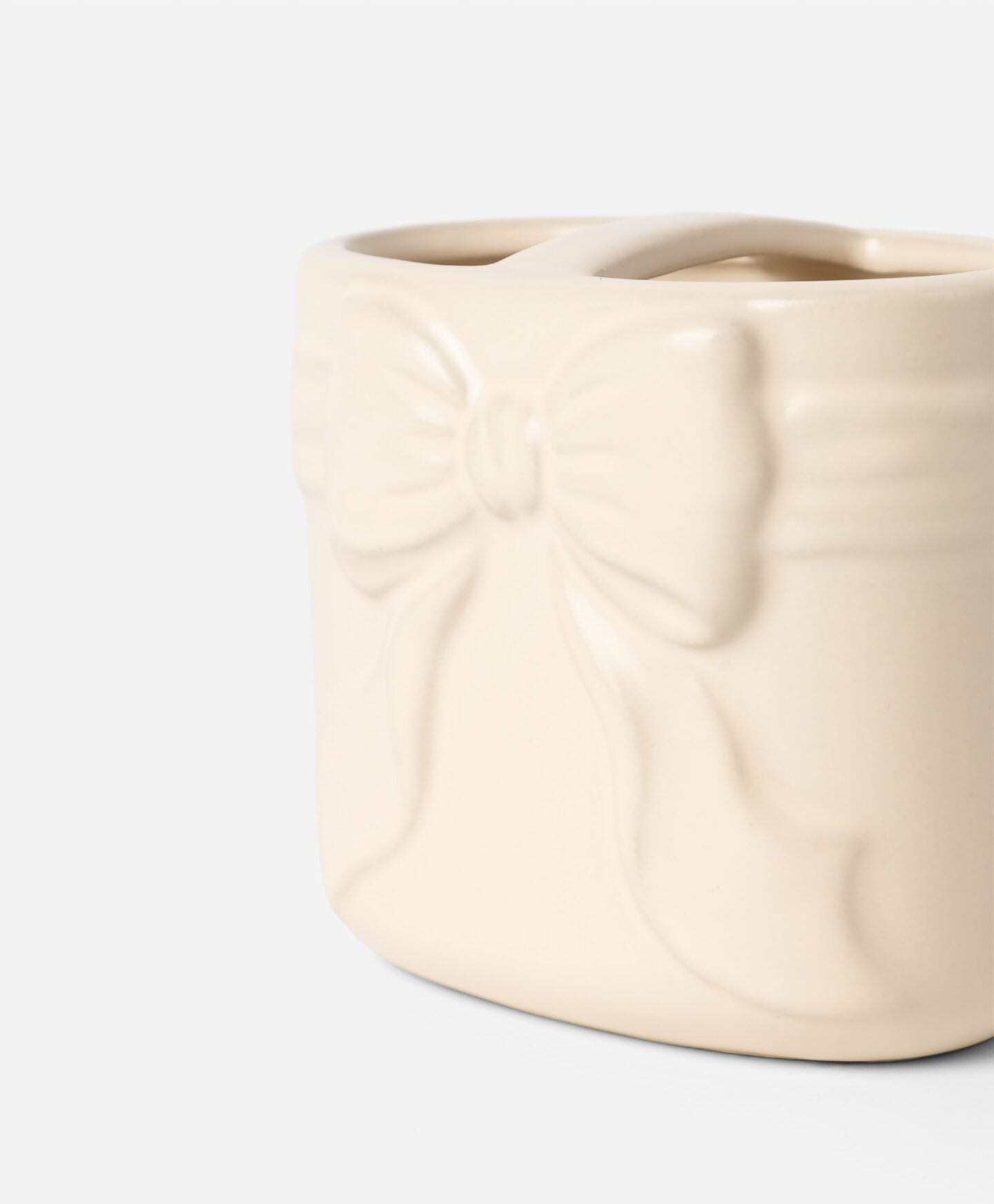 Keraminis indelis dantų šepetėliams su kaspinėliu turi du erdvius skyrius ir estetišką dizainą. Kaspinėlių motyvas puikiai dera prie kitų vonios kambario reikmenų iš kolekcijos. Iš akmens masės pagamintas indelis yra patvarus, atsparus kasdieniam naudojimui ir lengvai valomas.