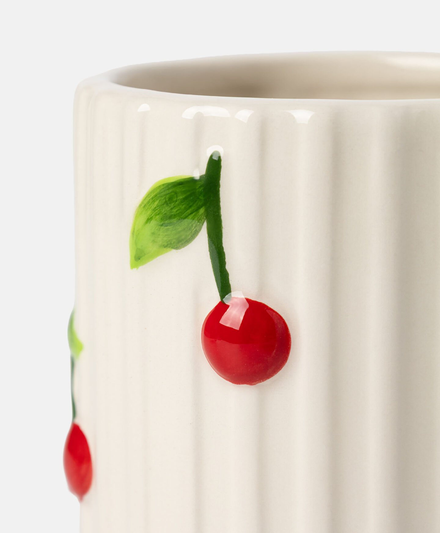 Kubek na szczoteczki we wzór wisienek sprawi, że na umywalce zapanuje porządek. Wykonany z trwałego dolomitu, kubek pomieści szczoteczki do zębów całej rodziny. Jest łatwy do utrzymania w czystości i odporny na codzienne użytkowanie. W ofercie znajdziesz więcej akcesoriów łazienkowych w ten sam wzór.