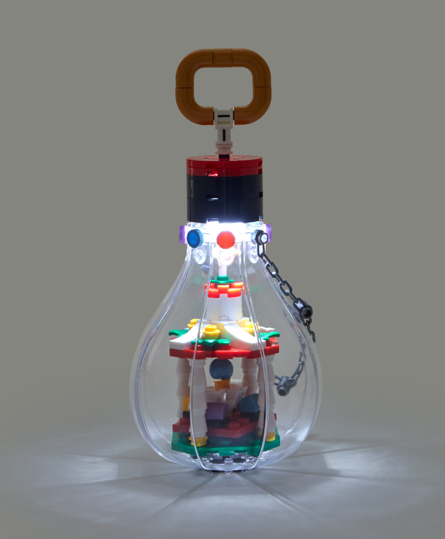 Lemputė su nameliu į interjerą įneša apsnigto miestelio atmosferą. Lemputės viduje paslėptas miniatiūrinis namelis šviečia malonia šviesa ir sukuria stebuklingą efektą. Ši dekoracija puikiai tinka Kalėdų stalui, komodai ar eglutei.