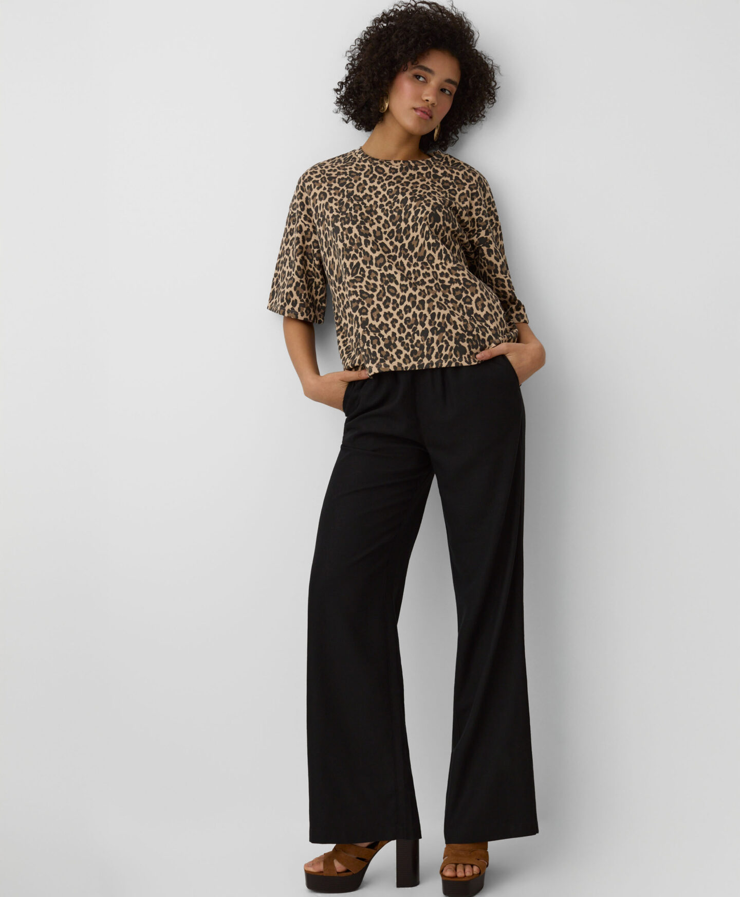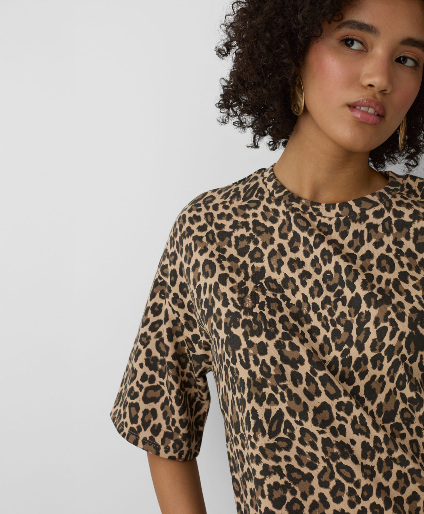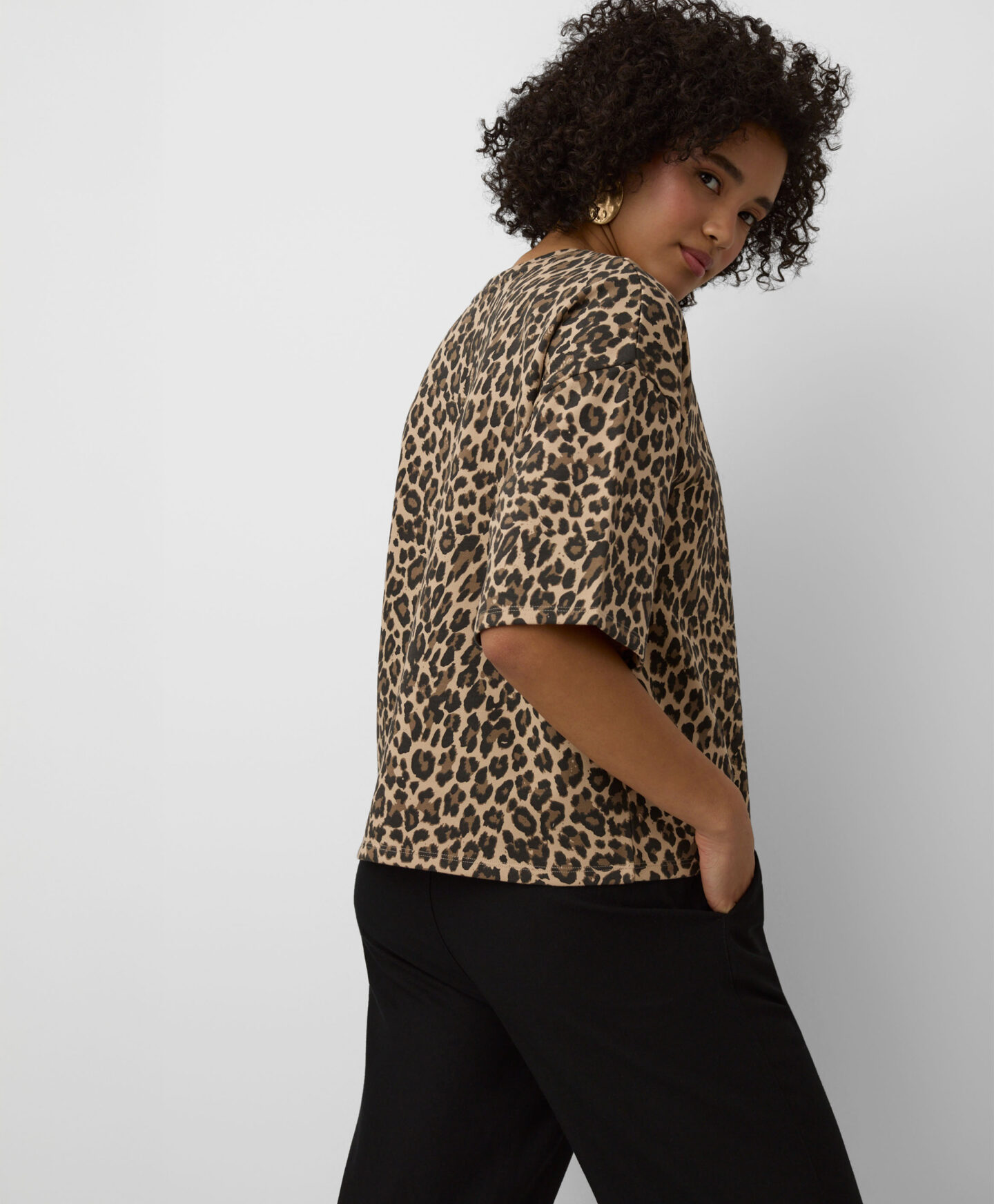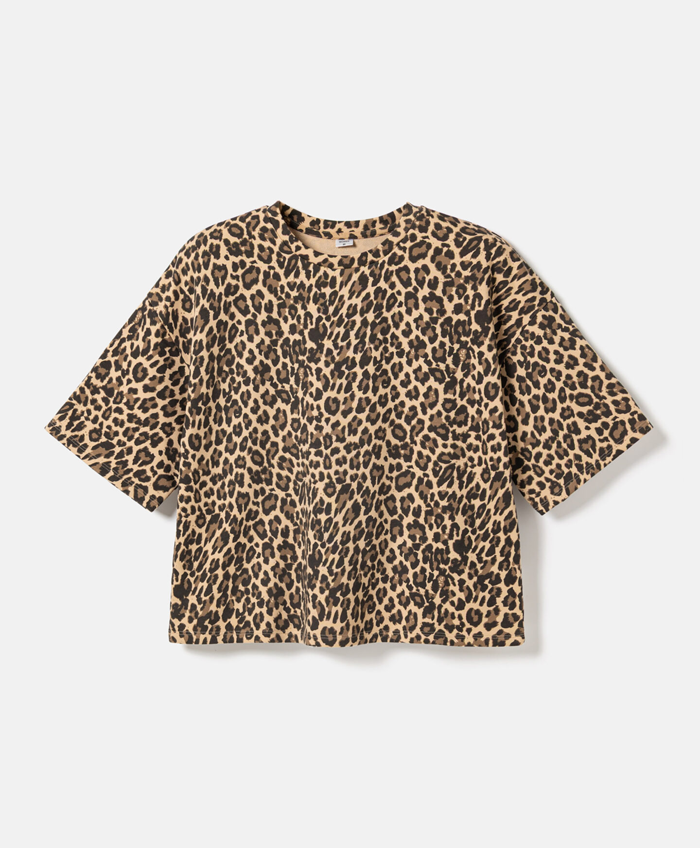 Leopardo rašto marškinėliai puikiai tiks gyvūnų raštų mėgėjams. Trumpesnis ir laisvesnis kirpimas patiks visiems laisvalaikio stiliaus gerbėjams. Marškinėliai puikiai derės su dviratininko tipo kelnėmis, laisvais šortais ar džinsais.