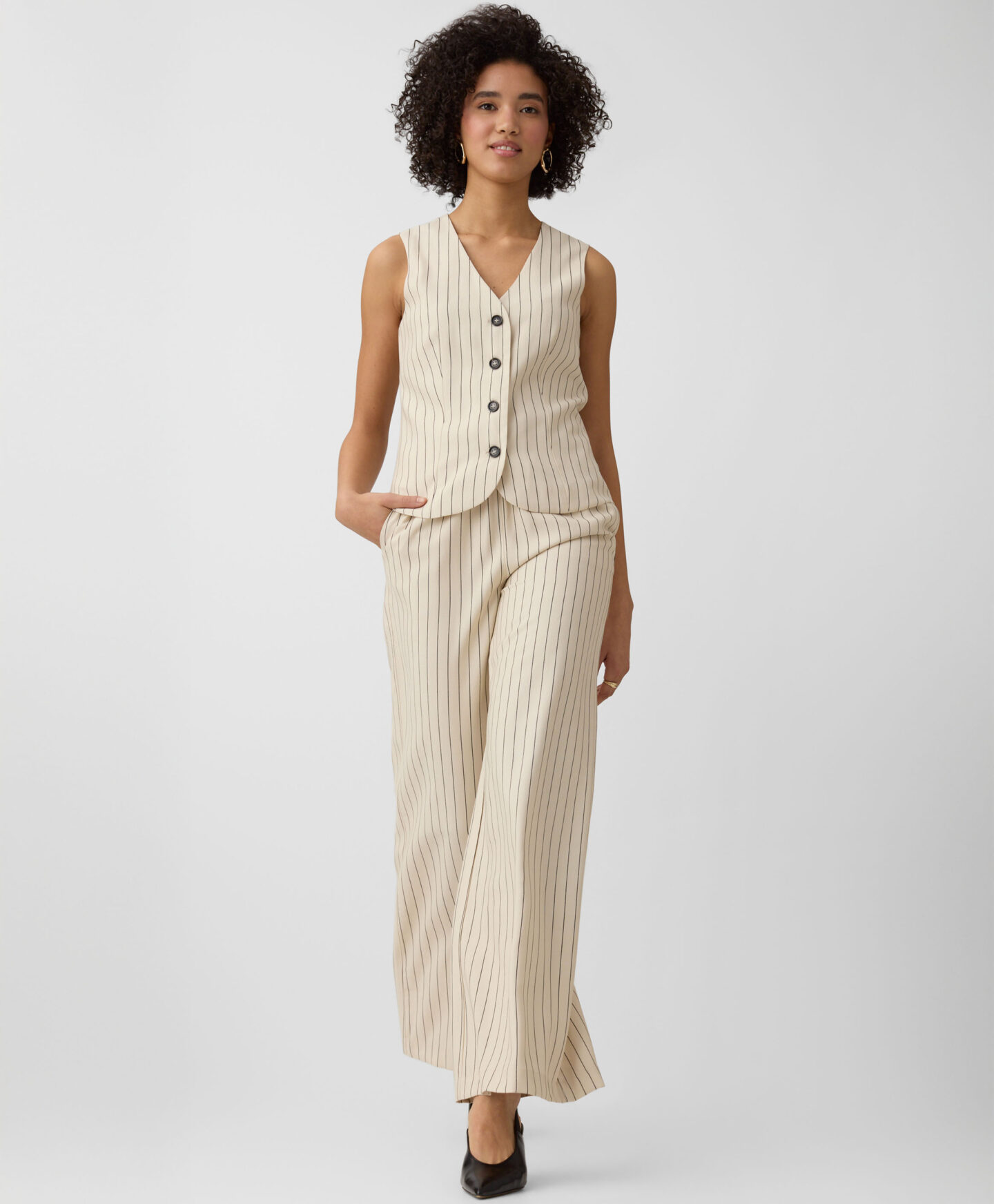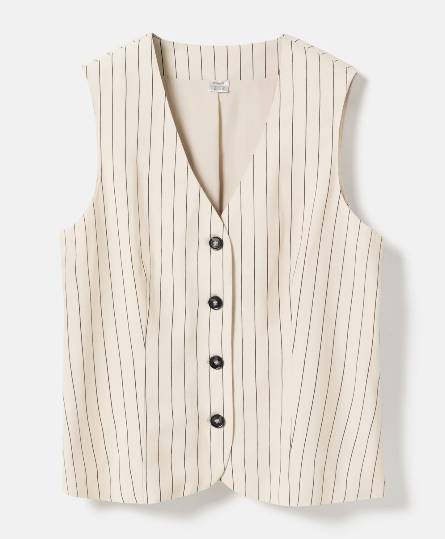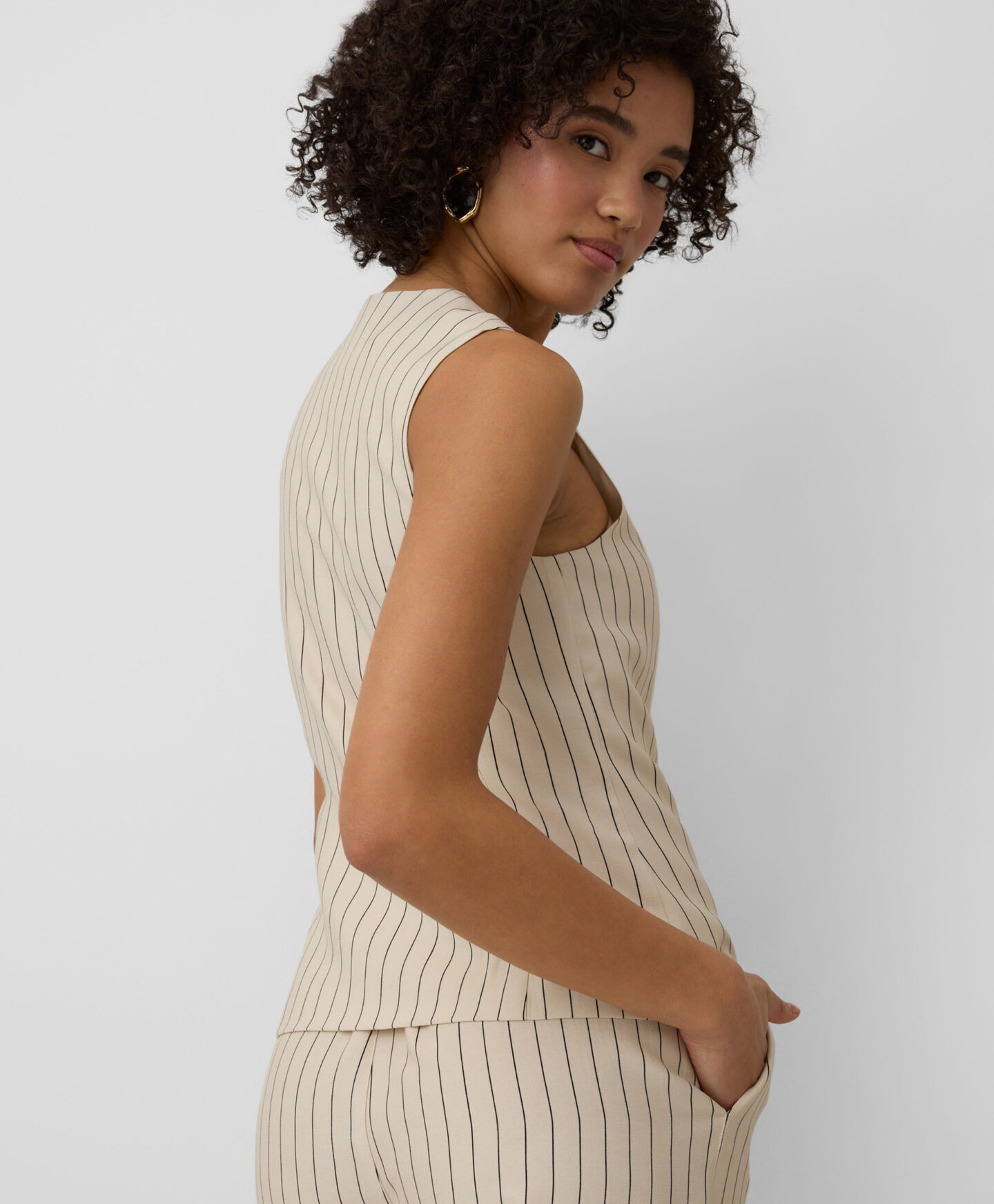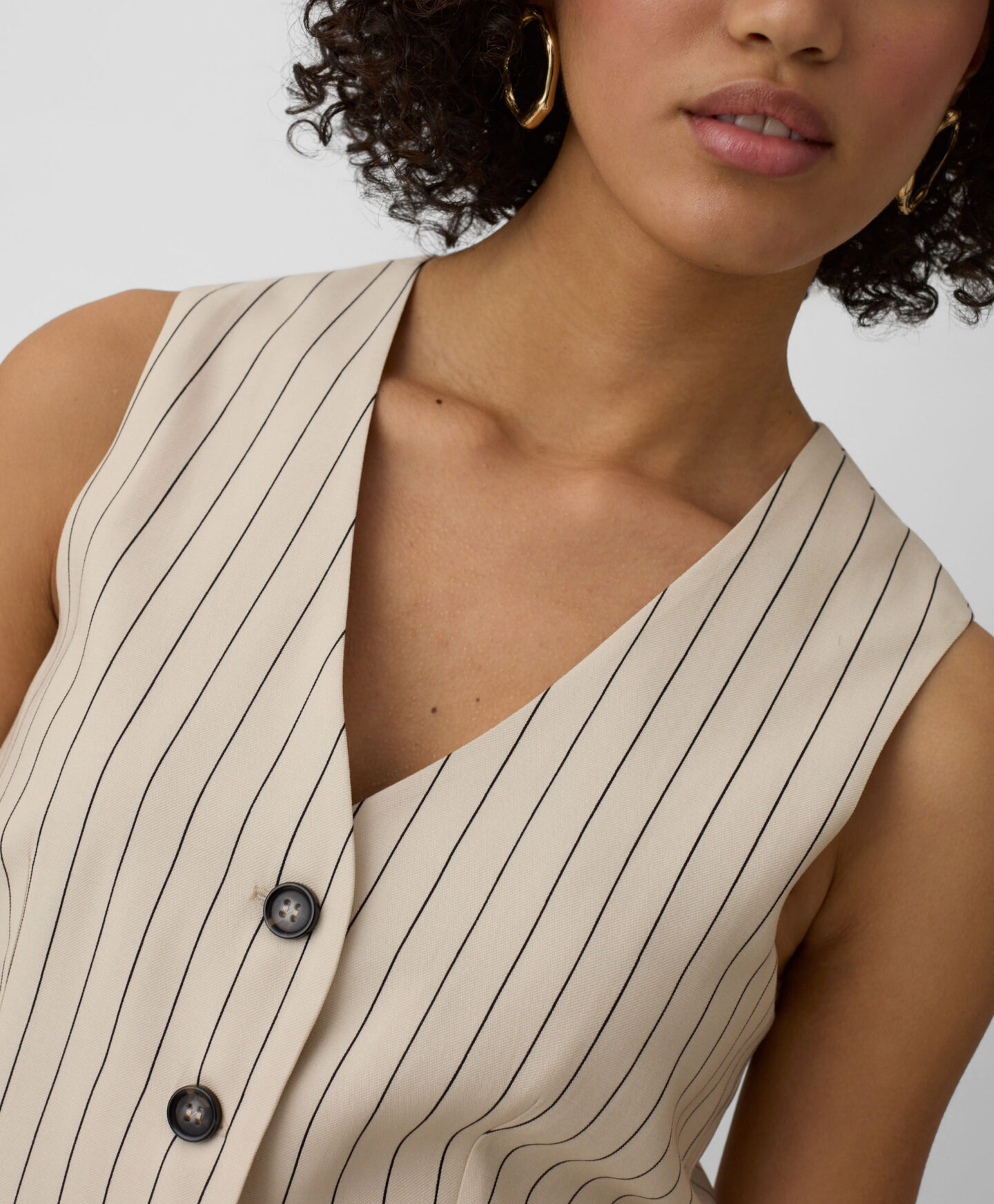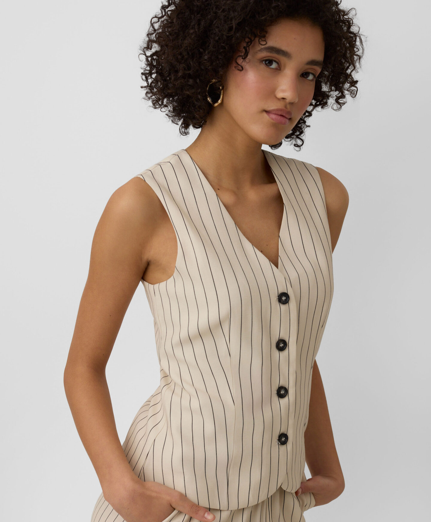 Ši dryžuota liemenė puikiai dera su kolekcijos kelnėmis. Sudėtyje yra daug viskozės, liemenė lengva, laidi orui ir puikiai tinka šiltoms dienoms. Santūri spalva lengvai derinama.
