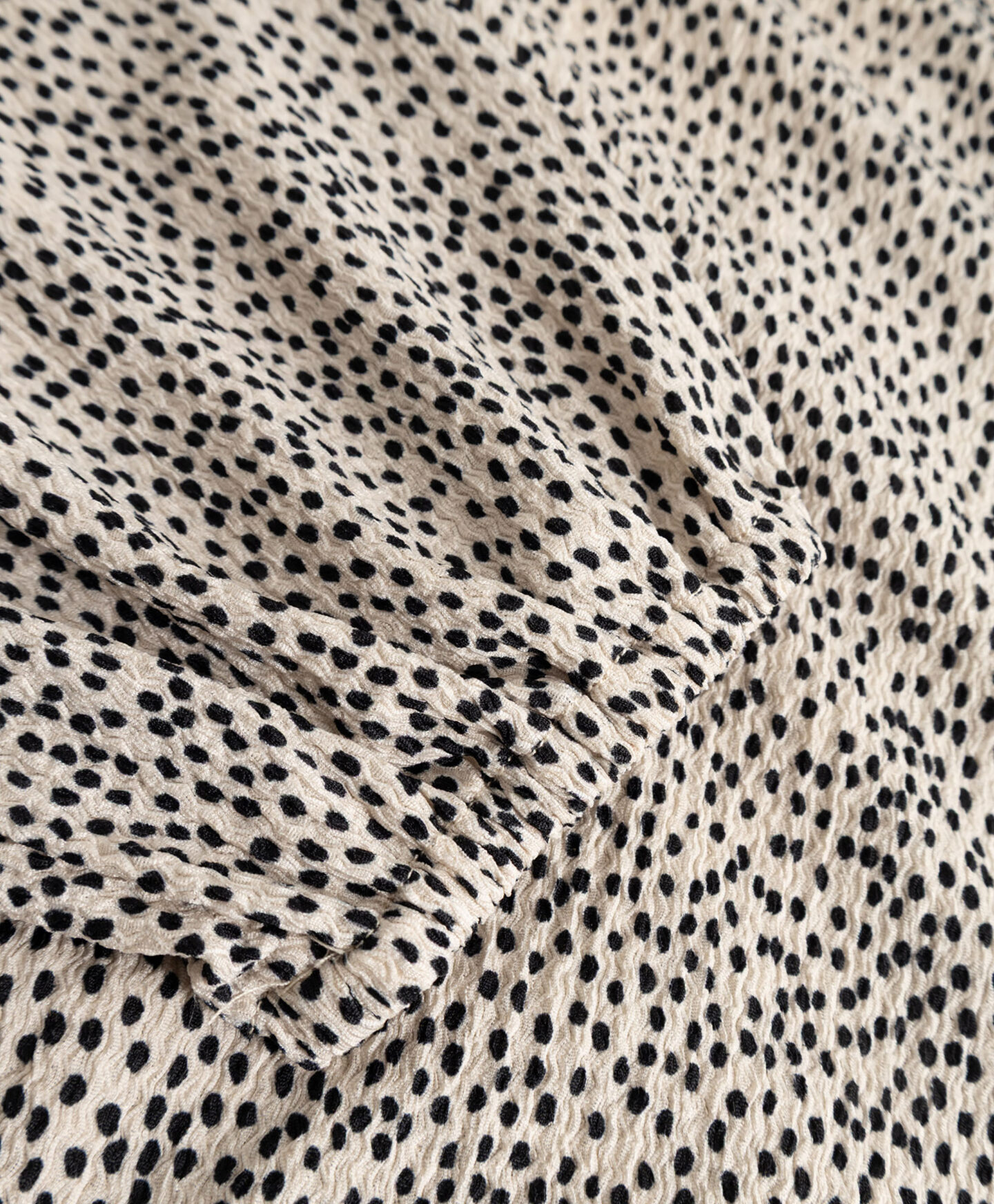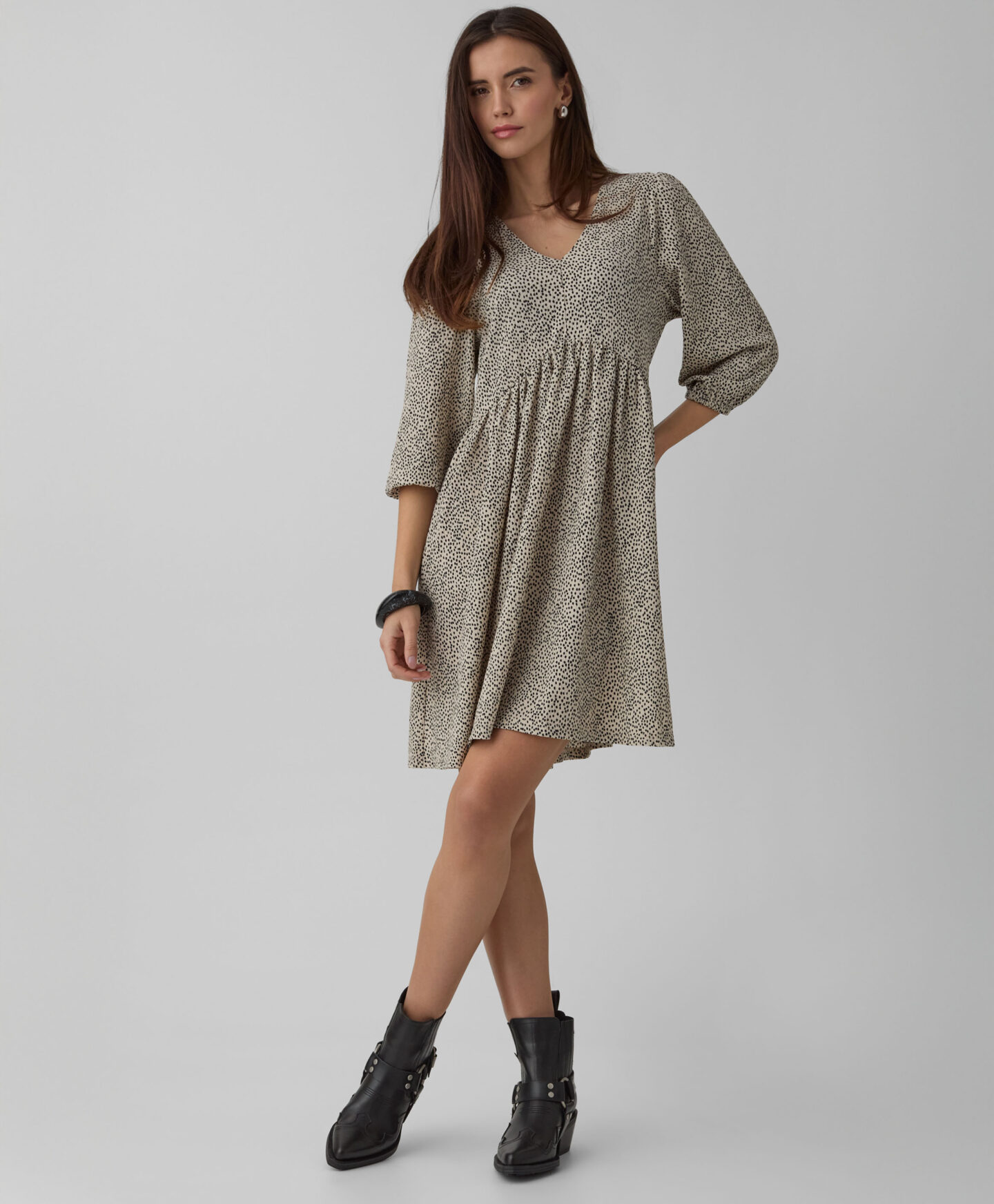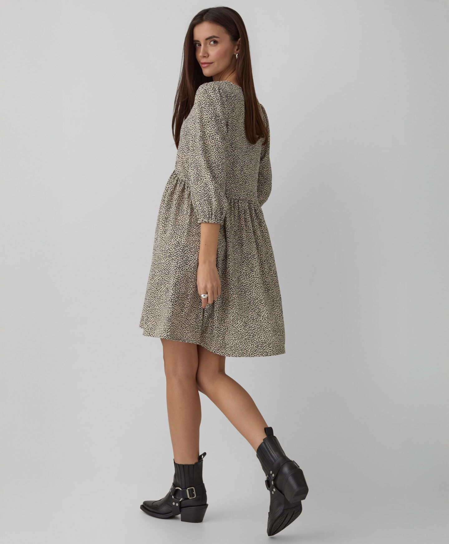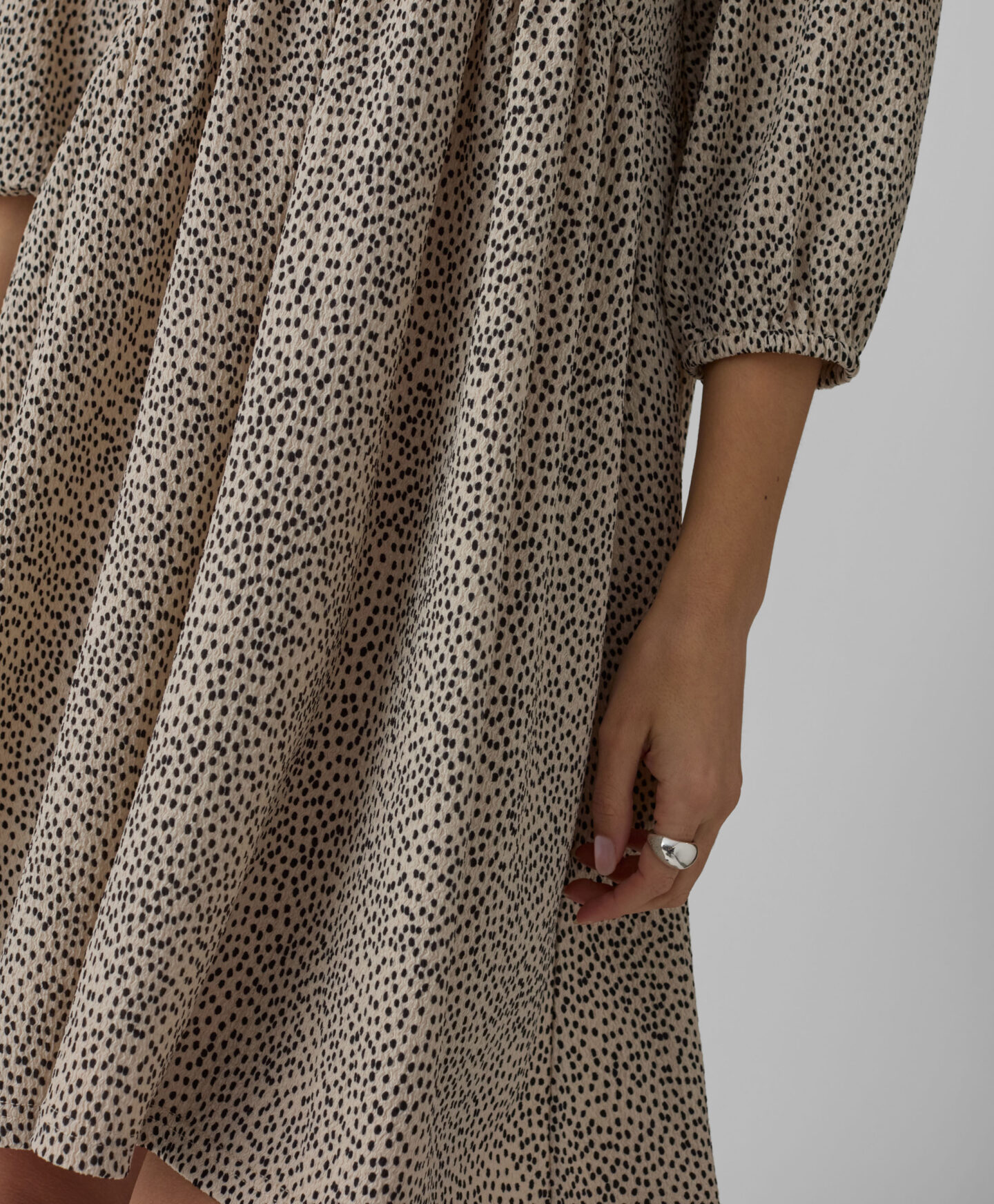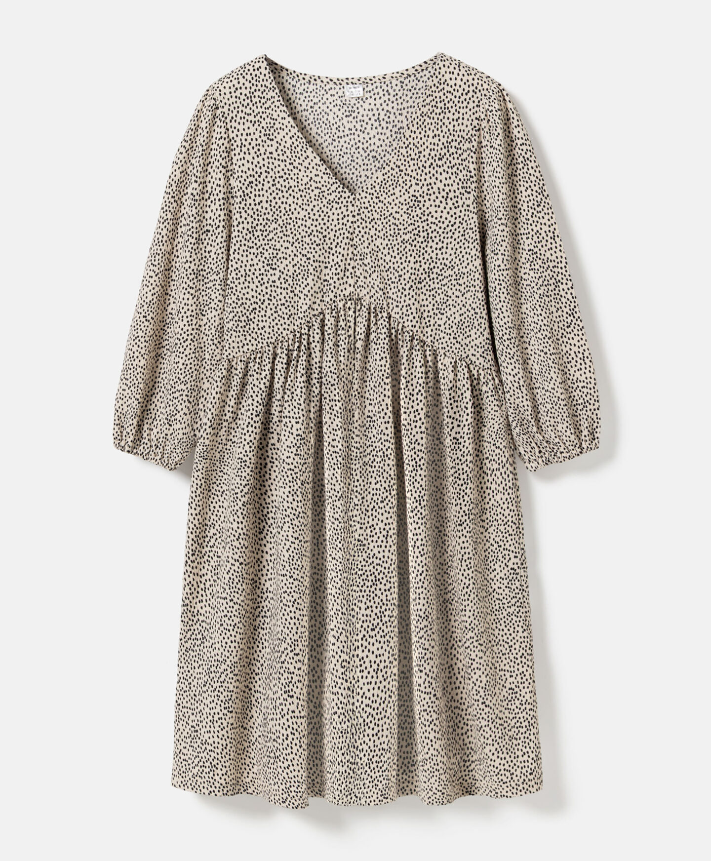 Marga suknelė išsiskiria netaisyklingu raštu. Paraukimai sukuria trimatę formą, kuri modeliuoja siluetą. Elegantiška V formos iškirptė pabrėžia kaklą ir suteikia lengvumo visam įvaizdžiui. Minkštas audinys užtikrina patogų dėvėjimą visą dieną. Prie suknelės galite avėti tiek sportinius batelius, tiek balerinos batelius ar aulinukus.