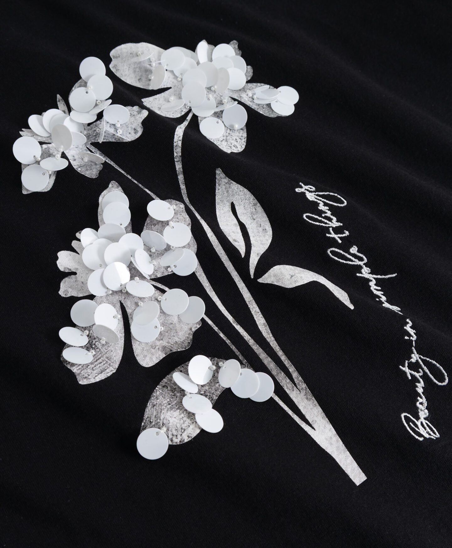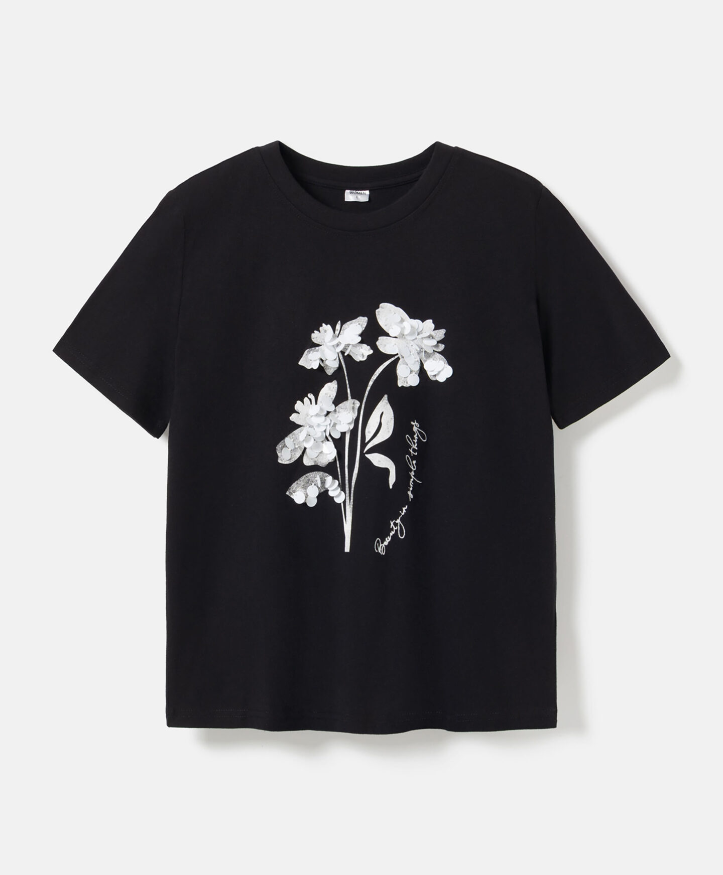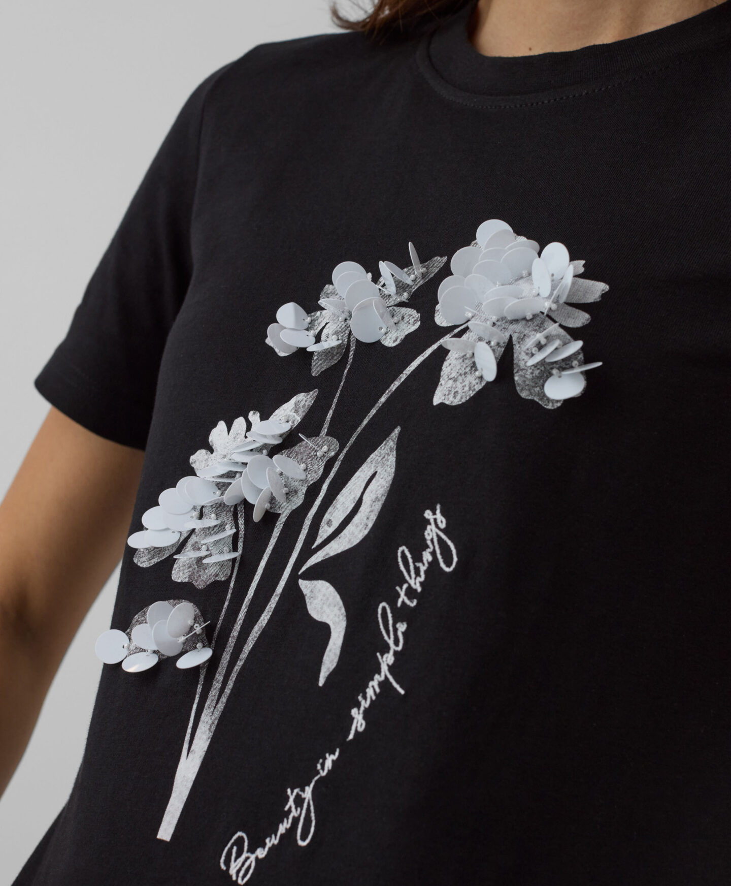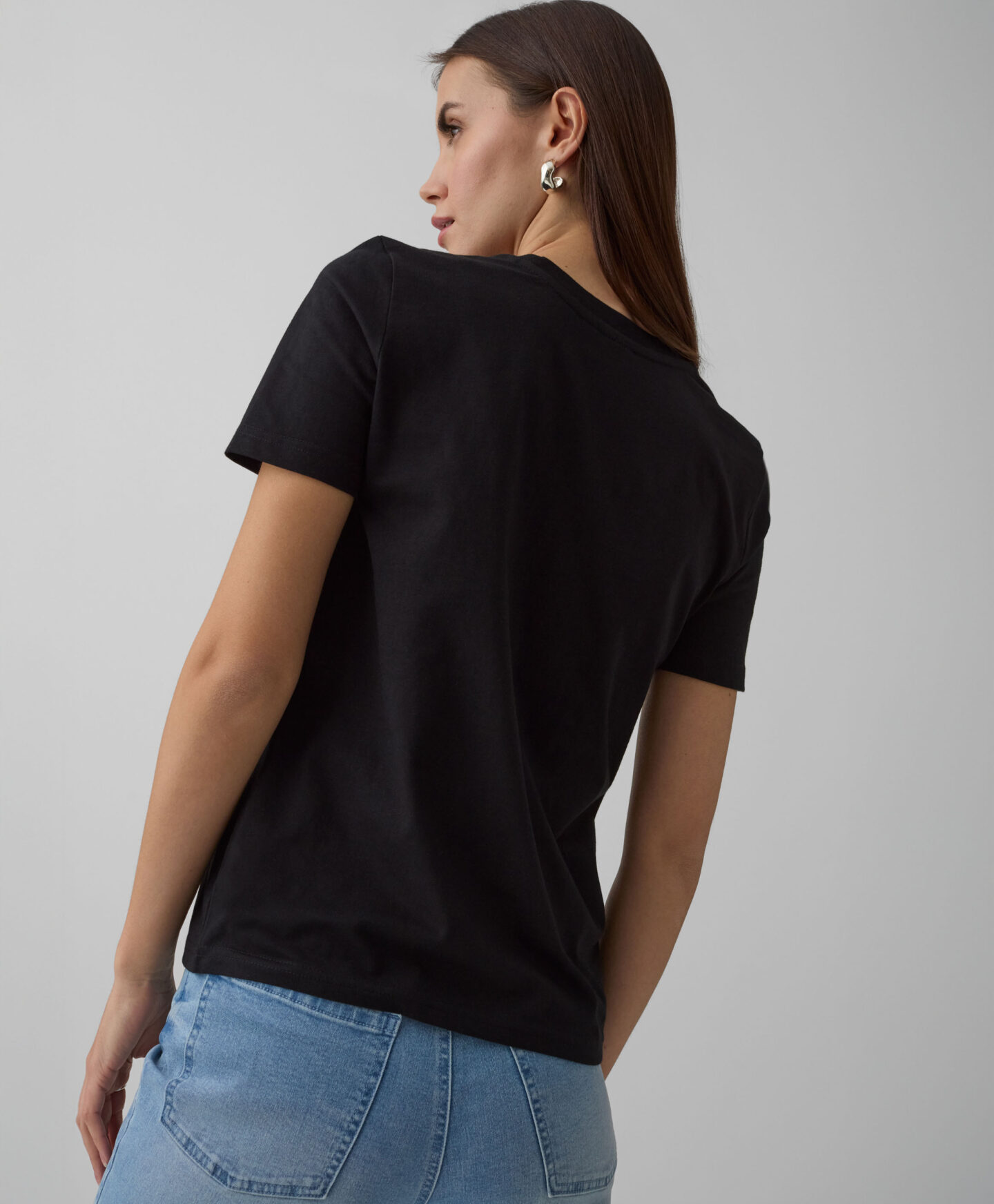 Marškinėliai, 100 % medvilnės, su blizgia aplikacija spindės kiekvienoje spintoje! Klasikinis modelis, blizgi aplikacija priekyje ir universali spalva – stilingas derinys, idealiai tinkantis daugeliui progų. Marškinėliai puikiai atrodys su švarkeliu ir sėkmingai papildys duetą su elegantišku sijonu. Minkšta medžiaga užtikrina patogumą dėvint.