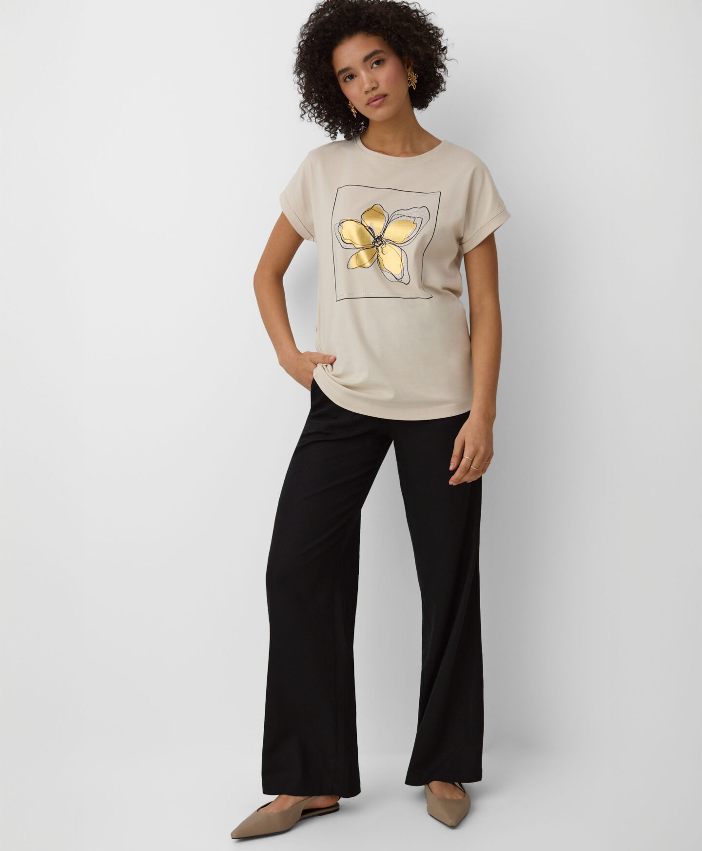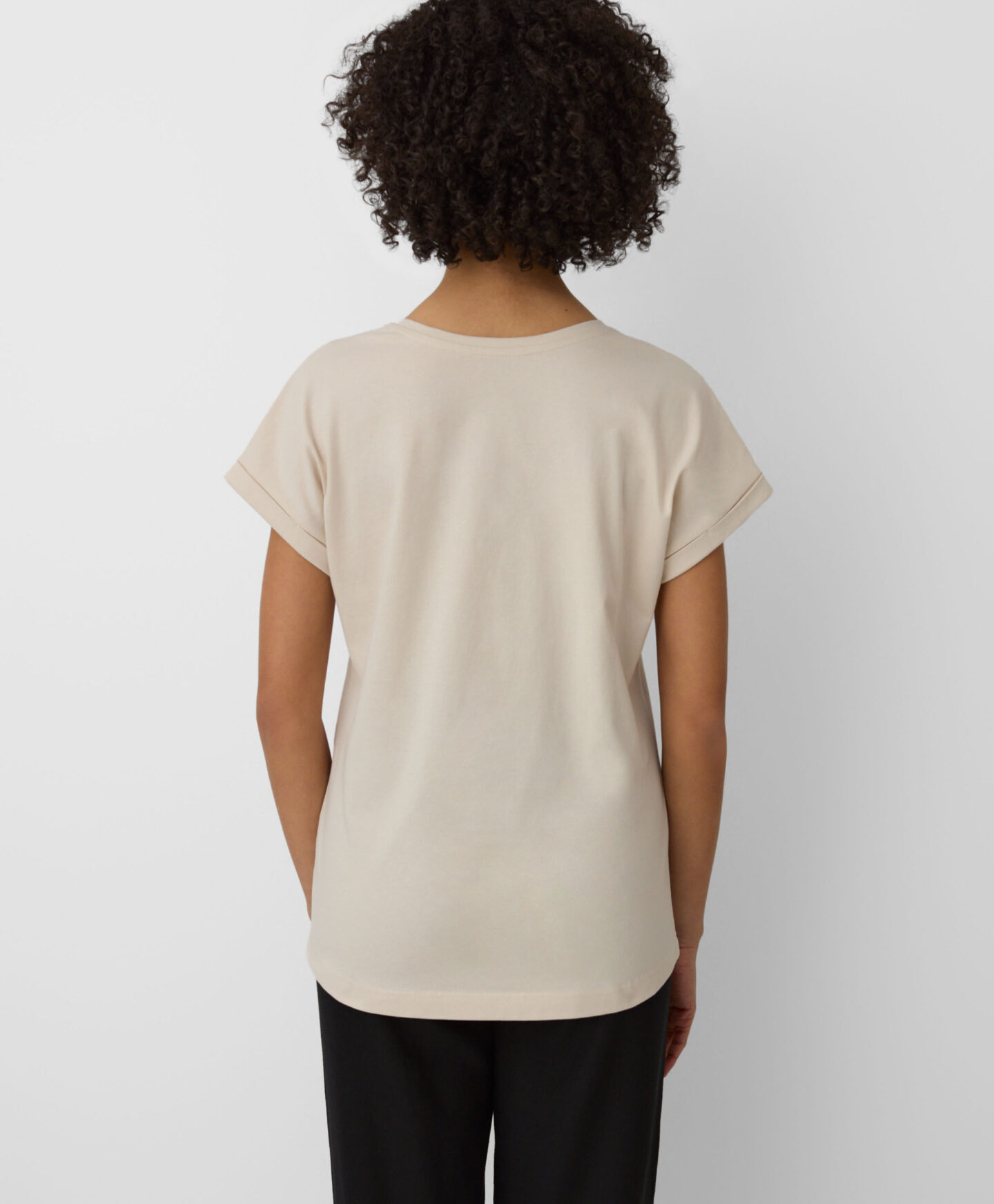 Šie 100 % medvilnės marškinėliai taps tikru akcentu garderobe. Jie patogūs, pralaidūs orui ir leidžia odai kvėpuoti. Puikiai derės su mėgstamais džinsais, sportinėmis kelnėmis ar elegantiškomis cigaretės silueto kelnėmis.