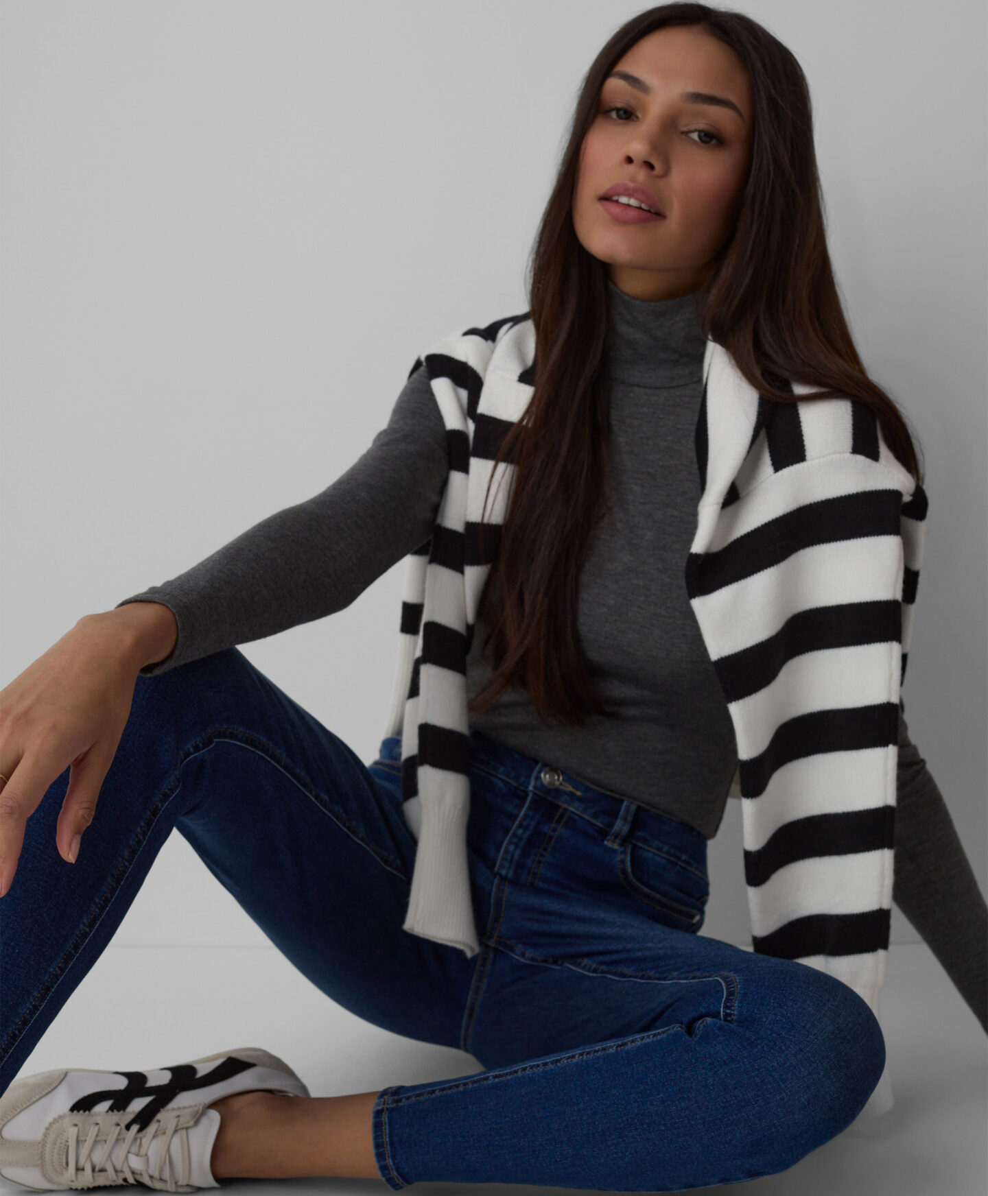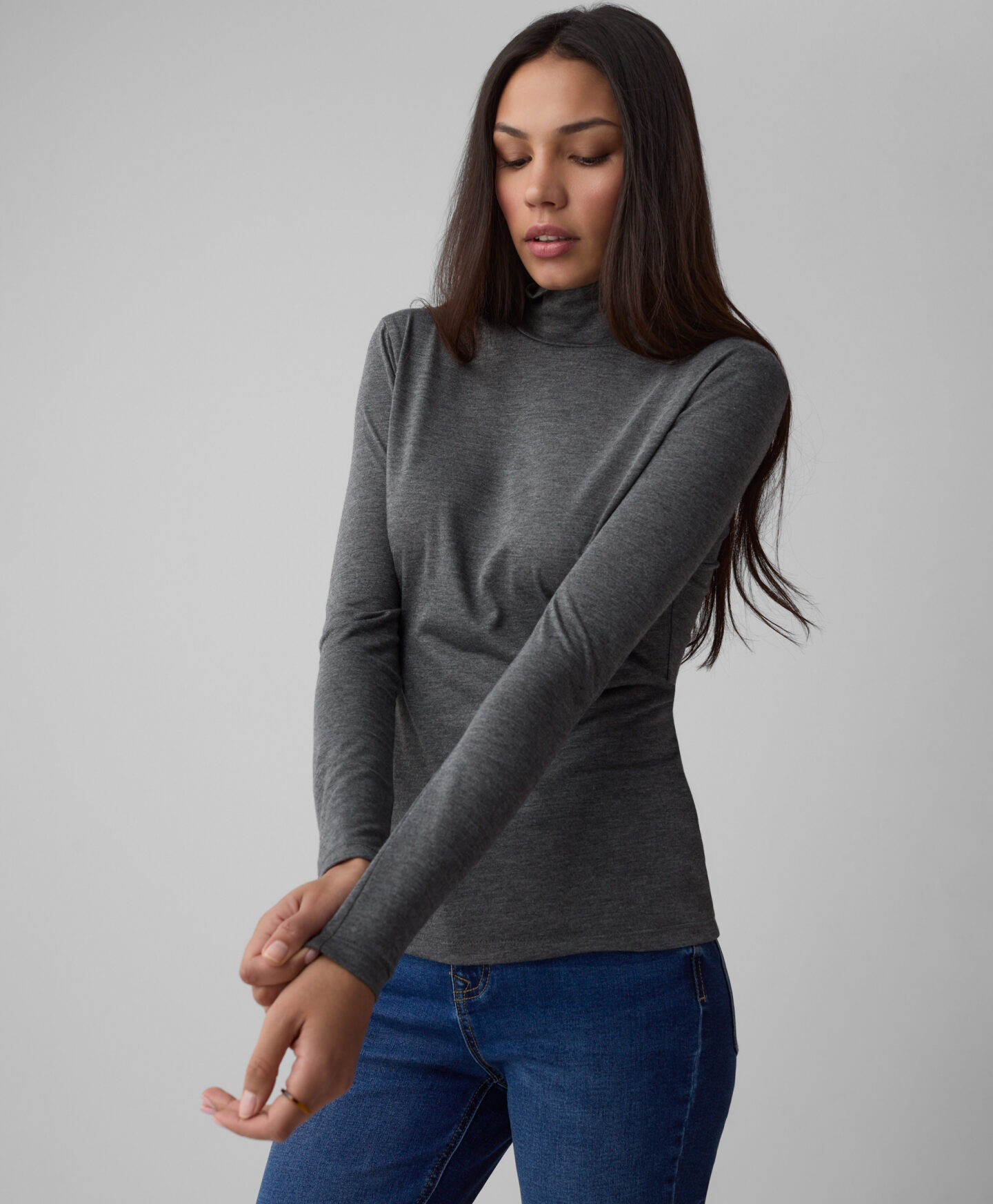 Marškinėliai ilgomis rankovėmis ir aukštu kaklu puikiai tinka šaltiems mėnesiams. Puikiai tinka po švarkeliu ar megztiniu. Jie tinka ir prie džinsų, ir prie elegantiškų kelnių. Universali spalva puikiai dera prie žiemos atmosferos ir leidžia sukurti daugybę derinių.