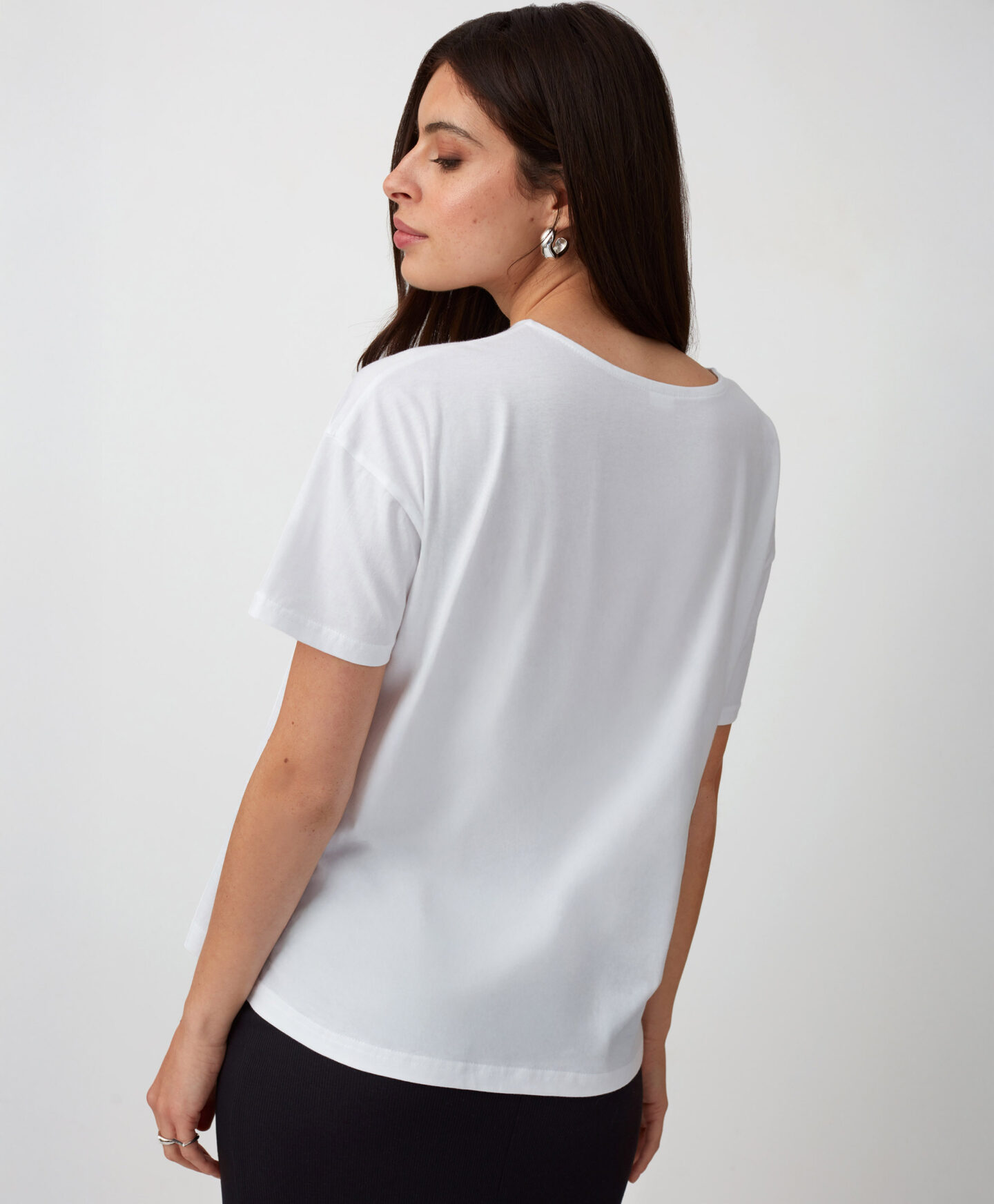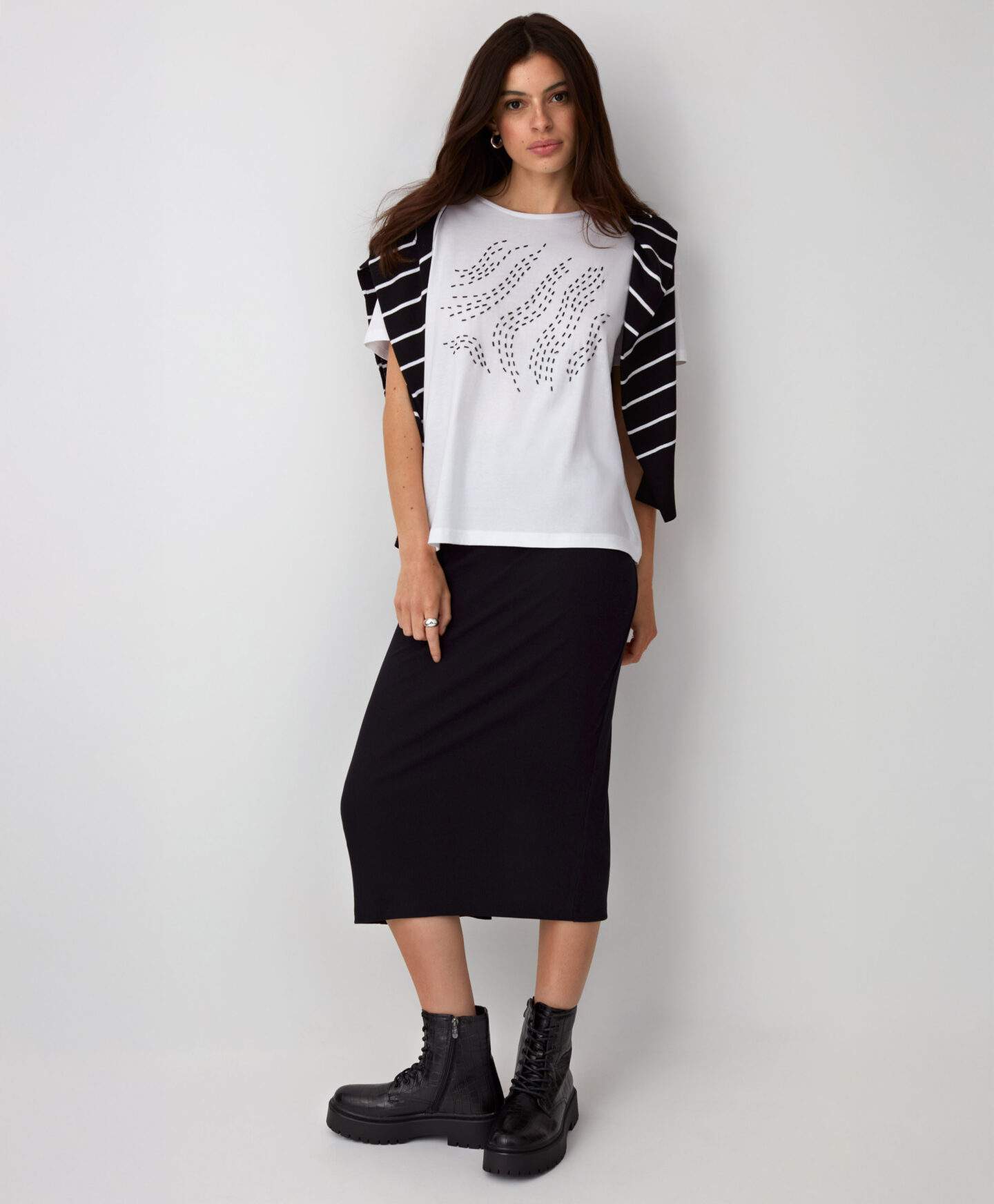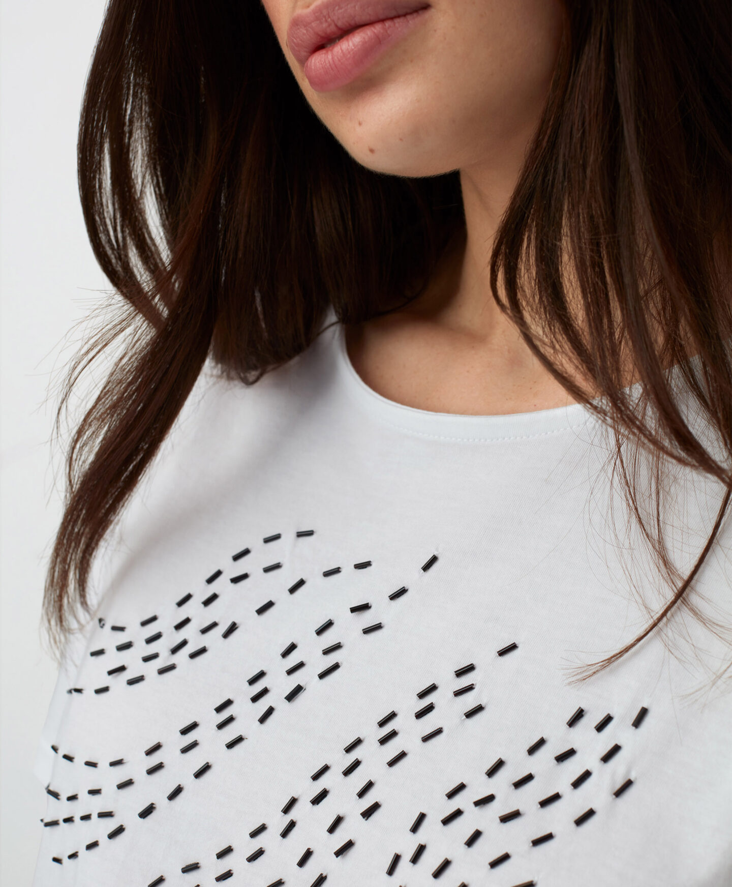 Marškinėliai su aplikacija, pasiūti iš 100 % medvilnės, yra puikus patogumo ir gero stiliaus derinys. Minkšta medvilnė suteikia patogumo, o madinga spauda suteikia marškinėliams unikalumo. Jie puikiai tinka prie laisvalaikio aprangos, derinant su džinsais, šortais ar sijonais.