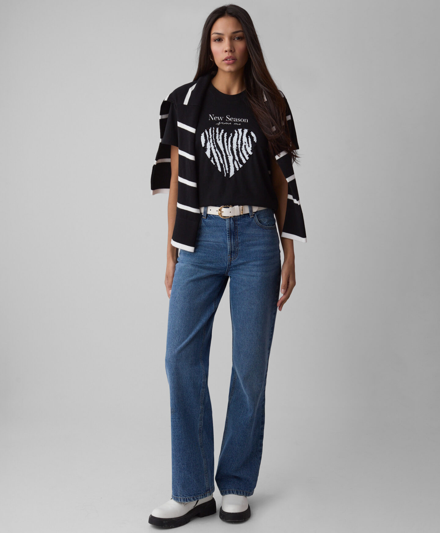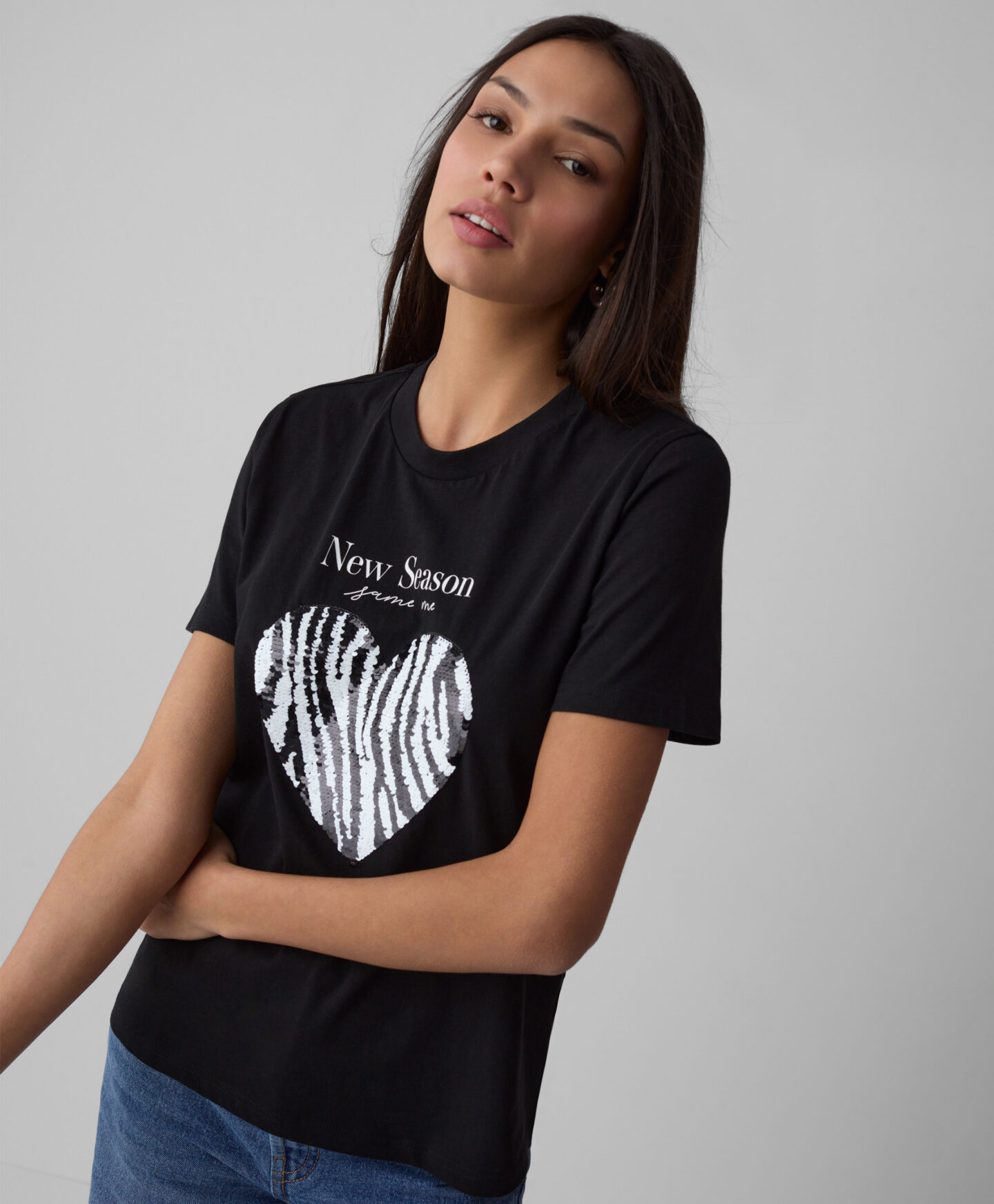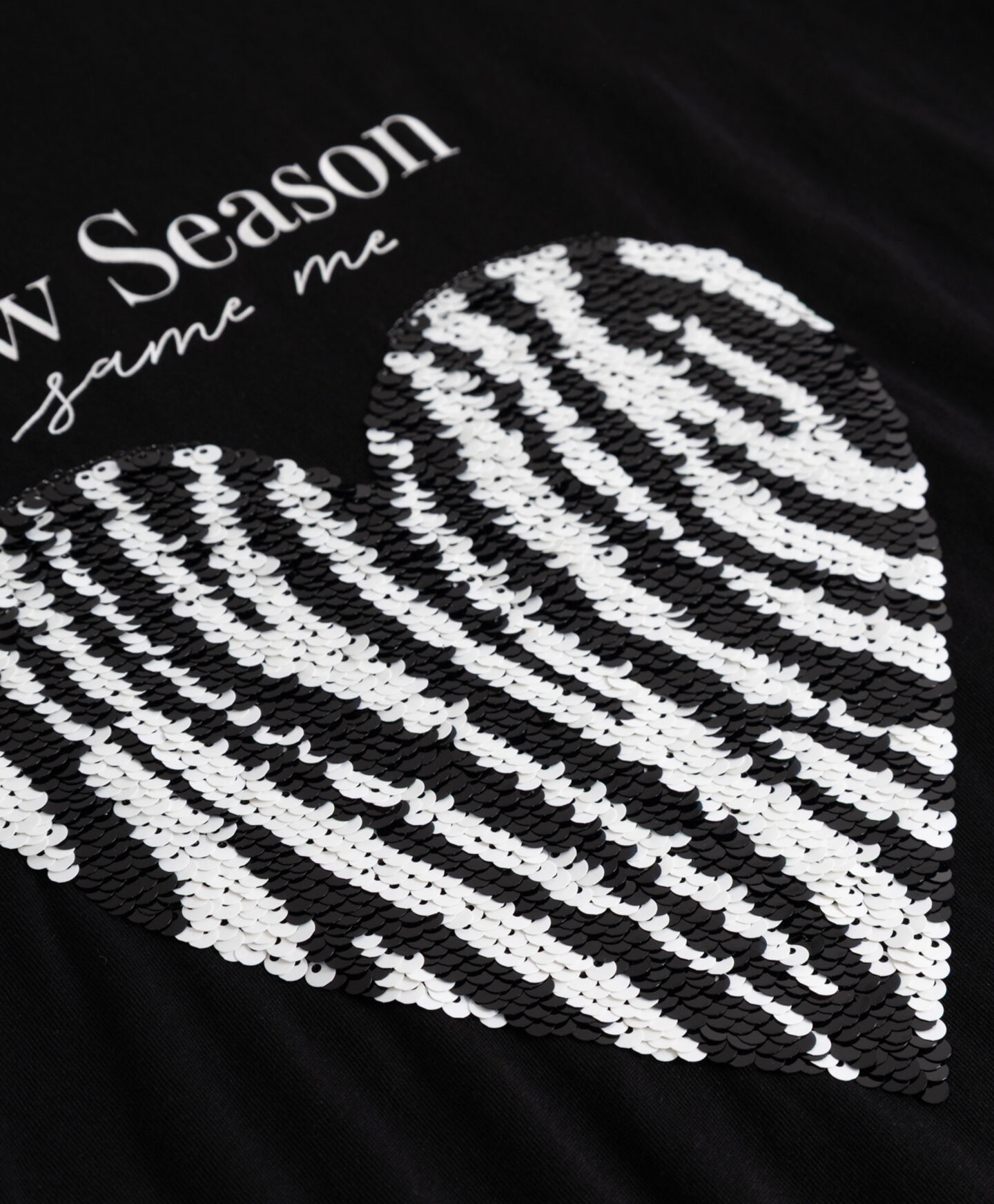 Marškinėliai su blizgučiais, pasiūti iš 100 % medvilnės, su zebro raštu, atkreipia dėmesį ir leidžia išsiskirti minioje. Jie puikiai dera su įvairia apranga. Juos galite derinti su džinsais ir odiniu švarkeliu, o ypatingomis progomis – su elegantišku sijonu ir aukštakulniais. Medvilnė švelniai apgaubia odą ir užtikrina komfortą visą dieną.