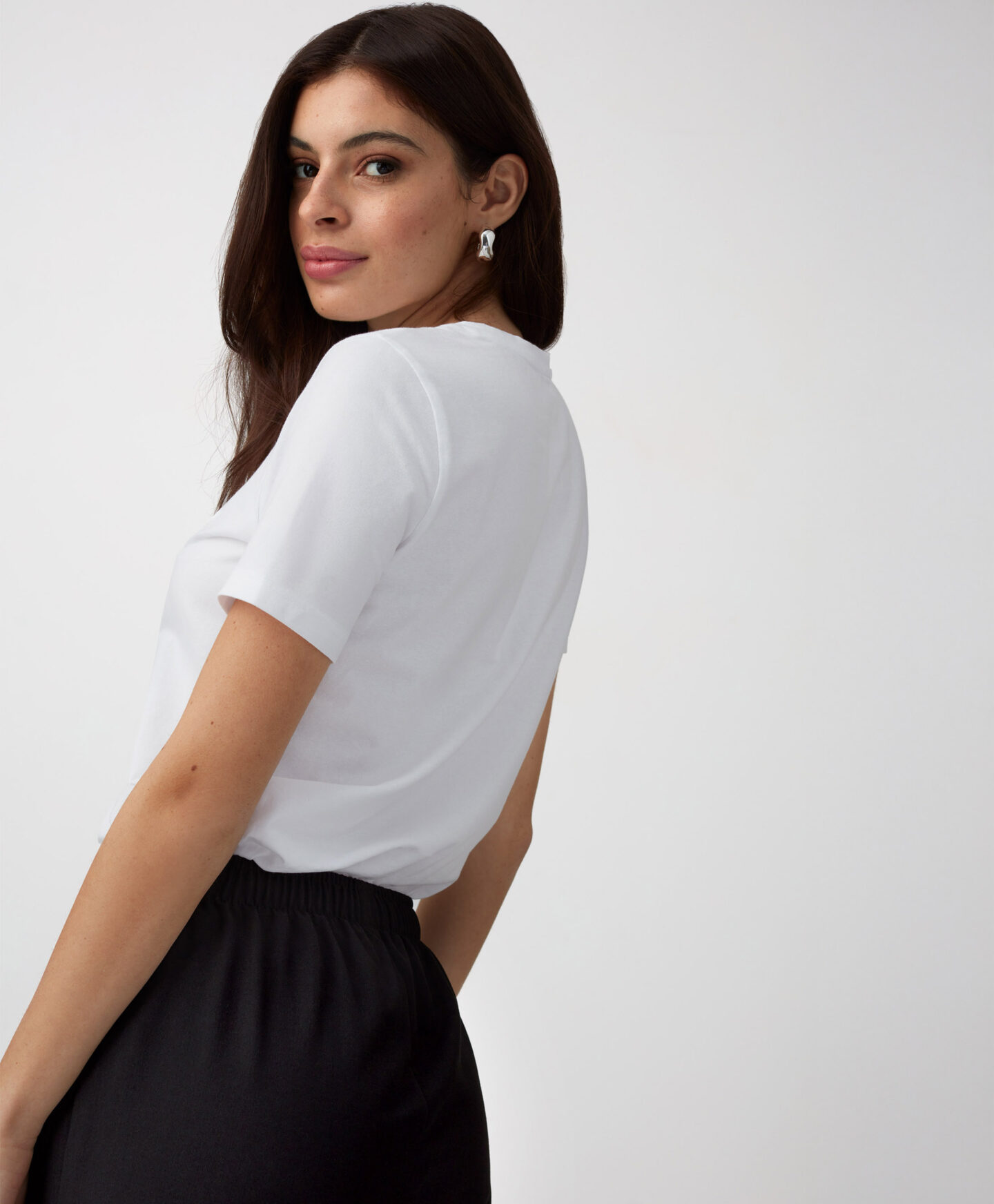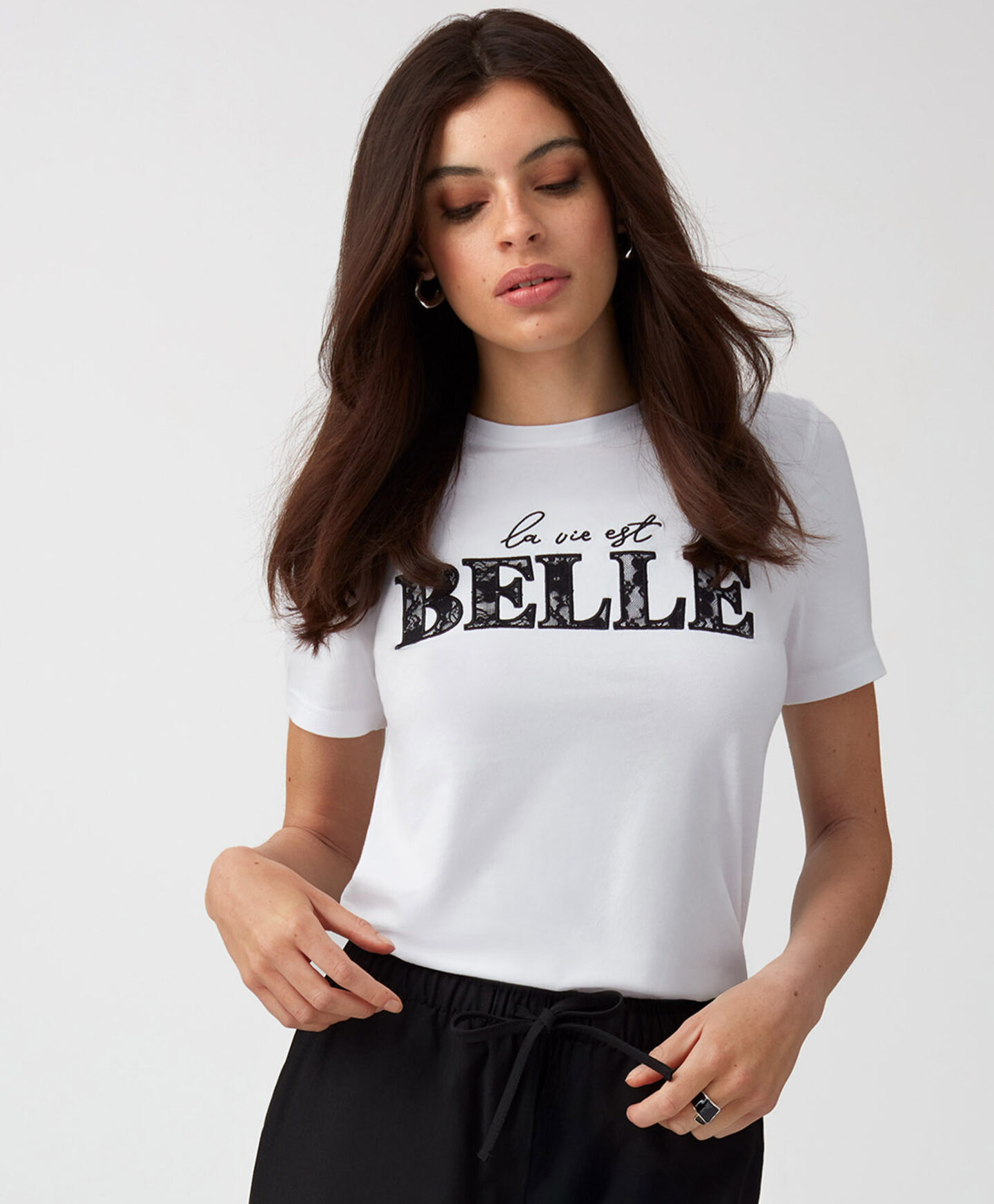 Marškinėliai su spauda, pasiūti iš 95 % medvilnės, derina klasikinį stilių ir patogumą. Marškinėliai užtikrina patogumą, o madingas raštas suteikia jiems unikalumo. Jie puikiai tinka prie laisvalaikio aprangos, derinant su džinsais, šortais ar sijonais.