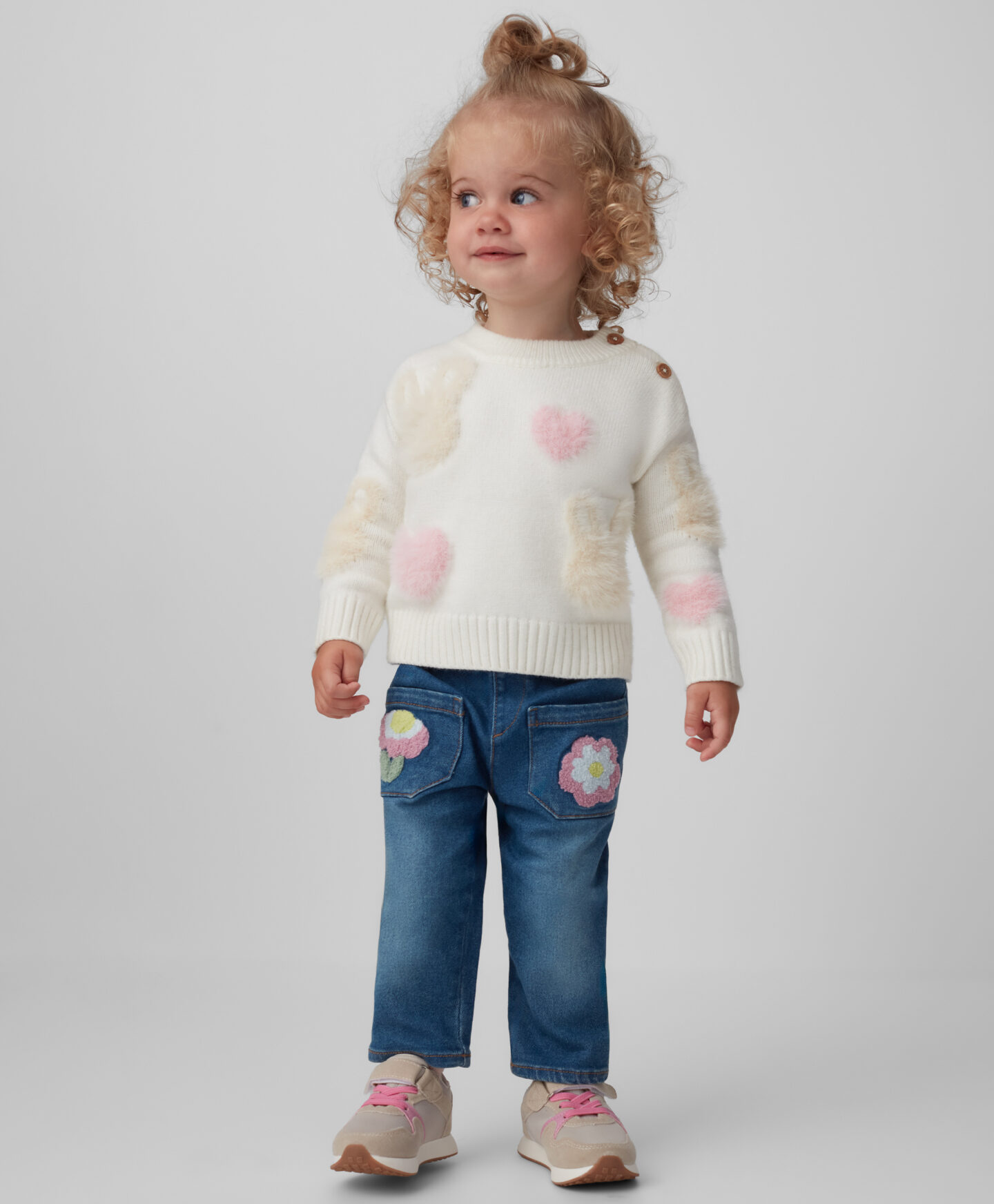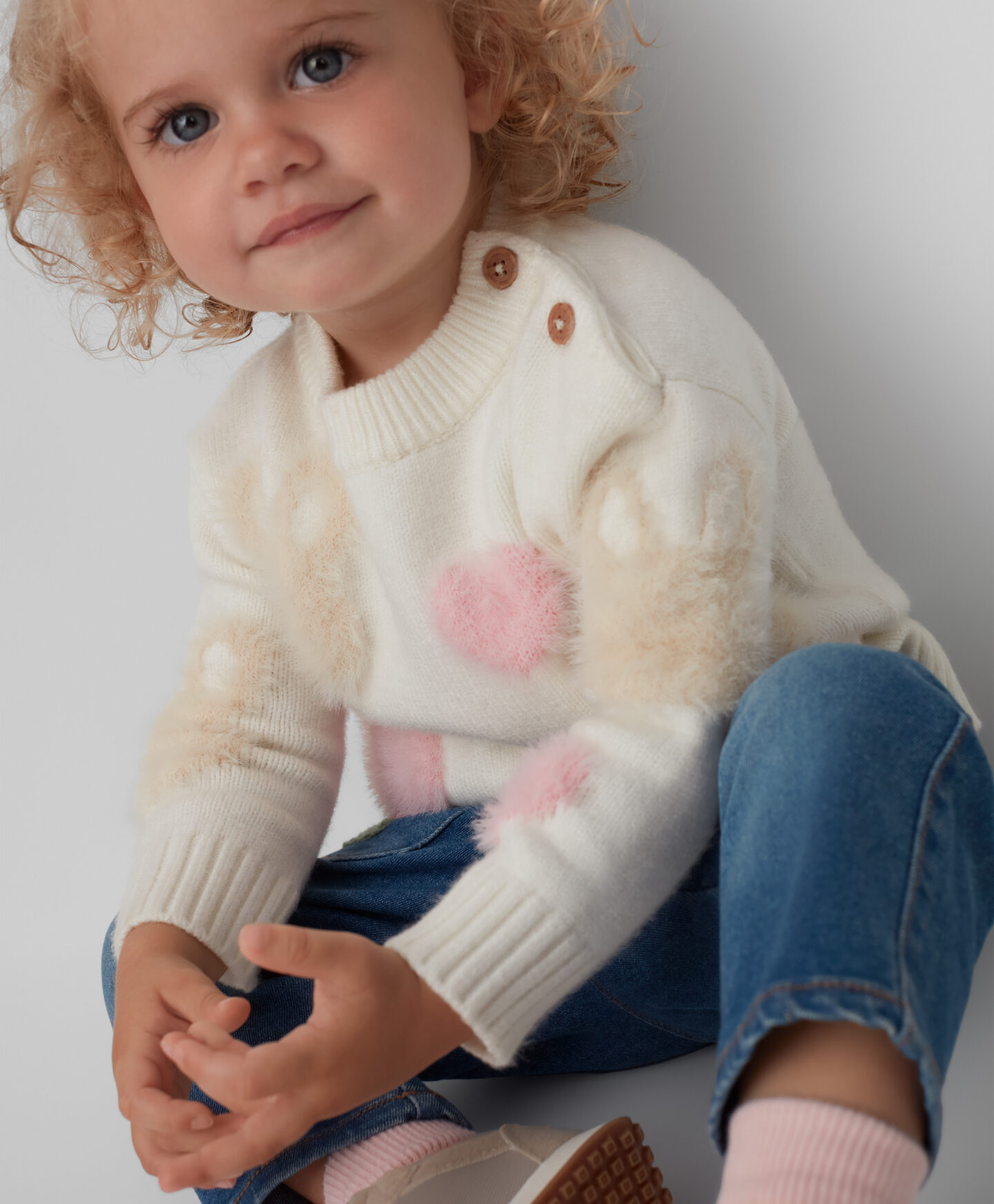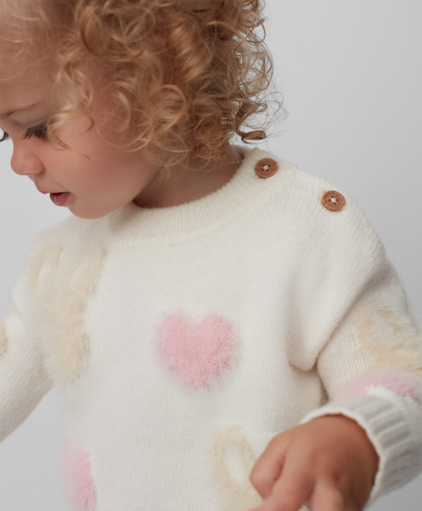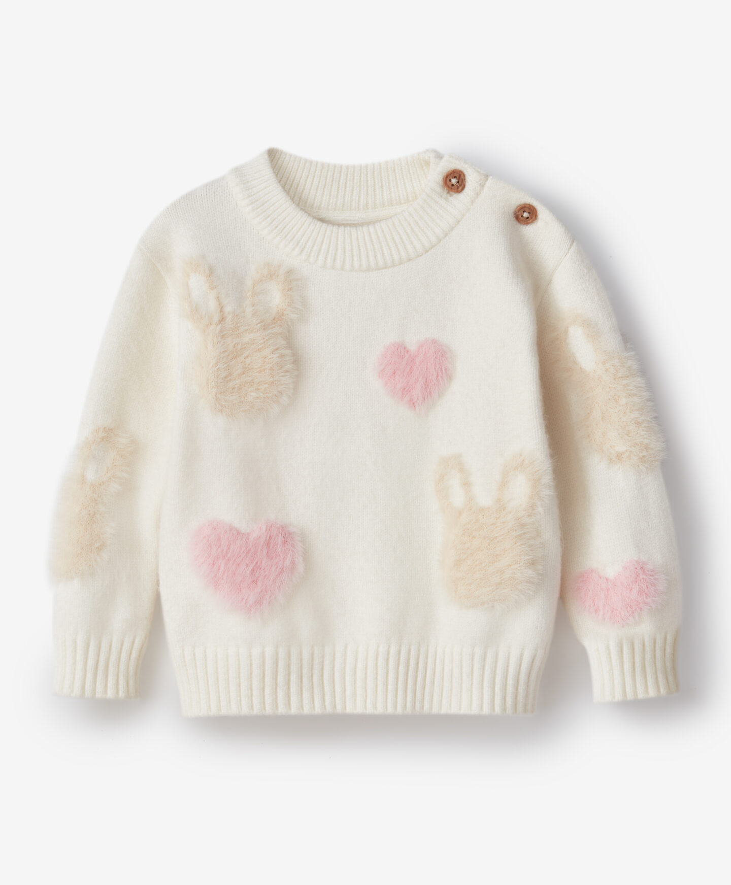 Megztinis su sagomis mažyliams – patogus kasdienis pasirinkimas. Užsegimas sagomis palengvina mažylio aprengimą, o kiškučių ir širdelių raštas suteiks žavesio bet kokiai aprangai. Megztinis yra šiltas, minkštas ir švelniai priglunda prie odos.