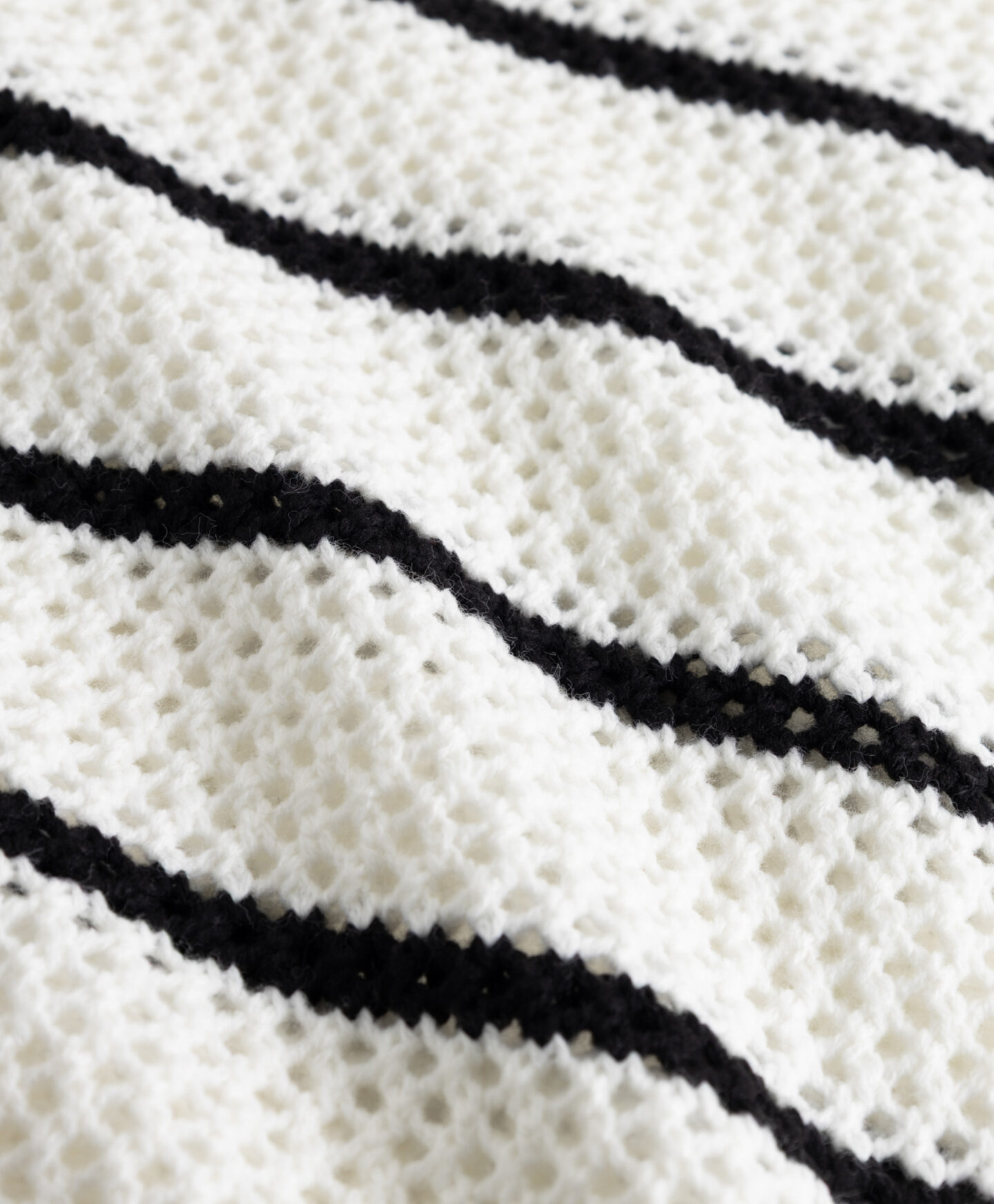 Dryžuotas megztinis su nėriniais – madingas pasirinkimas. Modelis ne tik pralaidus orui, bet ir gražiai atrodo. Šis megztinis yra subtilus bet kokios aprangos akcentas – ir kasdienės, ir elegantiškesnės.