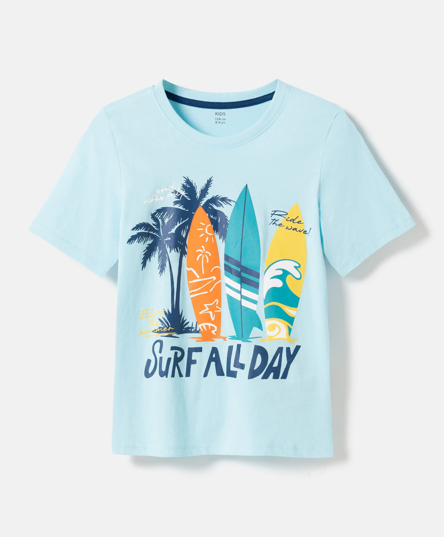 Šie mėlyni vaikiški marškinėliai, pasiūti iš 100 % medvilnės, puikiai tinka jauniesiems banglenčių sporto entuziastams. Medvilnė yra nepaprastai švelni odai ir užtikrina komfortą net ir visą dieną deginantis saulėje.