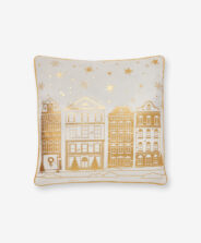 Pagalvės užvalkalas su namelių raštu – tai unikalus aksesuaras, primenantis Europos miestų kalėdinę atmosferą. Šviesiame fone auksiniai, spindintys miesteliai suteikia pagalvei prabangos ir pasakiškumo. Puikiai tinka bet kokiam interjerui, kuriame norisi magijos ir jaukumo. Kartu su kitomis aukso spalvos dekoracijoms jis sukuria darnią ir elegantišką visumą, o jo unikalus dizainas leis išsiskirti iš kitų pagalvių užvalkalų.