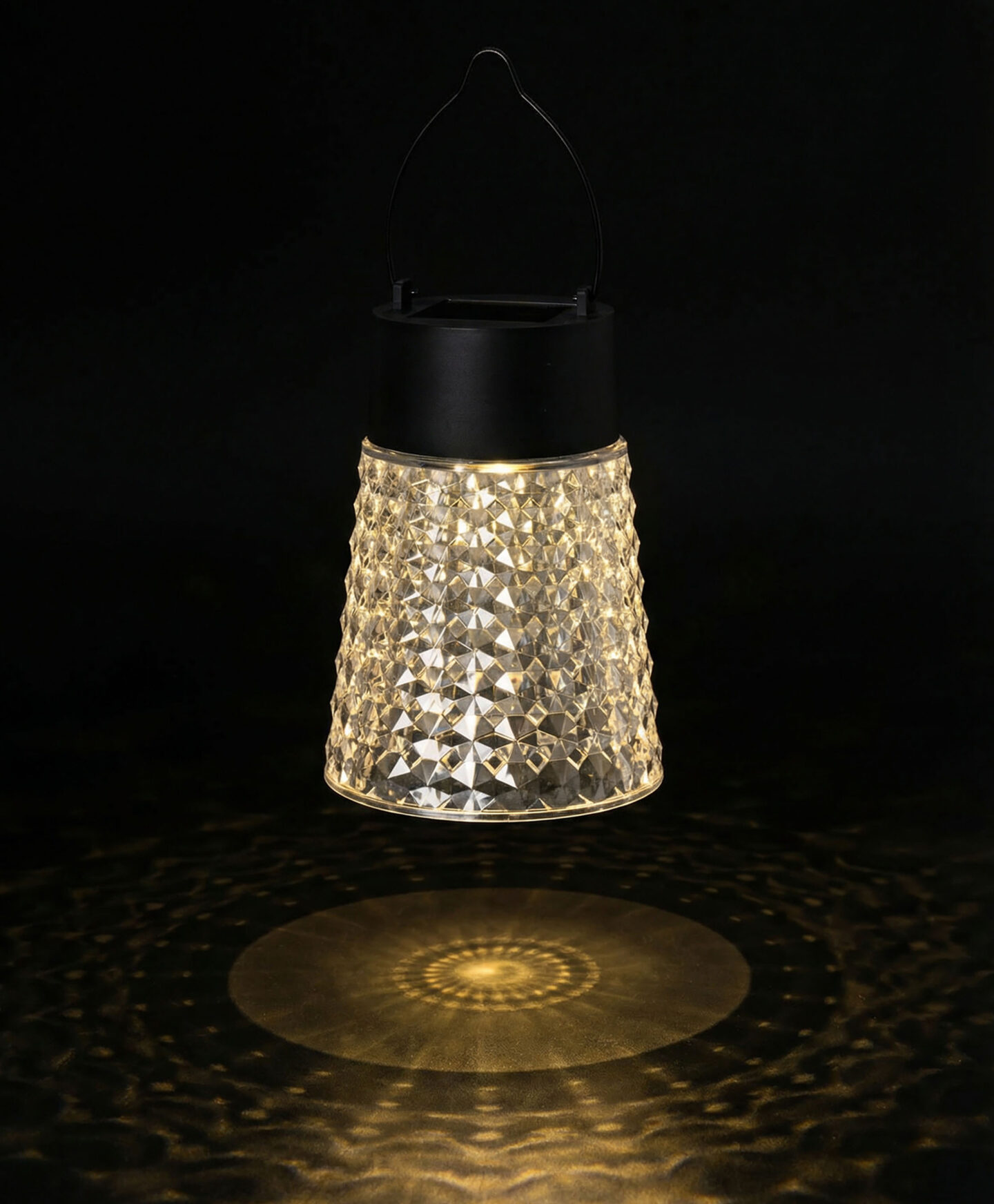 Pakabinama saulės energija maitinama lempa su kristaliniu gaubtu patrauks kiekvieno gražių aksesuarų mylėtojo dėmesį. Maitinama saulės energija per įmontuotą saulės panelę, todėl veikia be kabelių ir baterijų. Iš kristalų pagamintas gaubtas gražiai ir meniškai sklaido šviesą. Lempą papildo praktiška rankena, leidžianti ją pakabinti ant medžio šakos, strypo, po lubomis arba ant specialaus stovelio. Lempa automatiškai įsijungia sutemus ir išsijungia auštant, tad naktinis apšvietimas nereikalauja priežiūros.