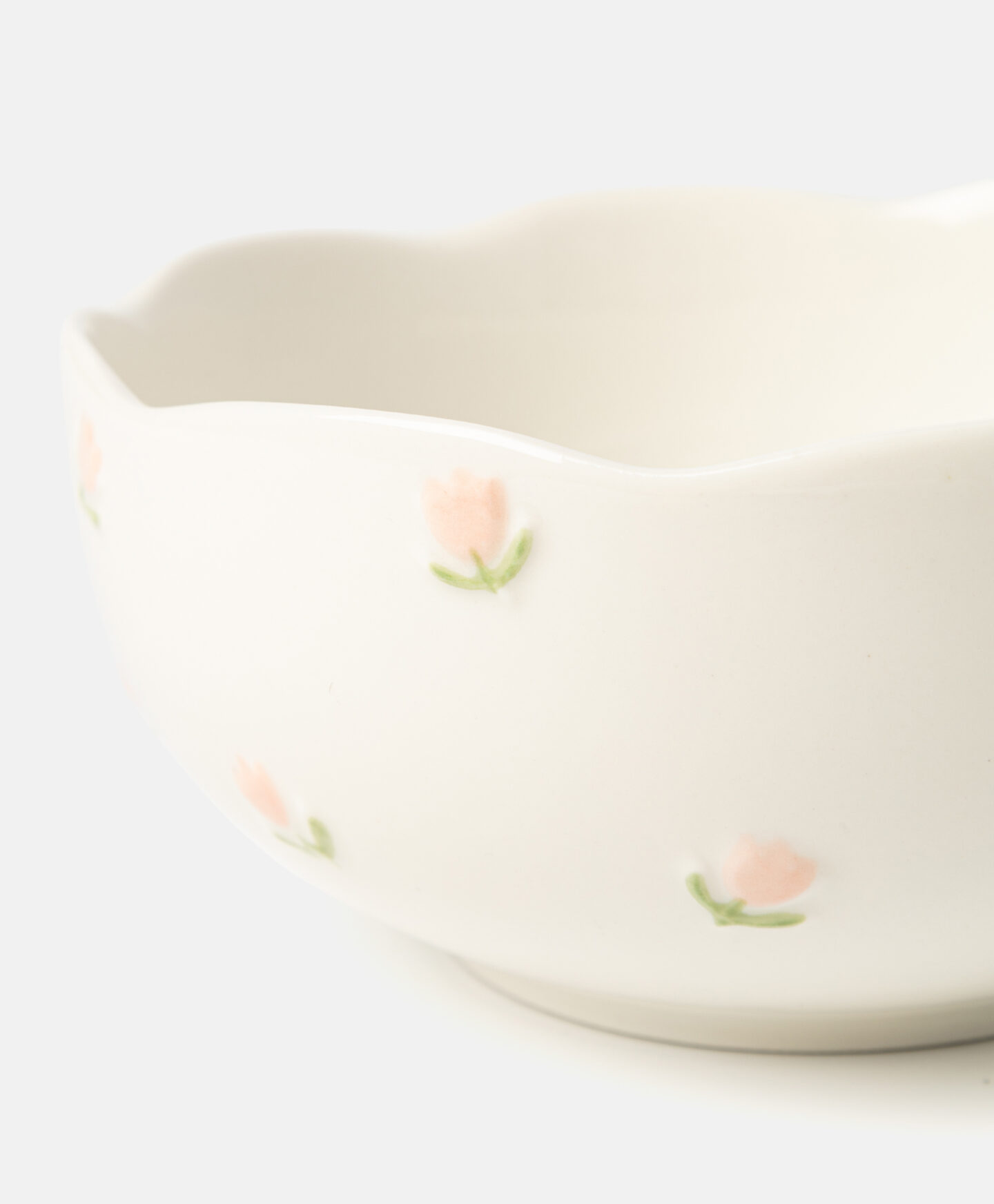 Porcelianinis dubenėlis su subtiliu tulpių raštu išsiskirs jūsų virtuvėje. Dėl dekoratyvinių netaisyklingos formos apvadų jis yra išties unikalus. Galima įsigyti derančių lėkščių ir puodelių.