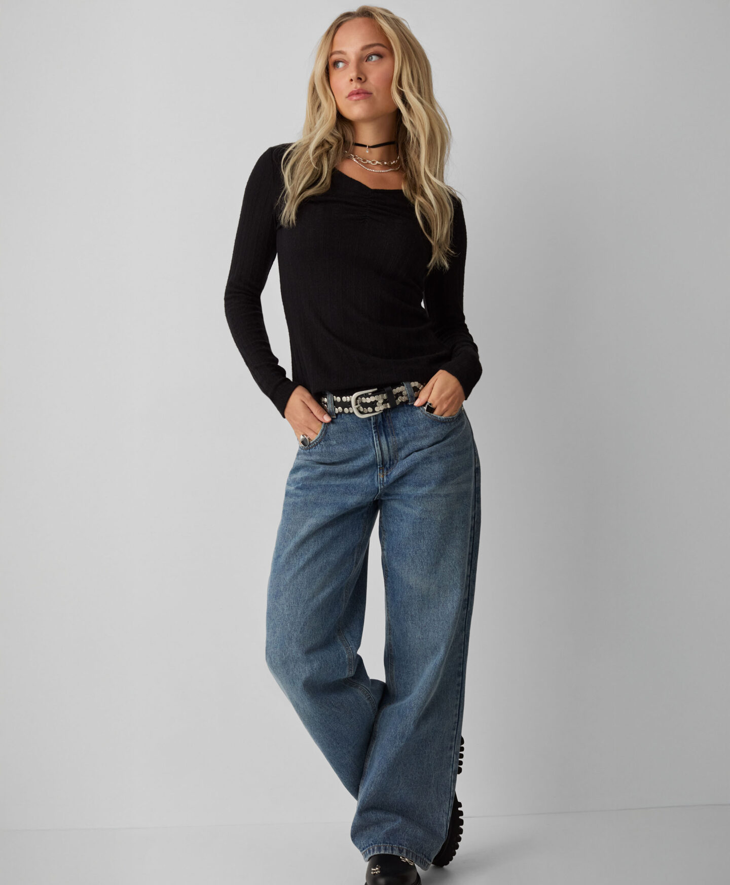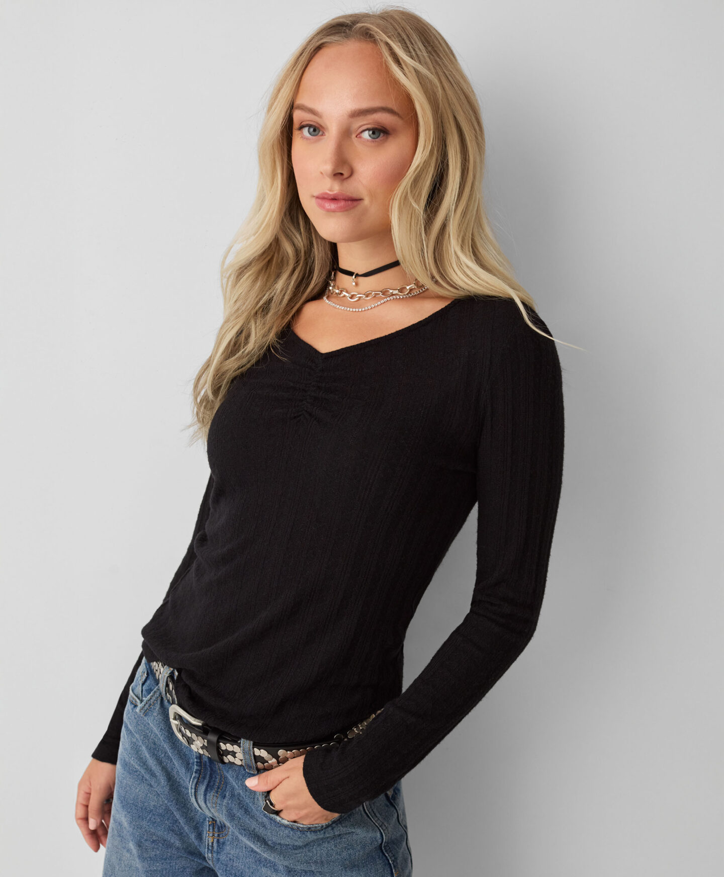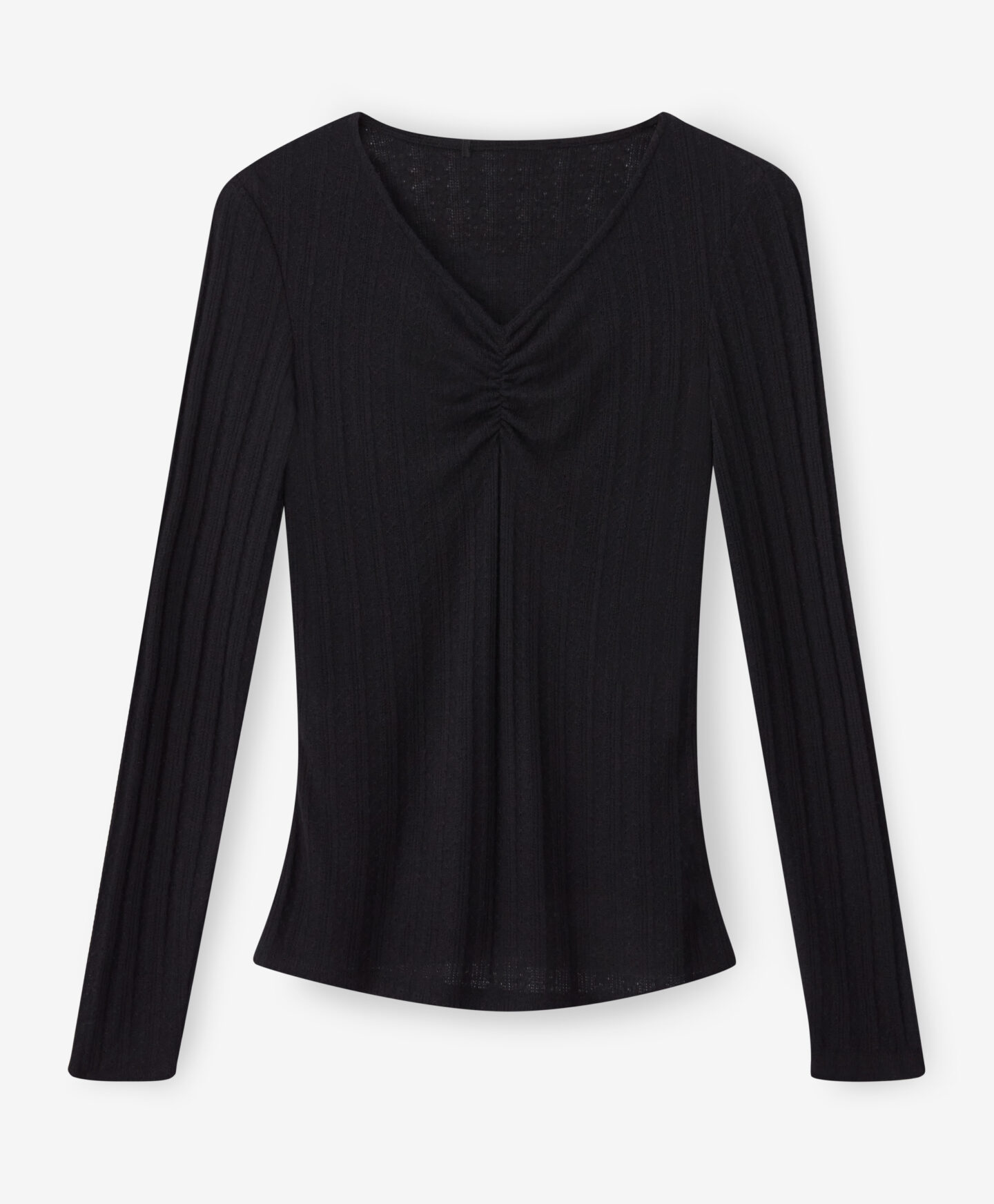 Prigludusi palaidinė ilgomis rankovėmis skirta klasikinio stiliaus mėgėjams. Vėsiomis dienomis ji puikiai tiks po laisvesniu švarkeliu ar megztiniu ir suteiks šilumos. Ties iškirpte esantis raukinukas yra elegantiškas akcentas, išryškinantis figūros privalumus. Dėl juodos spalvos palaidinė tinka prie bet kokių rūbų.