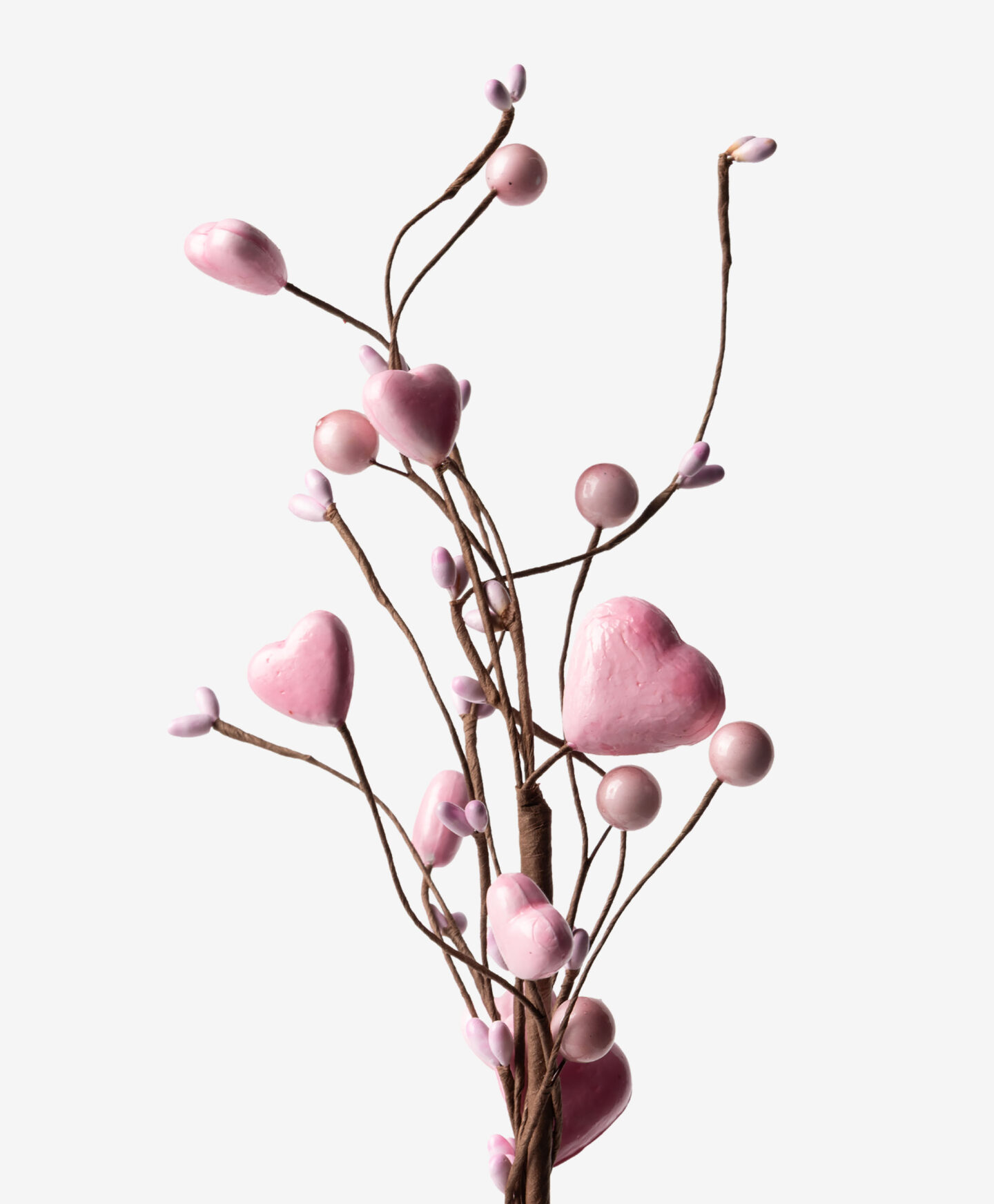 Dekoratyvinė rožinė šakelė leis sukurti išskirtinį Valentino dienos dekorą. Ji puikiai tinka puokštėms, vazoms ar stalui puošti. Lanksčios šakelės, dekoruotos širdelėmis ir perlais, suteiks elegancijos ir romantišką nuotaiką bet kuriam interjerui. Galima rinktis iš dviejų spalvų.