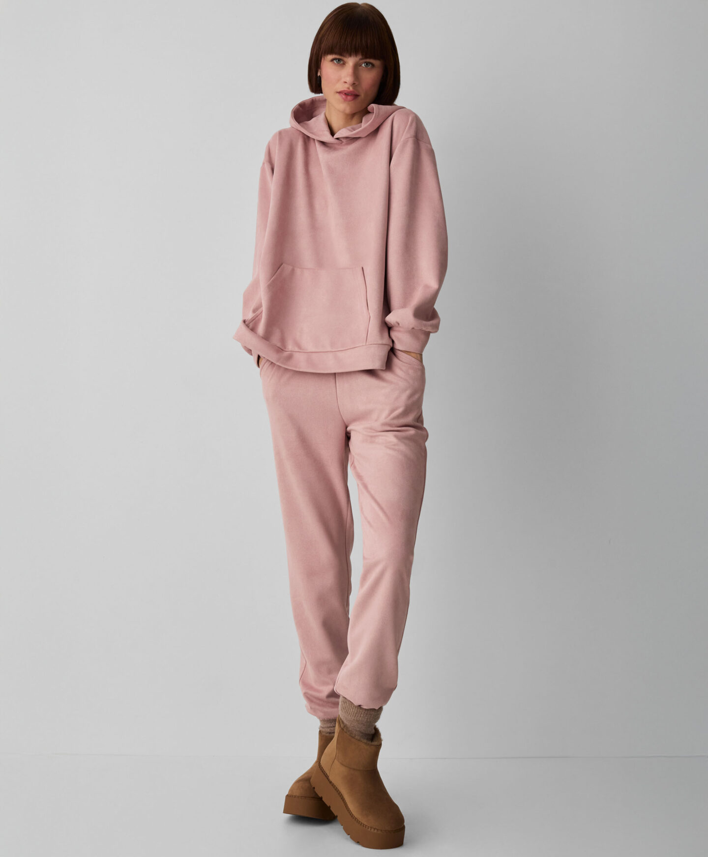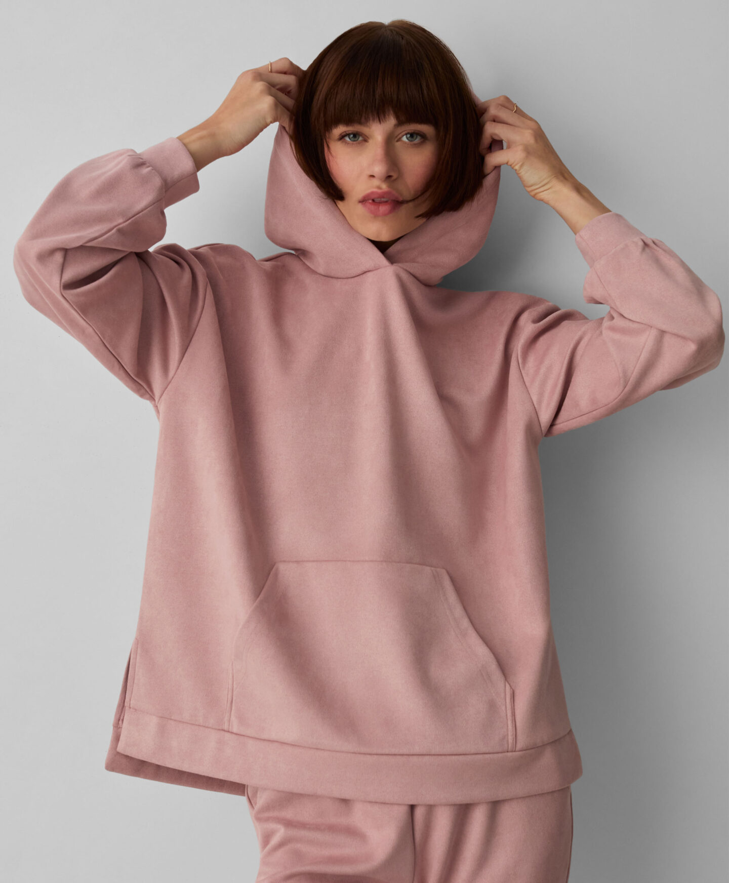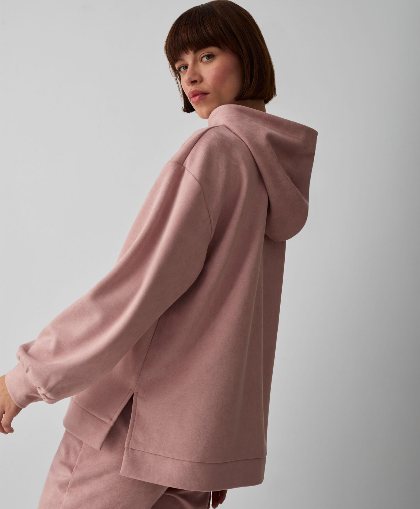Rožinis dirbtinės zomšos džemperis su gobtuvu suteiks patogumo ir šilumos vėsiomis dienomis. Jis ne tik patogus, bet ir stilingas. Švelnus audinys, apgalvotas dizainas ir elegantiškos spalvos padarys jį jūsų mėgstamiausiu šio rudens džemperiu! Jis puikiai dera su dirbtinės zomšos kelnėmis iš kolekcijos. Galima rinktis iš dviejų spalvų.