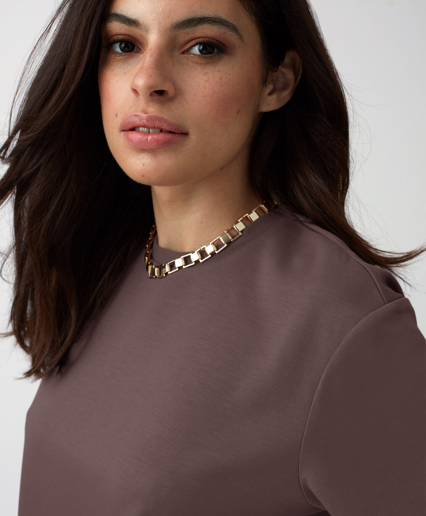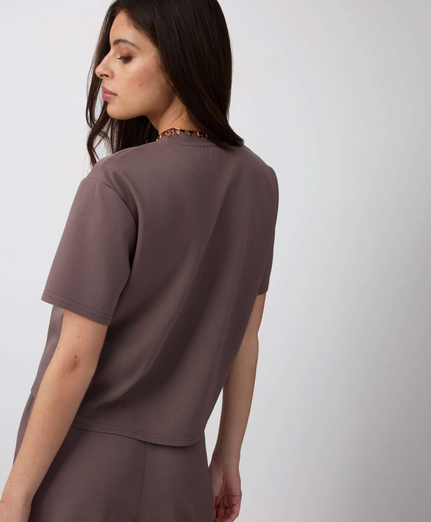 Rudi marškinėliai trumpomis rankovėmis yra universalus drabužis, kuris tinka prie bet kokio stiliaus. Subtili smėlio spalva puikiai papildo kitus atspalvius ir puikiai dera tiek prie laisvalaikio, tiek prie oficialesnės aprangos.
