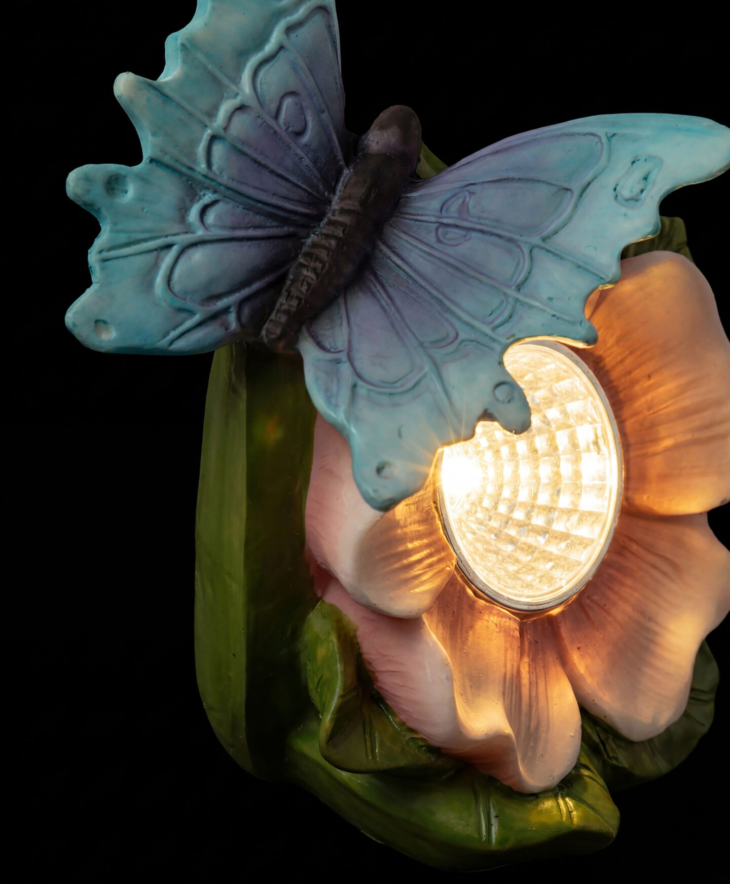 Saulės energija maitinama lempa – gėlė su drugeliu – unikali sodo dekoracija. Maitinama saulės energija per įmontuotą saulės panelę, todėl veikia be kabelių ir baterijų. Pavasariškas dizainas su subtilia gėle ir drugeliu patraukia dėmesį, švelni LED šviesa sukuria magišką atmosferą bet kuriame sode, balkone ar terasoje. Lempa automatiškai įsijungia sutemus ir išsijungia auštant, tad naktinis apšvietimas nereikalauja priežiūros. Galima rinktis iš įvairių raštų variantų.
